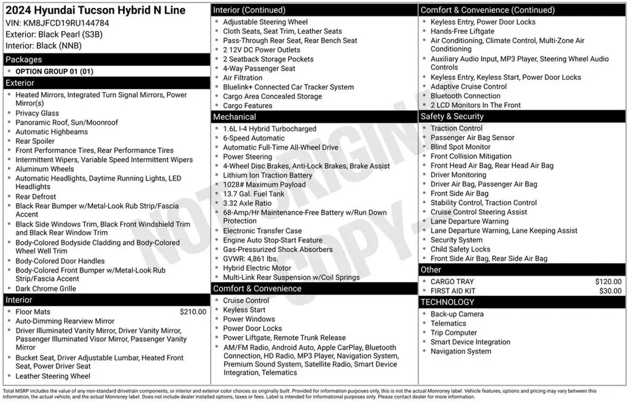 At Green Ford in Greensboro, NC, your peace of mind is everything. We know buying pre-owned is more than just selecting a vehicle"”it's placing your trust in us. That's why every used model on our lot is meticulously inspected, competitively priced, and comes with the comprehensive Green Ford Advantage. You'll enjoy our lifetime limited powertrain warranty, Two complimentary maintenance performed right here by our expert technicians. Need to drop off your vehicle? Take advantage of our complimentary pickup & delivery or Ford Mobile Service, where we'll come to you. At Green Ford, earning your confidence isn't just our goal"”it's the foundation of everything we do. Call today for details. *Local Trade*, GREEN CERTIFIED LIFETIME POWERTRAIN WARRANTY, Panoramic Sunroof, GPS, Navigation Sys, 10.25 Touch Screen, Blue Tooth, Blue Link Connected Services, N Line Sport Combination Seats, I4, 19 Unique Alloy Wheels, AM/FM radio: SiriusXM, Apple CarPlay & Android Auto, Exterior Parking Camera Rear, Front dual zone A/C, Power Liftgate, Power moonroof, Remote keyless entry. 2024 Hyundai Tucson Hybrid 2024 Hyundai Tucson Hybrid N Line Black Pearl Equipped with Option Group 01, I4, 19 Unique Alloy Wheels, AM/FM radio: SiriusXM, Apple CarPlay & Android Auto, Exterior Parking Camera Rear, Front dual zone A/C, Power Liftgate, Power moonroof, Remote keyless entry, 3.32 Axle Ratio, 4-Wheel Disc Brakes, 8 Speakers, ABS brakes, Air Conditioning, Alloy wheels, Auto High-beam Headlights, Auto-dimming Rear-View mirror, Automatic temperature control, Brake assist, Bumpers: body-color, Cargo Tray, Carpeted Floor Mats, Delay-off headlights, Driver door bin, Driver vanity mirror, Dual front impact airbags, Dual front side impact airbags, Electronic Stability Control, Emergency communication system, First Aid Kit, Four wheel independent suspension, Front anti-roll bar, Front Bucket Seats, Front Center Armrest, Front reading lights, Fully automatic headlights, Heated door mirrors, Heated Front Bucket Seats, Heated front seats, Illuminated entry, Low tire pressure warning, Navigation System, Occupant sensing airbag, Outside temperature display, Overhead airbag, Overhead console, Panic alarm, Passenger door bin, Passenger vanity mirror, Power door mirrors, Power driver seat, Power steering, Power windows, Radio data system, Radio: Bose Premium w/AM/FM/HD Audio System, Rear anti-roll bar, Rear reading lights, Rear seat center armrest, Rear side impact airbag, Rear window defroster, Rear window wiper, Security system, Speed control, Split folding rear seat, Spoiler, Sport Combination Seat Trim, Steering wheel mounted audio controls, Tachometer, Telescoping steering wheel, Tilt steering wheel, Traction control, Trip computer, Turn signal indicator mirrors, and Variably intermittent wipers *Vehicle must be 8 model years or newer and Under 80,000 miles to qualify for the Lifetime Powertrain Warranty, also excludes Commercial Sales, European Makes, Diesels, Modified and SVT vehicles. The price displayed is an internet only price. To obtain this sale price you must print out this ad and present it to the sales professional when you arrive at the dealership. All Green Ford/Lincon internet Prices include a $1000.00 discount for financing with Lincoln Financial or Ford Credit Services. To obtain this discount your credit must qualify for Lincoln Financial or Ford Credit Services Financing.Prices also include trade discount of $1000, to obtain this discount you must trade in a 2018 or newer vehicle with less than 100,000 miles.