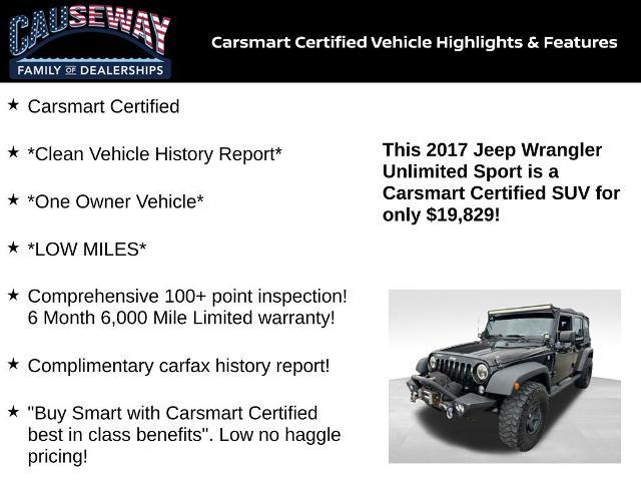 2017 Jeep Wrangler Unlimited Sport 4WD Black Clearcoat Legendary JK Capability, Open-Air Freedom, One-Owner Confidence Go anywhere, do anythingand look good doing it. This CarSmart Certified Wrangler Unlimited Sport pairs the proven 3.6L Pentastar V6 with a stout 5-Speed Automatic and confidence-inspiring 4WD, delivering the torque, traction, and durability the JK generation is famous for. Its a One Owner, Clean Vehicle History Report Jeep with LOW MILES (a Recent Arrival showing 50,067 miles below market average), inspected, warrantied, and priced with our low, no-haggle philosophy so you can hit the trail faster. Trail-Ready Capability Command-Trac 2-Speed Transfer Case with low range for rock, mud, and snow. High ground clearance and short overhangs for serious approach/departure angles. Skid-plate protection, heavy-duty suspension tuning, and stout axles engineered for adventure. Open-Air Freedom & Utility Iconic removable top and removable doors* deliver that true Jeep open-sky experience. Fold-down windshield* and modular body panelscustomize it your way. 4-Door Unlimited wheelbase: real rear-seat legroom plus generous cargo space for gear. Interior Tech & Comfort Supportive cloth seating with easy-clean surfaces built for everyday use. Steering-wheel audio/phone controls, available Uconnect infotainment*, Bluetooth*, and multiple power outlets for navigation, tunes, and trail cams. All-weather practicality: simple, durable cabin designed to shrug off sand, snow, and weekend messes. Safety & Driver Confidence Electronic Stability Control, Hill-Start Assist, Trailer-Sway Control, and 4-Wheel Disc Brakes help keep you sure-footed on- and off-road. Advanced front and side airbags and proven JK chassis strength for peace of mind. CarSmart Certified Advantages Comprehensive 100 Point Inspection 6 Month/6,000 Mile Limited Warranty (powertrain coverage) Complimentary CARFAX History Report Low, No-Haggle Pricing transparent, market-smart value Why This Wrangler? Black Clearcoat over the timeless JK silhouetteclean, sharp, and ready to outfit with your favorite wheels, tires, and armor. One Owner Clean History LOW MILES below market average = exceptional buy with long-term upside. Adventure starts now. This Wrangler Unlimited Sport is dialed in for daily driving and weekend trails alikedont miss it. Ask us how you can make money using our Causeway Referral Rewards Program! *Availability/features can vary by vehicle build. Please confirm exact equipment on this specific W