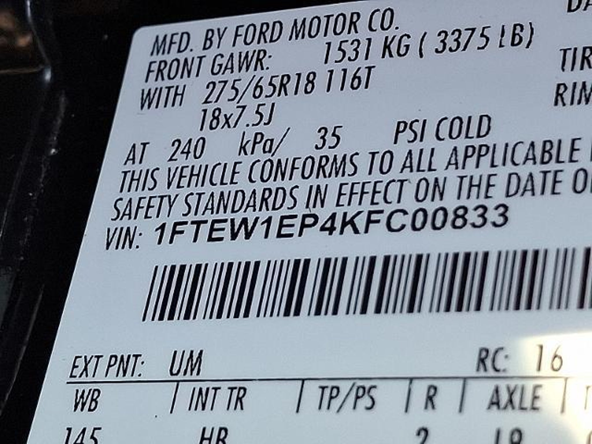 VIN 1FTEW1EP4KFC00833