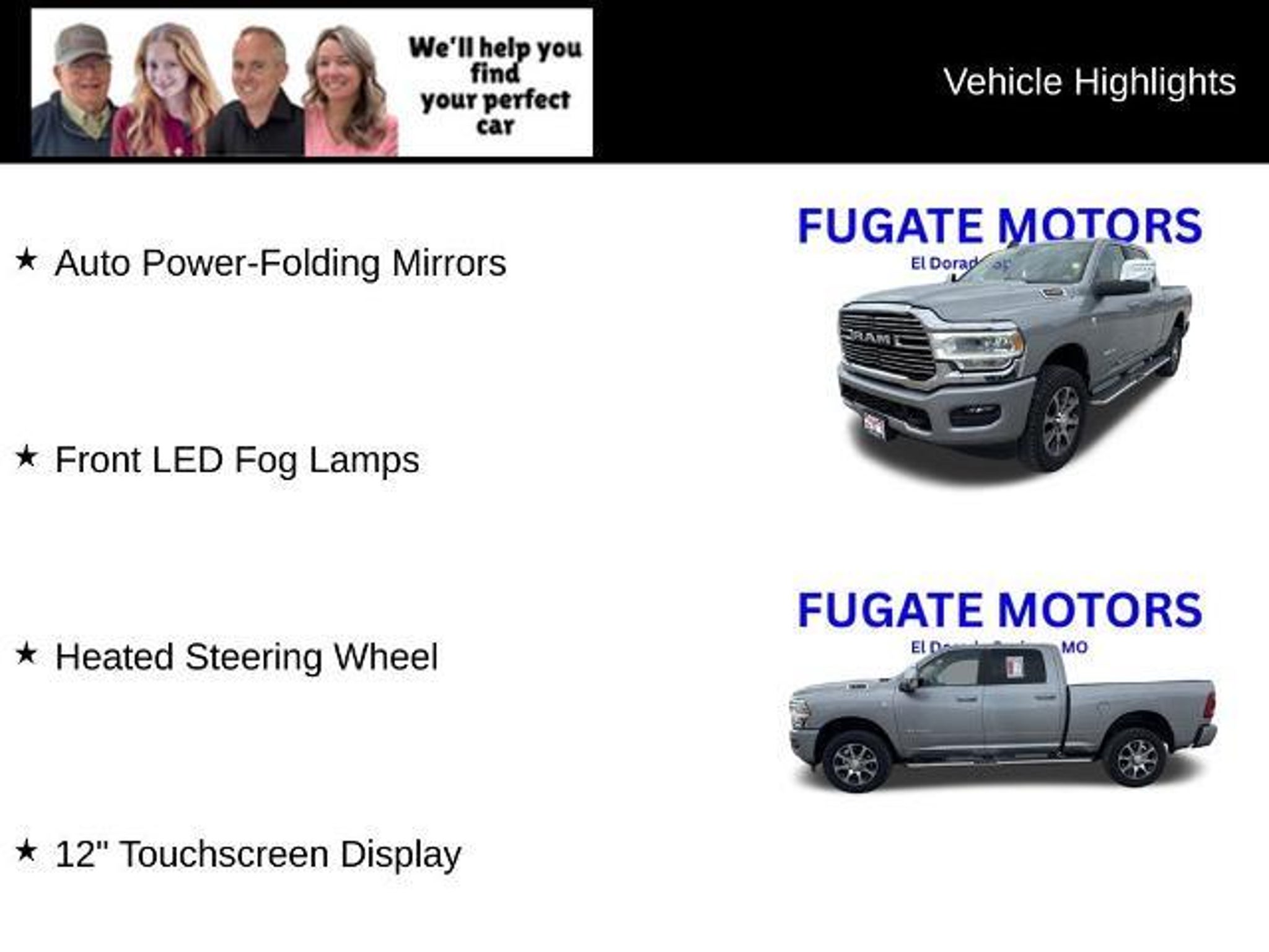 Factory Warranty! 6.7L Cummins Diesel. One owner local new car trade-in. Well cared for. Laramie with GREAT equipment including: 12 infotainment screen with factory navigation heated and cooled leather seats 5th wheel prep and much more! NO BUYER FEES! NO DOC FEES!! NO FEES!!! Since 1963 we have been serving El Dorado Springs Stockton Wheatland Bolivar Lebanon Warsaw Joplin Springfield Nixa Ozark Branson Kansas City Nevada Belton Harrisonville Raytown Lees Summit Blue Springs Fayetteville Tulsa and more!!!! Cold Weather Group (Engine Block Heater and MOPAR Winter Front Grille Cover) Heavy Duty Snow Plow Prep Group (220 Amp Alternator) Laramie Level 1 Equipment Group (12 Touchscreen Display 2nd Row In Floor Storage Bins 4G LTE Wi-Fi Hot Spot Alexa Built-In Apple CarPlay Auto Adjust In Reverse Exterior Mirrors Auto Dim Exterior Mirror Auto High Beam Headlamp Control Auto Power-Folding Mirrors Auto-Dimming Exterior Passenger Mirror Blind Spot & Cross Path Detection Chrome Exterior Mirrors Connected Travel & Traffic Services Connectivity - US/Canada Disassociated Touchscreen Display Exterior Mirrors Courtesy Lamps Exterior Mirrors w/Heating Element Exterior Mirrors w/Memory Exterior Mirrors w/Supplemental Signals Foam Bottle Insert (Door Trim Panel) For Details Visit DriveUconnect.com For More Info Call Forward & Reverse Utility Lights Front LED Fog Lamps Global Telematics Box Module (TBM) Google Android Auto GPS Antenna Input GPS Navigation HD Radio Integrated Voice Command w/Bluetooth LED Reflector Headlamps Mirror Running Lights Off-Road Information Pages ParkSense Front/Rear Park Assist System Power Adjust Mirrors Power Adjustable Convex Aux Mirrors Power Adjustable Pedals w/Memory Power Heated Fold Telescopic Mirrors w/Memory Power Telescoping Mirrors Radio: Uconnect 5 Nav w/12.0 Display Radio/Driver Seat/Mirrors/Pedals Memory Rain Sensitive Windshield Wipers Rear Power Sliding Window Rear Window Defroster Remote Tailgate Release Selectable Tire Fill Alert SiriusXM Radio Service SiriusXM w/360L and Trailer Tow Pages) Protection Group (Tow Hooks) Quick Order Package 2HH Laramie 10 Speakers 115V Auxiliary Rear Power Outlet 2 Way Rear Headrest Seat 3.73 Axle Ratio 4 Way Front Headrests 4-Wheel Disc Brakes 5th Wheel/Gooseneck Towing Prep Group ABS brakes Active Noise Control System Air Conditioning Alloy wheels AM/FM radio: SiriusXM with 360L Anti-Spin Differential Rear Axle Apple CarPlay/Android Auto Auto-dimming Rear-View mirror Automatic temperature control Brake assist Bumpers: body-color Chrome Flat Cab-Length Side Steps Compass Delay-off headlights Driver door bin Driver vanity mirror Dual front impact airbags Dual front side impact airbags Electronic Stability Control Electronically Controlled Throttle Front anti-roll bar Front Center Armrest w/Storage Front dual zone A/C Front License Plate Bracket Front reading lights Front Seat Back Map Pockets Fully automatic headlights Garage door transmitter Heated door mirrors Heated Front Seats Heated front seats Heated Steering Wheel Heated steering wheel Illuminated entry Leather steering wheel Leather Trim 40/20/40 Bench Seat Low tire pressure warning Manufacturers Statement of Origin MOPAR Front & Rear Rubber Floor Mats Navigation System Occupant sensing airbag Outside temperature display Overhead airbag Overhead console Panic alarm ParkView