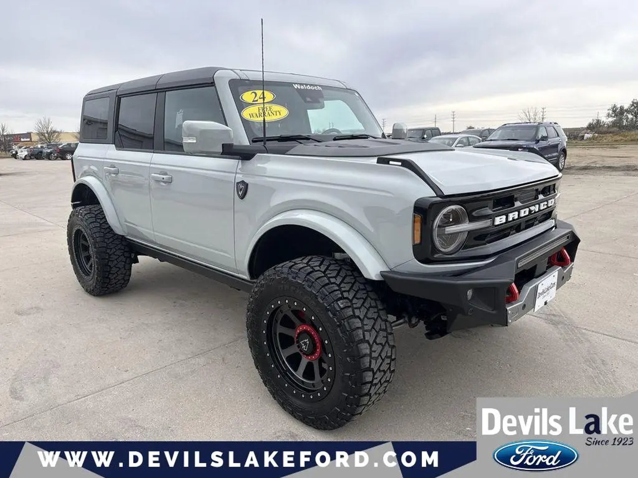 Summary Buy and Drive with Confidence - Devil's Lake Worry Free Guarantee - 3 Day / 300 Mile Return or Exchange, 3 Month / 3,000 mile coverage on powertrain, brakes, bulbs, batteries and tires $0 Deductible. 750 4.8 STARS POSITIVE REVIEWS ON GOOGLE. See why people from all over the country do business with us! Serving North Dakota for over 100 years! Fast, Easy and Great Vehicles. Call Jody Cournoyer at at Devils Lake Ford for more information or to schedule a test drive. Vehicle Details Discover an exceptional 2024 Ford Bronco Outer Banks with a Waldock upfit with only 481 miles "” a low-mileage gem located in Devils Lake, ND. This 4WD Ford Bronco is equipped with a responsive 4-cylinder 2.3L gasoline engine that delivers a balanced mix of efficiency and capability, ideal for daily driving and weekend adventures. The Outer Banks trim blends rugged capability with refined comfort, featuring modern connectivity and advanced safety options. This Ford Bronco boasts a CARFAX 1-Owner history and a CARFAX Clean Report for added confidence. Safety and convenience features include Rear Parking Sensors and Cross-Traffic Alert to help navigate tight spots and busy parking lots. Seamless smartphone integration is available through Android Auto, keeping your apps, navigation, and music at your fingertips while you explore. With only 481 miles, this Ford Bronco offers near-new condition without the new-vehicle price, and we are offering the best price in the area. Whether you're drawn to off-road trails or comfortable daily commuting, this low-mileage 2024 Ford Bronco Outer Banks provides a compelling combination of performance, technology, and value. Located in Devils Lake, ND, this Ford Bronco is ready for immediate test drives and inspection. Contact us today to schedule your appointment and secure the best-priced, low-mileage 2024 Ford Bronco Outer Banks in town. Equipment Carry lots of cargo while your passengers are comfortable. When you encounter slick or muddy roads, you can engage the four wheel drive on it and drive with confidence. This unit has automated speed control that adjusts to maintain a safe following distance, enhancing highway driving convenience. It comes equipped with Android Auto for seamless smartphone integration on the road. Apple CarPlay: Seamless smartphone integration for this model - stay connected and entertained on the go! Protect it from unwanted accidents with a cutting edge backup camera system. Good News! This certified CARFAX 1-owner vehicle has only had one owner before you. Our dealership has already run the CARFAX report and it is clean. A clean CARFAX is a great asset for resale value in the future. Maintaining a stable interior temperature in the vehicle is easy with the climate control system. This 1/2 ton suv's Cross-Traffic Alert: Safeguarding you from unexpected traffic when reversing. It features cruise control for long trips. This vehicle has a 4 Cyl, 2.3L high output engine. Enjoy the tried and true gasoline engine in this 1/2 ton suv. This Ford Bronco features a hands-free Bluetooth phone system. This Ford Bronco is pure luxury with a heated steering wheel. Help alleviate lower back pain with the driver seat lumbar support in the Ford Bronco. The installed navigation system will keep you on the right path. An off-road package is installed on the vehicle so you are ready for your four-wheeling best. The rear parking assist technology on this vehicle will put you at ease when reversing. The system alerts you as you get closer to an obstruction. Packages Equipment Group 314A High/lux Package: 18 Bright Machined Aluminum Wheels; 3.73 Axle Ratio; Dual Smart Charging USB Ports; 2.3L EcoBoost I-4 Engine; Evasive Steering Assist; Heated Steering Wheel; 5 920 lbs GVWR; Adaptive Cruise Control; Additional Sound Deadening; Information on Demand Panel; Wireless Charging Pad; B&O Sound System by Bang and Olufsen; Front Parking Sensors; 10-Speed Automatic Transmission; 360-Degree Camera; P255/70R18 A/T Tires; Universal Garage Door Opener; Heated Leather-Trimmed/vinyl Bucket Seats; Sideview Mirrors Carbonized Gray Molded-In-color Hard Top Trailer Tow Package Cactus Gray **Equipment listed is based on original vehicle build and subject to change. Please confirm the accuracy of the included equipment by calling the dealer prior to purchase.** Additional Information Call Jody Cournoyer at at Devils Lake Ford for more information or to schedule a test drive.