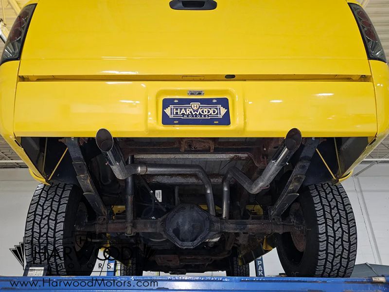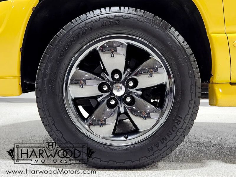 The only engine available in the Rumble Bee is a 5.7 liter HEMI V8 making a rather stout 345 horsepower. This engine is legendary today for durability and power, and it makes the somewhat chunky Rumble Bee feel quick around town. This one remains completely stock mechanically, so it runs like it should and will be easy to service in the future. All the original engine bay plastic is in good order and theres plenty of evidence of proper maintenance over the past two decades. It starts easily, idles nicely, and works like youd expect-no hassles. Chryslers tough 4-speed automatic transmission handles the gear changes and shifts smoothly when youre being gentle and firms up when you punch it, and with 3.92 gears out back, it leaps off the line pretty aggressively. The undercarriage is original and a little grungy, but theres no rot in the critical areas, the body mounts are solid, and theres a newer Flowmaster-style exhaust system that splits into twin pipes that exit under the rear roll pan-it sounds wicked. 4-wheel disc brakes with ABS were standard equipment and those pretty 20-inch wheels are the factory alloys with a fresh "black chrome" powdercoat finish that really sets this truck apart. Tires are massive 275/60/20 off-road radials that complete the look.