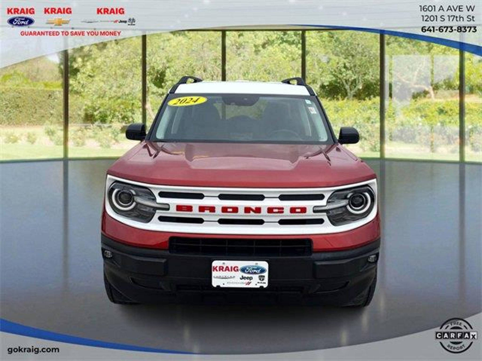 CARFAX One-Owner. 25/29 City/Highway MPGBACK UP CAMERA, HEATED SEATS, WELL MAINTAINED, LOCAL TRADE IN, 3.80 Axle Ratio, 4-Wheel Disc Brakes, 6 Speakers, ABS brakes, Air Conditioning, Alloy wheels, AM/FM radio: SiriusXM, AM/FM Stereo, Auto High-beam Headlights, Automatic temperature control, Brake assist, Cargo Management System, Compass, Delay-off headlights, Driver door bin, Driver vanity mirror, Dual front impact airbags, Dual front side impact airbags, Electronic Stability Control, Emergency communication system: SYNC 3 911 Assist, Equipment Group 250A, Four wheel independent suspension, Front anti-roll bar, Front Bucket Seats, Front Center Armrest, Front fog lights, Front License Plate Bracket, Front reading lights, Fully automatic headlights, Heated door mirrors, Heated Front Seats, Heritage Convenience Package, Illuminated entry, Knee airbag, Low tire pressure warning, Occupant sensing airbag, Outside temperature display, Overhead airbag, Overhead console, Panic alarm, Passenger door bin, Passenger vanity mirror, Plaid Cloth Front Bucket Seats, Power door mirrors, Power steering, Power windows, Premium Wrapped Steering Wheel, Radio data system, Rear anti-roll bar, Rear Parking Sensors, Rear reading lights, Rear seat center armrest, Rear window defroster, Rear window wiper, Remote keyless entry, Security system, SiriusXM, Speed control, Speed-sensing steering, Speed-Sensitive Wipers, Split folding rear seat, Steering wheel mounted audio controls, SYNC 3 Communications & Entertainment System, Tachometer, Telescoping steering wheel, Tilt steering wheel, Traction control, Trip computer, Universal Garage Door Opener (UGDO), Variably intermittent wipers, Wheels: 17 Oxford White-Painted Aluminum, Wireless Charging Pad.Hot Pepper Red Metallic Tinted Clearcoat 2024 Ford Bronco Sport Heritage 4WD 8-Speed Automatic 1.5L EcoBoostAt Kraig Ford CDJR our vast selection of Pre-Owned vehicles along with competitive pricing and financing options equals great deals and savings for you!Kraig Ford CDJR is a family owned dealership and that is portrayed in the small town atmosphere of the dealership. The owner of the dealership, Craig Ford, is a veteran of the U.S. Army and proudly supports our troops and veterans.