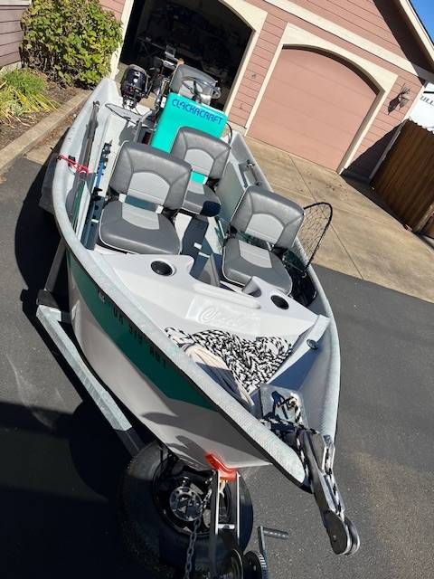 This 2020 Clackacraft Magnum Power Drifter is a like-new, 17-foot fiberglass powerboat built in Clackamas, Oregon. Designed for versatility and stability on rivers or lakes, its powered by a low-hour 35HP Tohatsu jet and complemented by an 8HP Tohatsu kicker motor for added reliability. The layout features a center console with a swivel helm seat and three additional swivel passenger seats, each with under-seat storage. Outfitted with Garmin electronics, navigation lights, a bilge pump, anchor, oars, and rod holders, this boat is fully equipped and ready for the water. The included trailer features a swing-away tongue, custom wheels, and a matching spare tire. Health forces sale an excellent opportunity to own a nearly new Clackacraft built for serious anglers and recreational boaters alike.
