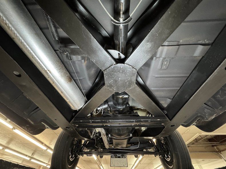 Spotless conditions prevail underneath where an X-frame takes center stage. Drum brakes are found at all four wheels and a single exhaust flows through a stock style muffler, finding the atmosphere through a straight pipe out back. Suspension includes a transverse leaf spring in front and leaf springs in the back.