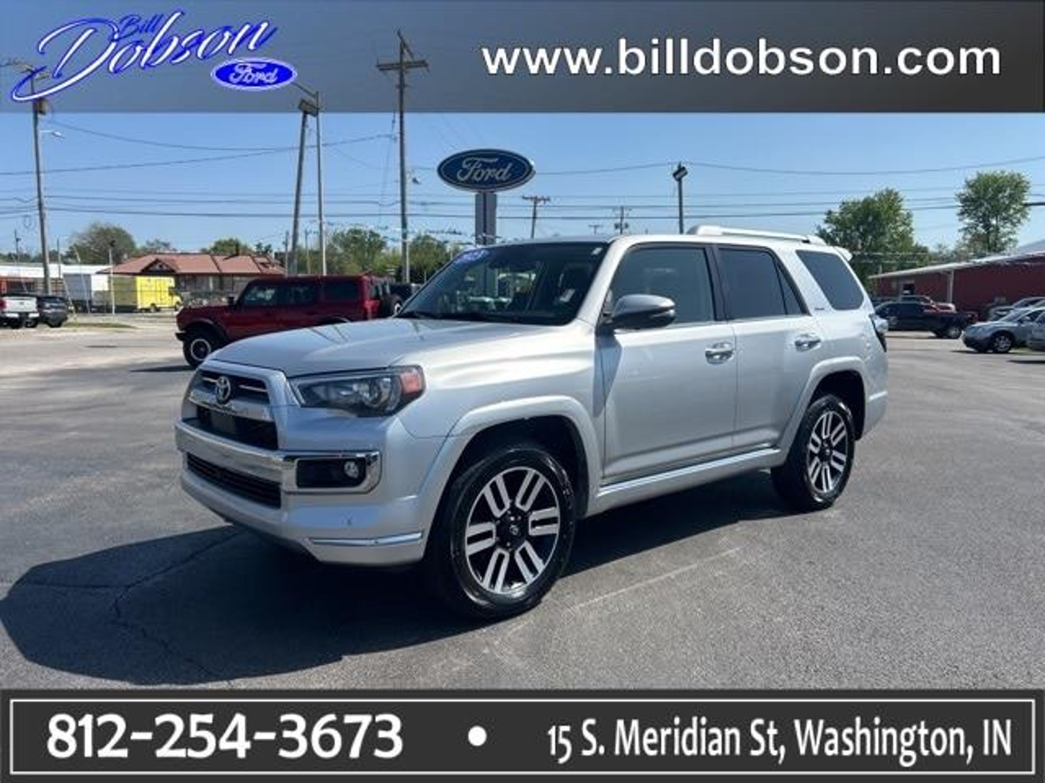 2023 Classic Silver Metallic Toyota 4Runner Limited 5-Speed with ECT 4.0L V6 DOHC 24V 4WD CARFAX One-Owner. Clean CARFAX. Streaming Music, Diagnostic Alerts, USB Charging ports, Cruise Control, Backup Camera. Priced below KBB Fair Purchase Price! At Bill Dobson Ford we believe in MARKET VALUE PRICING all vehicles in our inventory. We use real-time Internet price comparisons to constantly adjust prices to provide ALL BUYERS The BEST VALUE possible. We do not mark them up, to mark them down! We utilize state-of-the-art technology to constantly monitor pricing trends in order to offer our shoppers the best competitive pricing and value. Our entire team is committed to helping you buy a car the way we would want to buy a car! We sell and service all makes and models of Pre-owned / Used Vehicles Used Cars, Used Trucks, Used Sport Utility, 10K under used cars, Ford, Chevrolet/Chevy, Honda, Toyota, Porsche, Land Rover, Jaguar, INFINITI, Audi, Nissan, Mazda, Hyundai, Chrysler, Jeep, Dodge, Ram, SRT, Mitsubishi, Lexus, Kia, Volkswagen, Mini, BMW, Mercedes, Fiat, Volvo, GMC, Cadillac, Lincoln as well as other brands. Proudly serving these areas Indiana, Montgomery, Vincennes, Loogootee, Bloomfield, Petersburg, Odon, Plainville, Elnora, Linton & Wheatland. A Dobson Deal is a Better Deal!!!! Call 812-618-1647.