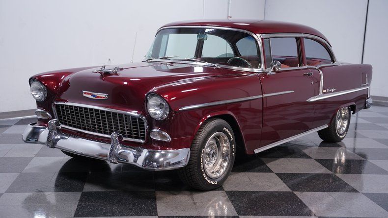 How would you like to pull an absolute boulevard showstopper into your garage? It's a fitting description for this 1955 Chevrolet Bel Air. With just a little more than 5300 miles on its build, this vintage Chevy is guaranteed to turn heads wherever it may go. Its Black Cherry Metallic paint is a departure from the color scheme we often see on this model, and it looks great in this setting, with a bright shine and no visible dents or dings to be found. The accompanying chrome and brightwork are also in good form, and the collection of badging that helps define this vintage Chevy's upper-tier status is securely in place and looking sharp. And check out the stance! It's slightly lowered in front, but nothing too drastic as to detract from the Bel Air's already striking appearance or mess with ground clearance.