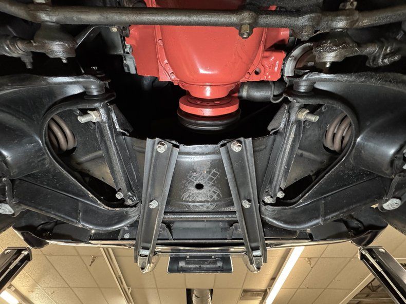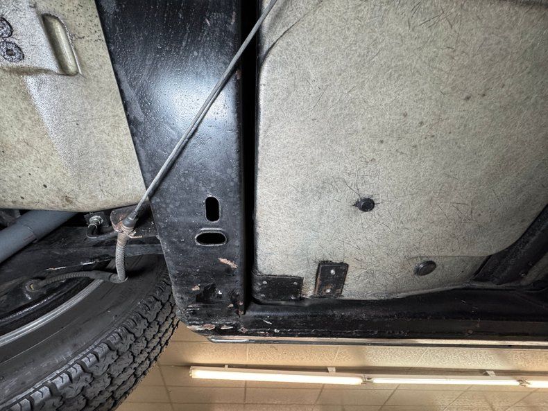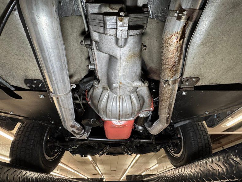 Clean underneath with the only diversion being some oil drift. Newer brakes are onboard and they are power drums at all four wheels where the tires have a mid 2019 date code. The Gardner dual exhaust system runs through their stock style mufflers stenciled with Off Road Assy as original, and exiting as noted through the valance. Suspension consists of coil springs up front and the rear has a frame anchored three link system with transverse strut rods and leaf spring.
