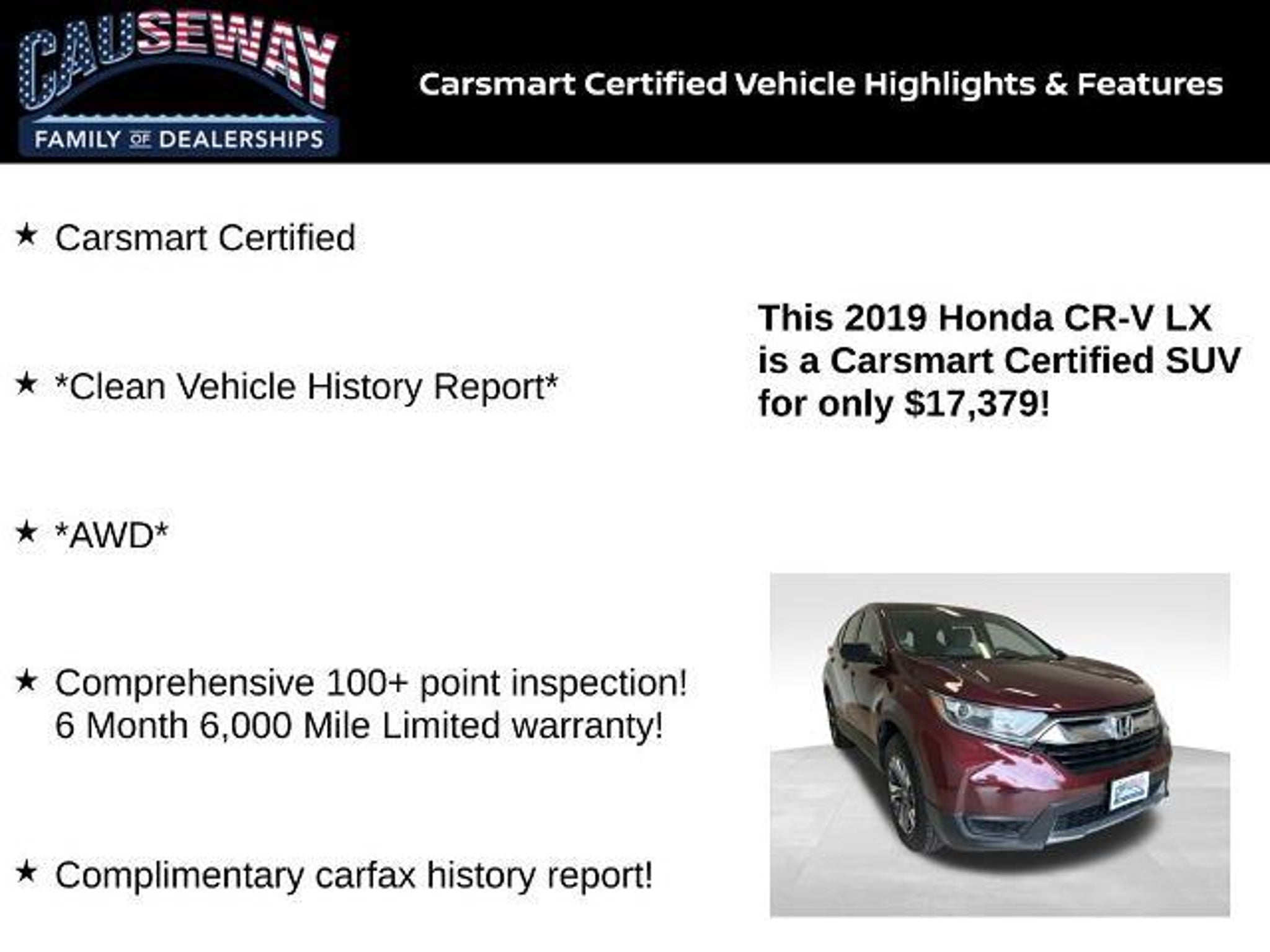 2019 Honda CR-V LX AWD Molten Lava Pearl AWD â CVT â 2.4L i-VTEC 4-Cylinder Carsmart Certified â Clean Vehicle History Report â Comprehensive 100 Point Inspection â 6-Month/6,000-Mile Limited Warranty â 25/31 City/Highway MPG Turn everyday errands into easy adventures in this Molten Lava Pearl 2019 CR-V LX AWDHondas benchmark compact SUV known for rock-solid reliability, roomy versatility, and wallet-friendly efficiency. Why Youll Love It Confident All-Wheel Drive: Seamlessly sends traction where you need it for year-round confidence. Smooth & Efficient Power: Proven 2.4L DOHC i-VTEC with a refined CVT delivers responsive acceleration and up to 31 MPG highway. Clean History Certified: Comes Carsmart Certified with a clean CARFAX and a thorough 100 point inspection for peace of mind. Everyday Versatility: Flat cargo floor, 60/40 split rear seat, and ~39 cu ft cargo space (up to ~75.8 cu ft with seats folded) make road trips and Costco runs a breeze. Comfort & Technology Driver-friendly cockpit with excellent visibility and supportive seating Bluetooth HandsFreeLink, USB audio, and steering-wheel audio/cruise controls Multi-Angle Rearview Camera for stress-free parking Automatic climate control, power windows/locks, remote keyless entry Safety & Stability Vehicle Stability Assist with traction control 4-wheel ABS disc brakes, tire pressure monitoring, advanced airbag system Daytime running lights and rearview camera enhance confidence in tight spaces Carsmart Certified Benefits Comprehensive 100 point inspection 6 Month/6,000 Mile Limited Warranty (powertrain) Complimentary CARFAX history report Available extended protection and low no-haggle pricing Key Specs Engine: 2.4L I4 DOHC 16V i-VTEC Drivetrain: AWD Transmission: CVT EPA: 25/31 MPG (City/Highway) Color: Molten Lava Pearl This CR-V LX checks every boxefficient, spacious, safe, and certified. Schedule your test drive today and see why CR-V remains the class standard. Ask us how you can make money using our Causeway Referral Rewards Program!