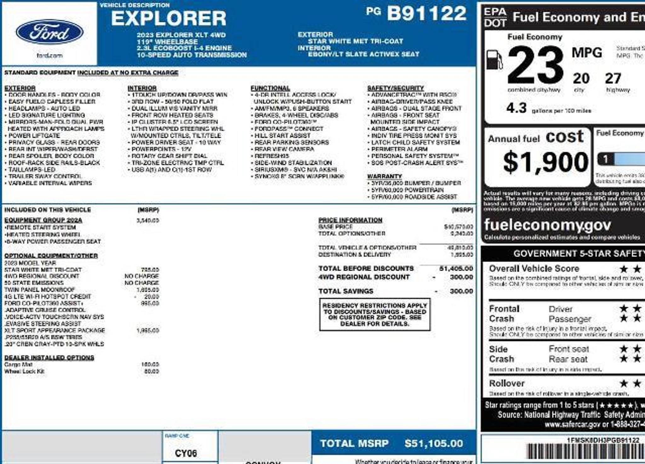 Heated Seats, 3rd Row Seat, Sunroof, NAV, Rear Air, Power Liftgate, 4x4, Quad Seats, Turbo, XLT SPORT APPEARANCE PACKAGE, FORD CO-PILOT360 ASSIST, TRANSMISSION: 10-SPEED AUTOMATIC, TWIN PANEL MOONROOF, EQUIPMENT GROUP 202A KEY FEATURES INCLUDE Third Row Seat, 4x4, Quad Bucket Seats, Power Liftgate, Rear Air. Ford XLT with Star White Metallic Tri-Coat exterior and Ebony/Light Slate interior features a 4 Cylinder Engine with 300 HP at 5500 RPM*. OPTION PACKAGES EQUIPMENT GROUP 202A SecuriCode Keyless Entry Keypad, Acoustic-Laminated Front Side Windows, Remote Start System, Heated Steering Wheel, LED Fog Lamps, silver-painted front skid plate elements, XLT SPORT APPEARANCE PACKAGE carbonized gray-painted grille bars and mesh insert, liftgate applique, lower body side cladding insert, skid plate elements, carbonized gray EXPLORER badge on hood, stretch diamond instrument panel appliques, ebony/light slate seats w/medium slate contrast stitching in all rows, unique light slate door-trim panel insert w/contrast stitching and sideview mirrors w/gloss black caps, Wheels: 20 10-Spoke Carbonized Gray-Painted, Tires: P255/55R20 AS BSW, Dual Chrome Exhaust Tips, TWIN PANEL MOONROOF, FORD CO-PILOT360 ASSIST Speed Sign Recognition, Voice-Activated Touchscreen Navigation System, pinch-to-zoom capability, SiriusXM Traffic and Travel Link, Note: SiriusXM Traffic and Travel Link includes a, SiriusXM Traffic and Travel Link service is not available in Alaska or Hawaii, After your trial period ends, Sirius XM audio and data services each require a subscription sold separately, or as a package, by SiriusXM Radio Inc, See SiriusXM customer agreement for complete terms at www.siriusxm.com, All fees and programming subject to change, Trial subscriptions not available in Alaska and Hawaii, Evasive Steering Assist, Intelligent Adaptive Cruise Control, stop-and-go and lane centering, TRANSMISSION: 10-SPEED AUTOMATIC (STD). WHY BUY FROM US At Rick Ridings Ford we understand that your vehicle purchase is one of the biggest purchases you will make. Were here to make that process as easy and fun as possible. We cant wait to hear from you. Horsepower calculations based on trim engine configuration. Please confirm the accuracy of the included equipment by calling us prior to purchase.