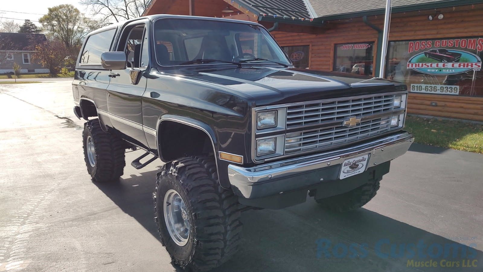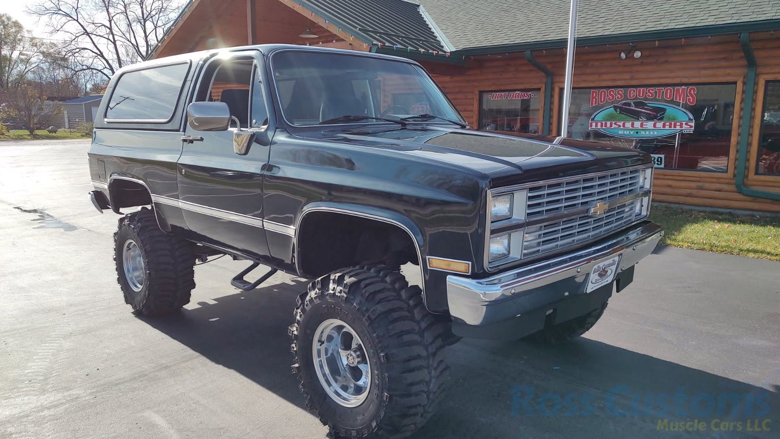 Under the hood we have the original 350, factory AC, power steering, power disc brakes, factory exhaust manifolds into 2 1/2 inch exhaust with stainless muffler and dual tailpipes out the back, manual 4 speed trans, brand new 6 inch Rough Country lift, all springs - no blocks, new shocks, new drive shafts.