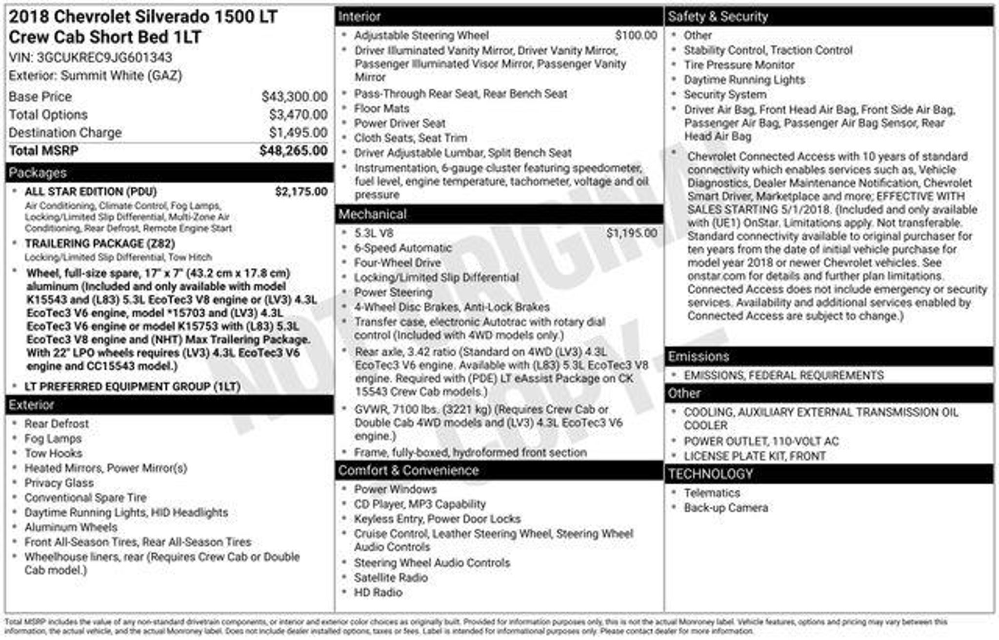 6-Speed Automatic Electronic with Overdrive, 4WD, Black Cloth, 110-Volt AC Power Outlet, All Star Edition, AM/FM radio: SiriusXM, CD player, Dual-Zone Automatic Climate Control, Electric Rear-Window Defogger, HD Radio, Radio data system, Radio: AM/FM 8 Diagonal Color Touch Screen, Remote Vehicle Starter System, SiriusXM Satellite Radio, Thin Profile LED Fog Lamps, Trailering Package. Priced below KBB Fair Purchase Price! CARFAX One-Owner. 2018 Chevrolet Silverado 1500 LT LT1 4WD 6-Speed Automatic Electronic with Overdrive EcoTec3 5.3L V8 Summit White Awards: * 2018 KBB.com 10 Most Awarded Brands The BIG QUESTION is why buy from Corwin Ford Lincoln Republic. Corwin is a family owned and operated business. We have been in business for over 100 years. Our select Certified inventory takes the risk out of buying a car at the same live market price. All our preowned vehicles get 172 point inspection by certified technicians. You get a Vehicle History Report. Now that's a deal! What is Live Market Pricing? We utilize a 3rd party company, Kelly Blue Book, to help us price preowned vehicles. To not be just the best price, but the best value price. Which in turn takes the haggle out of buying a car. Saving you TIME and MONEY. Remember if it does not say Corwin on the back of the car, you've probably paid to much. We proudly serve Republic, Ozark, Nixa, Fair Grove, Pleasant Hope, Billings, Clever, Springfield, Aurora, Branson, Marshfield, and the greater Springfield Missouri area. Corwin Price does not include Admin fee of $604.00 or optional Data Dots $299.
