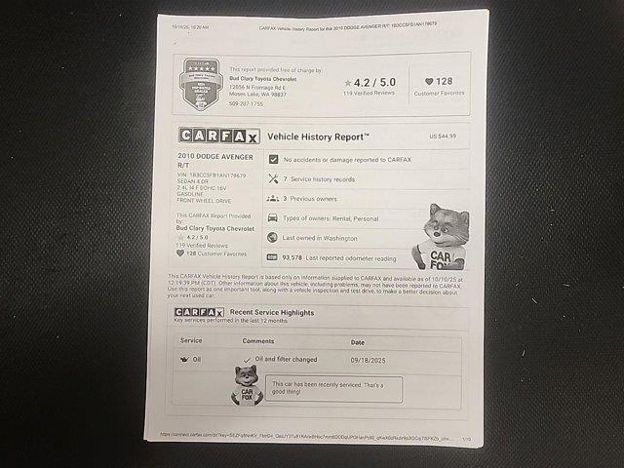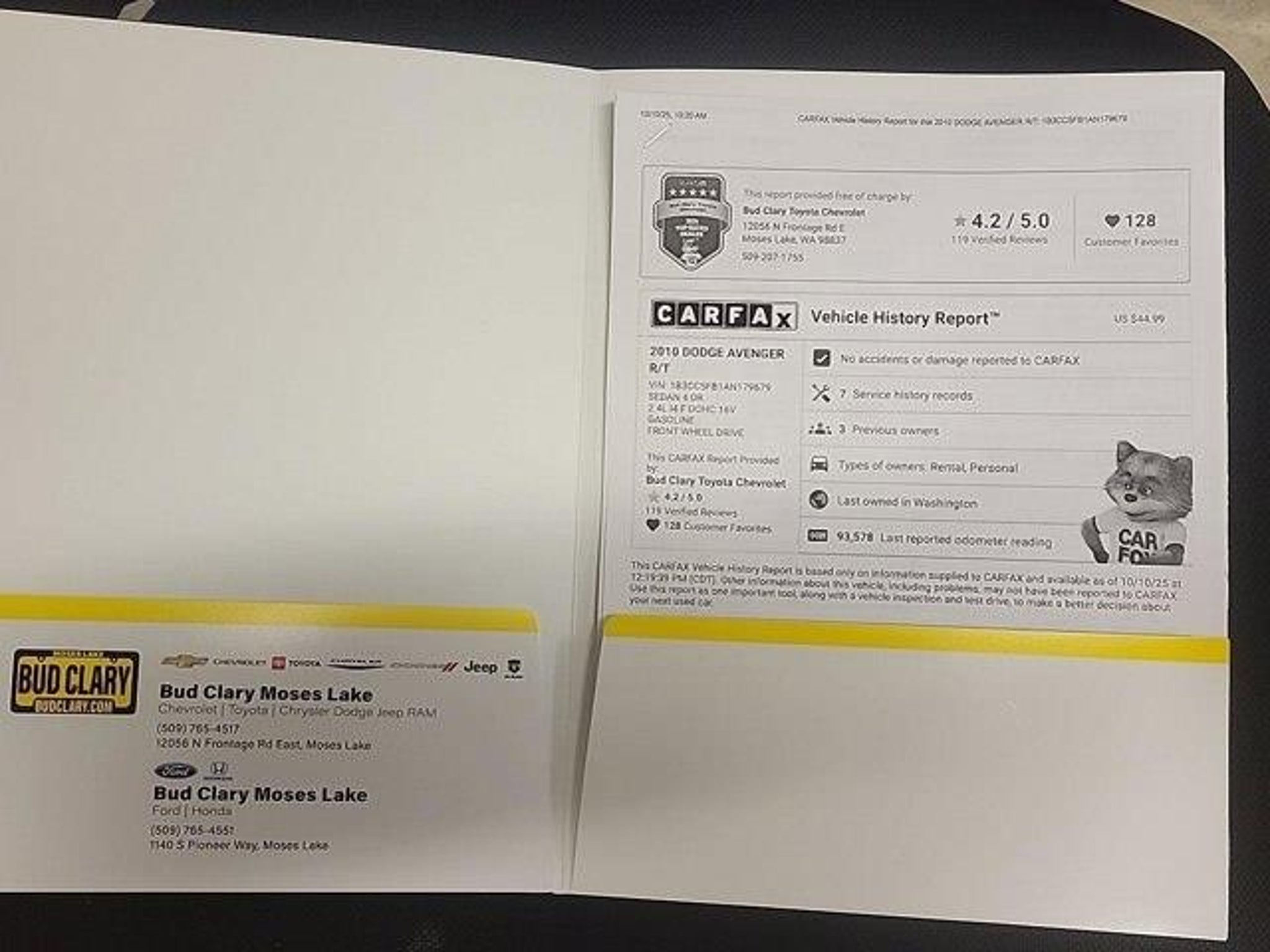 **DEALER CERTIFIED** Thank you for choosing Bud Clary Chevrolet of Moses Lake, this Silver Steel Metallic 2010 Dodge Avenger R/T is a great choice! Check out the following:No Accidents!City 21/ Hwy 30*What does it mean to be Bud Clary Dealer Certified?*Every Bud Clary Dealer Certified pre-owned vehicle comes with added peace of mind. provides a 3-day vehicle exchange, a comprehensive warranty, a free vehicle history report, and completes an extensive inspection of the vehicle before placing it on our storeâs lot.3-Day Vehicle ExchangeEvery used car comes with a 3-day, 300-mile vehicle exchange. That means if for some reason, youâre unhappy with your purchase within your first 3 days of ownership, you can return your vehicle to us.Comprehensive WarrantyBud Clary Chevrolet of Moses Lake provides each of our Certified Pre-Owned vehicles a 3-month/3,000 mile limited warranty. If a vehicle you purchase has a remaining factory warranty, we will honor that as well.Extensive InspectionYou can shop with confidence when youâre looking for a pre-owned vehicle at Bud Clary Chevrolet of Moses Lake. Our factory-trained experienced technicians perform a thorough inspection on every used vehicle before they make it to the lot.Free Vehicle History ReportNo need to be concerned about a vehicleâs past. Every used car comes with a complimentary history report that covers the exact history and condition of the vehicle youâre interested in.*OTHER NOTABLE FEATURES AND OPTIONS YOU SHOULD KNOW ABOUT:*=== Quick Order Package 25L ====== Comfort === * Heated driver and front passenger seat cushions - Thatâs hot. Heated driver and front passenger seat cushions provide more targeted warmth so you can get comfortable quicker in cold weather. If you have lower body pain, you might also be soothed by the heat while you drive. No matter the weather, find comfort in heated driver and front passenger seat cushions. * Leather seat upholstery - superior sitting. Thereâs more class in the cabin with leather seat upholstery. The leather material is luxurious to the touch, offers a distinctive look, and is easy to clean. Put a little luxury behind you with leather seat upholstery. * 8-way driver seat - Comfort that conforms to you! It doesn't matter how long your drive is; if you aren't comfortable while you're behind the wheel, every trip feels like a chore. With 8-way driver seat, finding the perfect position is easy, so you can sit back, (or up, or a little forward), relax and enjoy the journey. * Front passenger seat wi