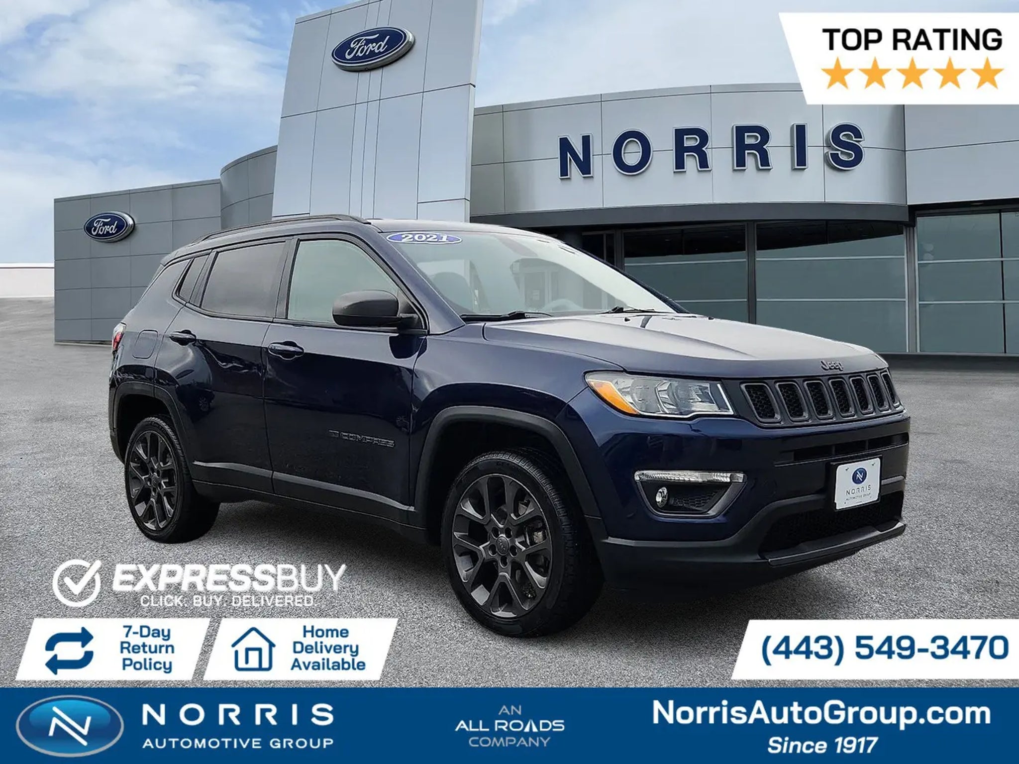 2021 Jeep Compass 80th Special EditionLIKE NEW CONDITION, CLEAN CARFAX, HEATED SEATS, HEATED STEERING WHEEL, 80th Anniversary Convenience Group, 80th Edition Leather Seats, Apple CarPlay/Android Auto, Auto High-beam Headlights, Automatic temperature control, Delay-off headlights, Front dual zone A/C, Front fog lights, Fully automatic headlights, Heated Front Seats, Heated Steering Wheel, Illuminated entry, Jeep 80th Anniversary Edition, Navigation System, Panic alarm, ParkView Rear Back-Up Camera, Power Liftgate, Quick Order Package 2GP, Radio: Uconnect 4C Nav w/8.4 Display, Remote keyless entry, Reversible Carpet/Vinyl Cargo Mat, Steering wheel mounted audio controls, Windshield Wiper De-Icer.Call Norris Ford TodayProudly Serving Baltimore 1917443-549-3470