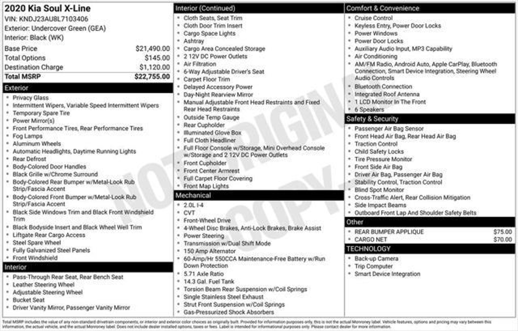 Priced below KBB Fair Purchase Price! ONE OWNER ACCIDENT FREE **4 New Tires** Apple CarPlay & Android Auto Exterior Parking Camera Rear Radio: AM/FM/MP3 Audio System Rear Bumper Applique Wheels: 18 x 7.5 Alloy. 2020 Kia Soul X-Line Undercover Green FWD CVT 2.0L I4 MPI DOHC 16V LEV3-SULEV30 147hp 27/33 City/Highway MPG Awards: * 2020 KBB.com 10 Coolest New Cars Under $20000 * 2020 KBB.com 10 Favorite New-for-2020 Cars