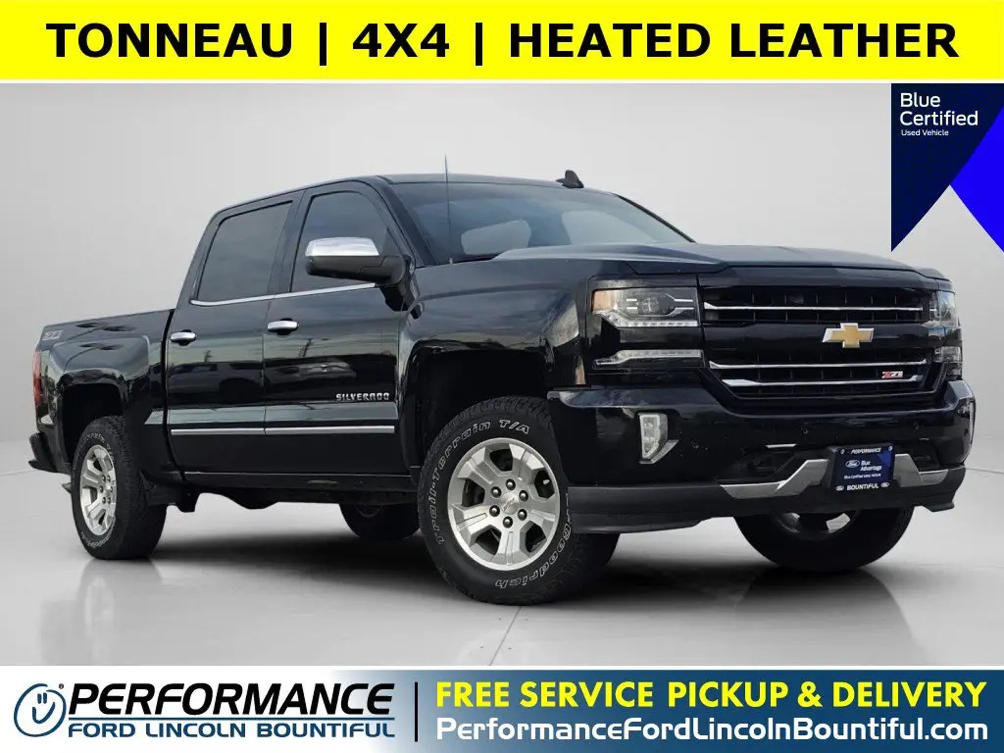 *Ford Blue Advantage Certified* and loaded with convenient features like: LEATHER, REMOTE START, TONNEAU, FRONT SENSORS, SPRAY-IN BEDLINER, ALLOY-WHEELS, BACKUP CAMERA, HEATED SEATS, FOG LAMPS, POWER SEAT, TRAILER BRAKE CONTROLS, WiFi, Remote Entry. *Save thousands in maintenance* by purchasing this Ford Blue Advantage Pre-Owned *2017 Chevrolet Silverado 1500 LTZ* with only 126,711 miles!This stunning *2017 Chevrolet Silverado 1500 LTZ* features a beautiful *Black* exterior and a *Dark Ash With Jet Black Interi* interior.Compare, adjust and save your payment options on every Certified Ford vehicle in stock at: PerformanceFordBountiful.com*Technology and Entertainment Features Include:* Premium Bose System, Remote Engine Start, WiFi Mobile Hotspot, SiriusXM Satellite Radio, Garage Door Opener, Wireless Smartphone Charger, On*Star, HD Radio and Second-row Sunroof, Dual Power Seats, Heated Steering Wheel, Automatic Climate Control, Leather Wrapped Steering Wheel, Memory Seats, Compass, Illuminated entry, Rear Reading Lights, Steering Wheel Cruise Control, Telescoping Wheel, Memory Mirrors, Steering Wheel Audio Controls, Air Conditioning, Auxiliary 12v Power Outlet, Bucket Front Seats, Auto Dimming R/V Mirror, Single-Disc CD Player, Center Console Storage, Rear Seat Center Armrest, Multi-zone Climate Control, Center Armrest, Outside Temperature Gauge, Reading Lights, Tilt Steering Wheel, Overhead Console, Split Folding Rear Seat, Vanity Mirrors, Trip Odometer, Rear Window Defroster.*Safety and Economy Features Include:* Backup Sensors, Rear Parking Aid, Back-Up Camera, Active Park Assist, Electronic Stability Control, Aftermarket Anti Theft System, Security System, Integrated Turn Signal Mirrors, Brake Assist, Dual Air Bags, Overhead airbag, LED Tail Lights, Auto-Dimming Door Mirrors, Speed Sensitive Power Steering, ABS Brakes, Delay-off headlights, Tire Pressure Monitoring System, Driver Front Side Impact Air Bag, Passenger Air Bag Sensor, Low tire pressure warning.This vehicle has an EPA rated fuel economy of 20.0 highway / 15.0 city1.This Ford Blue advantage Certified 2017 Chevrolet Silverado 1500 LTZ passed a rigorous inspection of mechanical, electrical and aesthetic details and comes with a 139-point inspection, completed by one of our factory-trained technicians. For your safety and convenience, this vehicle comes fully-detailed and sanitized. Every Ford Gold Certified Pre-Owned Vehicle from Performance Ford Lincoln Bountiful comes with a 172-point inspection and Blue Certified vehicles*Warranties include* For Ford vehicles, a comprehensive limited warranty for 12 months/12,000 miles. Along with this comprehensive limited warranty, 7-year/100,000-mile powertrain limited warranty coverage is included with every Ford Gold Certified Pre-owned vehicle.2, Complimentary 24/7 Roadside Assistance.3. Lincoln Certified vehicles come with a limited warranty that covers repair or replacement of covered components for six years from the original Lincoln New-Vehicle Limited Warranty start date, or up to 100,000 miles on odometer- whichever comes first. Coverage includes parts and labor, but excludes wear-and-tear items. Painstakingly reconditioned to the manufacturer's exacting standards by factory-trained technicians. Please see dealer for additional details.*Performance Ford Lincoln Bountiful proudly offer our customers at-home services including *Performance Valet*! When you purchase from Performance Ford Lincoln Bountiful, you will be eligible for *Complimentary Pickup & Delivery*^ for your future service appointments! We value your time and that's why want to give you the best buying and service experiences in Bountiful! Also, ask your product specialist about our home test drives and deliveries. Save time and money through our exclusive Performance Remote Services! Distance limitations may apply.Our dealership is conveniently located off Exit 315 on I-15, North of Salt Lake City. We proudly serve the communities of Bountiful, Centerville, North Salt Lake, Farmington, Salt Lake City, Kaysville, South Salt Lake, Layton, Canyon Rim, Millcreek, West Valley City, Murray, Holladay, Taylorsville, and Syracuse. As a proud member of the family-owned Performance Automotive Network, we have access to thousands of new and used vehicles. This gives us the ability to find the perfect vehicle to fit your needs and budget.*Need financing assistance?* Our strong, group-wide relationships with several lending institutions allow us to offer the most competitive rates! We will give you top-dollar for your trade or make you a cash offer if you'd prefer the convenience of selling directly.With our aggressive pricing strategy, most vehicles sell within the first few weeks, so please contact us ahead of time at * * to ensure the vehicle is still available and ready for your test drive.*We'll Put A Smile On Your Face! *1Based on EPA mileage ratings. Use for comparison purposes only. Your mileage will vary depending on driving conditions, how you drive and maintain your vehicle, etc.2Blue Certified includes a 90-Day or 4,000 mile comprehensive limited warranty coverage. See your dealer for warranty coverage details.37 Years for Gold Certified vehicles and 90 days for Blue Certified vehicles. Ford Roadside Assistance is included for certain owners and available to everyone for a per service fee. Ford reserves the right to change program details without obligations.*Terms and conditions of warranties vary by brand and vehicle. See dealer for complete details or sign in to download a copy of your vehicle's warranty. Warranty may be restricted or denied if your vehicle or part has been modified, improperly maintained or removed.Delivery to door for Test Drive.