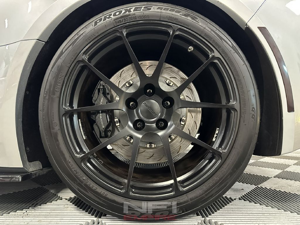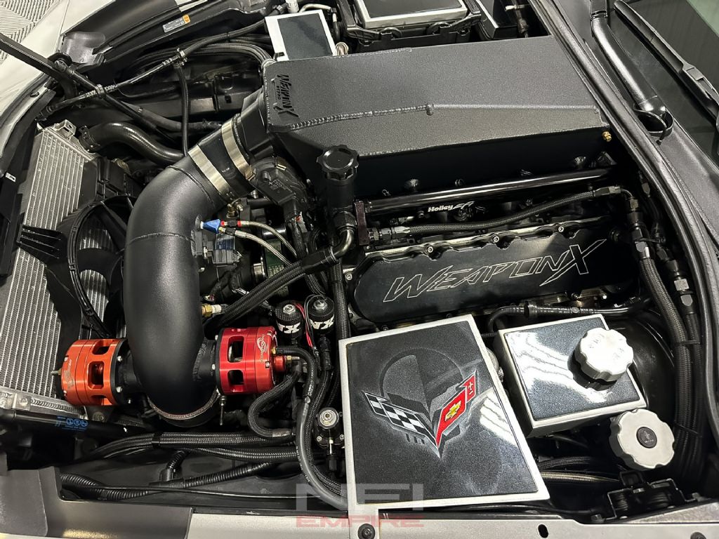 Weapon X Motorsports completed a WXM Z06 widebody conversion, giving the car the wider track and larger wheel clearance of a Z06. An RK Sport extractor hood with modified vents improves heat evacuation. Exterior finishing and detailing were carried out by Spade Kreations, including paintwork around the widebody and hood conversions.