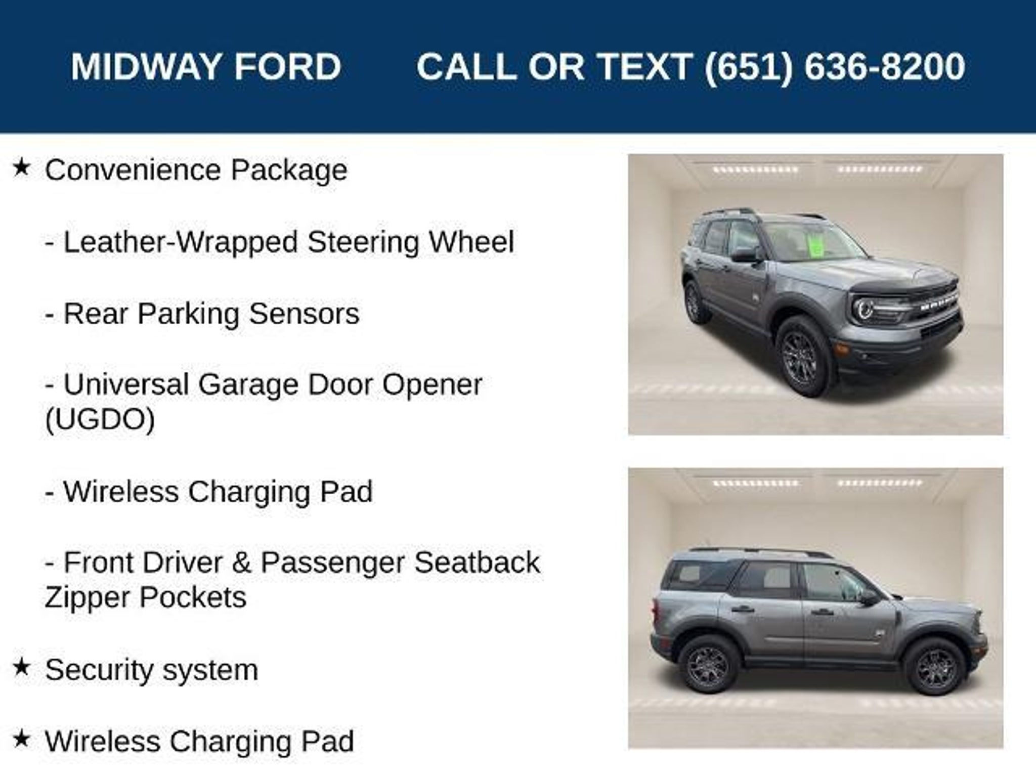 Midway Ford is pumped up to offer this beautiful 2023 Ford Bronco Sport Big Bend in Carbonized Gray Metallic beautifully equipped with: 4WD 8-Speed Automatic 1.5L EcoBoost One Owner Apple CarPlay Android Auto Convenience Package Equipment Group 200A Heated Front Bucket Seats Security system Wireless Charging Pad. 25/28 City/Highway MPG Recent Arrival! Odometer is 4047 miles below market average! Ford Blue Certified Details: * Vehicle History * Limited Warranty: 3 Month/4000 Mile (whichever comes first) after new car warranty expires or from certified purchase date * and 11000 FordPass Rewards Points to use toward first maintenance visit * Transferable Warranty * Roadside Assistance * Warranty Deductible: $100 * 139 Point Inspection CALL OR TEXT: Stop by and see us at: 2777 Snelling Ave N Saint Paul Minnesota 55113