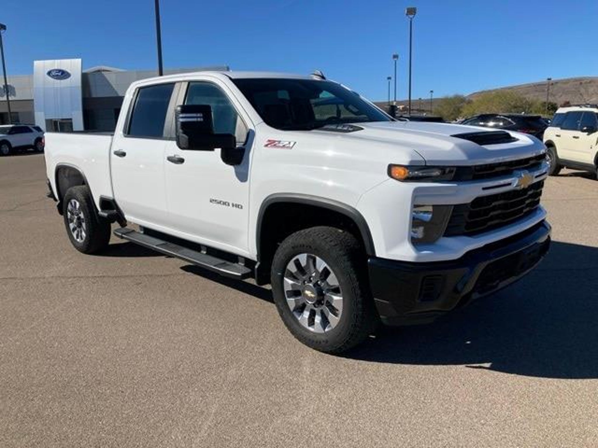 Summit White 2024 Chevrolet Silverado 2500HD Custom 4WD 10-Speed Automatic 6.6L V8 10-Speed Automatic, 4WD, Black Cloth, 10-Way Power Driver Seat Adjuster w/Lumbar, 120-Volt Bed Mounted Power Outlet, 120-Volt Interior Power Outlet, 170 Amp Alternator, 2-Speed Electronic Shift Transfer Case, 3.5 Diagonal Monochromatic Display DIC, 3.73 Rear Axle Ratio, 4-Wheel Disc Brakes, 6 Speakers, 6-Speaker Audio System, 720 Cold-Cranking Amps Heavy-Duty Battery, ABS brakes, Air Conditioning, Alloy wheels, AM/FM radio: SiriusXM with 360L, Apple CarPlay/Android Auto, Auto High-beam Headlights, Auto-Dimming Inside Rear-View Mirror, Black Mirror Caps, Black Molded Splash Guards (LPO), Bluetooth For Phone, Brake assist, Chevrolet Connected Access Capable, Cloth Seat Trim, Color-Keyed Carpeting Floor Covering, Compass, Custom Convenience Package, Custom Value Package, CX Safety Package, Deep-Tinted Glass, Delay-off headlights, Driver door bin, Dual front impact airbags, Dual front side impact airbags, Dual Rear USB Ports (Charge Only), Durabed Pickup Bed, Electric Rear-Window Defogger, Electronic Cruise Control w/Set & Resume Speed, Electronic Stability Control, EZ Lift Power Lock & Release Tailgate, Front 40/20/40 Split-Bench Seats w/Lockable Storage, Front anti-roll bar, Front Center Armrest w/Storage, Front License Plate Kit, Front reading lights, Front Rubberized Vinyl Floor Mats, Front wheel independent suspension, Fully automatic headlights, HD Rear Vision Camera, Heated & Auto-Dimming Vertical Trailering Mirrors, Heated door mirrors, Heated Vertical Trailering Mirrors, Hill Descent Control, Illuminated entry, Integrated Trailer Brake Controller, Lane Change Alert w/Side Blind Zone Alert, LED Cargo Area Lighting, Locking Tailgate, Low tire pressure warning, Manual Tailgate Function w/No EZ Lift, Manual Tilt-Wheel Steering Column, Not Equipped w/Rear USB Ports, Occupant sensing airbag, Off-Road Suspension, OnStar & Chevrolet Connected Services Capable, Outside temperature display, Overhead airbag, Overhead console, Panic alarm, Passenger door bin, Passenger vanity mirror, Power Door Locks, Power door mirrors, Power Front Windows w/Driver Express Up/Down, Power Front Windows w/Passenger Express Down, Power Rear Windows w/Express Down, Power steering, Power windows, Preferred Equipment Group 1CX, Premium audio system: Chevrolet Infotainment 3, Push Button Start, Radio: Chevrolet Infotainment 3 System, Rear 60/40 Folding Bench Seat (Folds Up), Rear Cross Traffic Alert, Rear Park Assist, Rear reading lights, Rear Rubberi