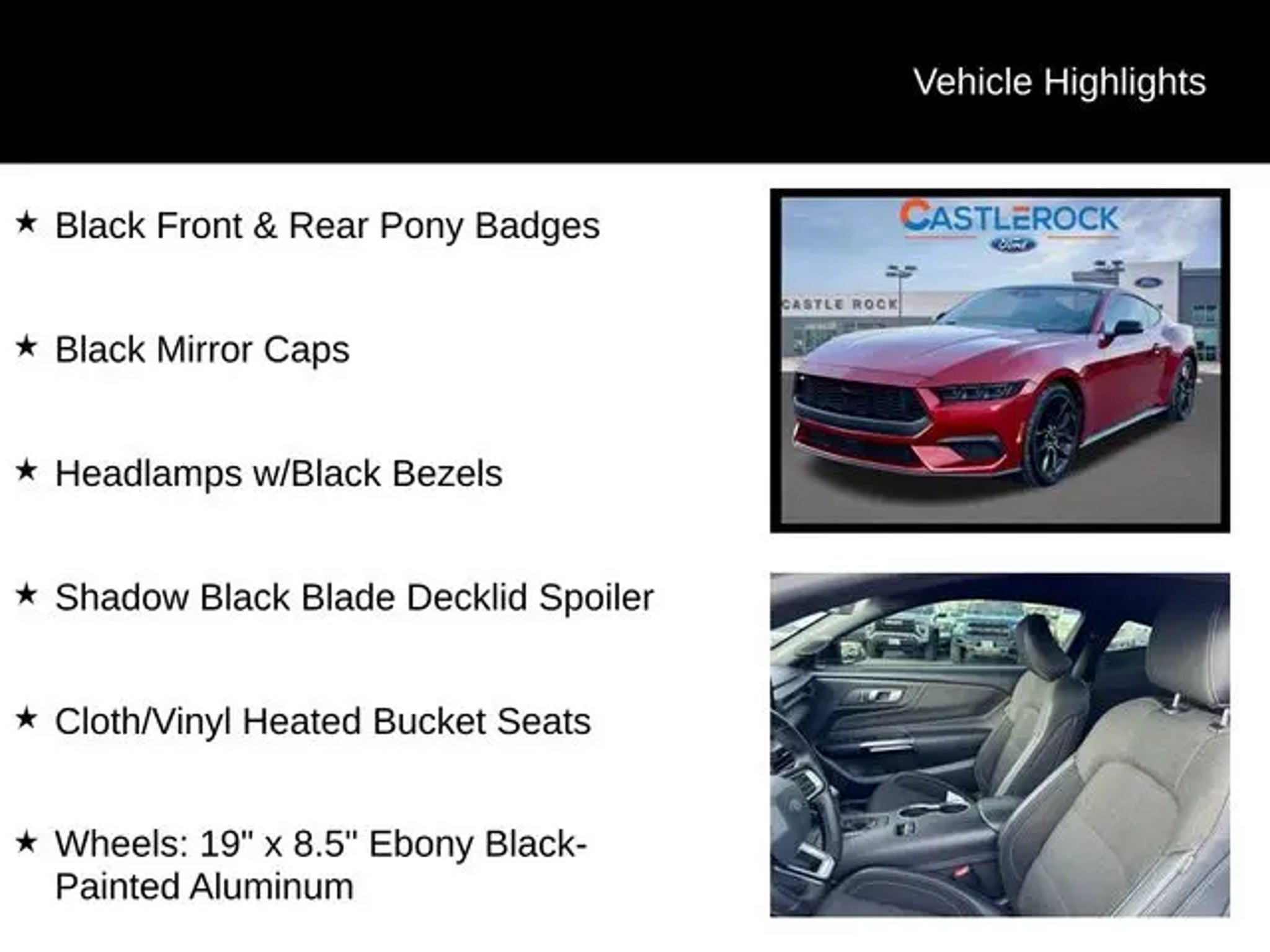 Discover the thrilling performance and sophisticated style of the 2024 Ford Mustang EcoBoost Certified Pre-Owned. This head-turning sports car is a true driver's delight, blending exhilarating power with exceptional handling and refined comfort. Elevate your driving experience with the Mustang's impressive list of features: ? Mustang Nite Pony Package, including Black Mirror Caps, Shadow Black Blade Decklid Spoiler, and 19 Ebony Black-Painted Aluminum Wheels ? Equipment Group 101A High Package, featuring Dual-Zone Electronic Automatic Temperature Control, SiriusXM with 360L and HD Radio, and a 9-Speaker Stereo System ? Striking Rapid Red Metallic Tinted Clearcoat exterior with Black Front and Rear Pony Badges, Headlamps with Black Bezels, and a Painted Black Roof This Mustang EcoBoost is powered by a thrilling EcoBoost 2.3L I4 GTDi DOHC Turbocharged VCT engine, delivering an exhilarating 22 city / 33 highway MPG. The 10-Speed Automatic transmission and Rear-Wheel Drive provide a dynamic and engaging driving experience. Certified as a pre-owned vehicle, this Mustang has undergone a comprehensive inspection and reconditioning process, ensuring it meets the highest standards of quality and reliability. You can drive with confidence, knowing this Mustang is backed by Ford's extensive warranty coverage. Indulge in the perfect blend of performance, style, and peace of mind with this 2024 Ford Mustang EcoBoost Certified Pre-Owned. Visit CASTLE ROCK FORD or call for your V.I.P. appointment at 720-733-7057. Price does not include Tax, Title and Fees.