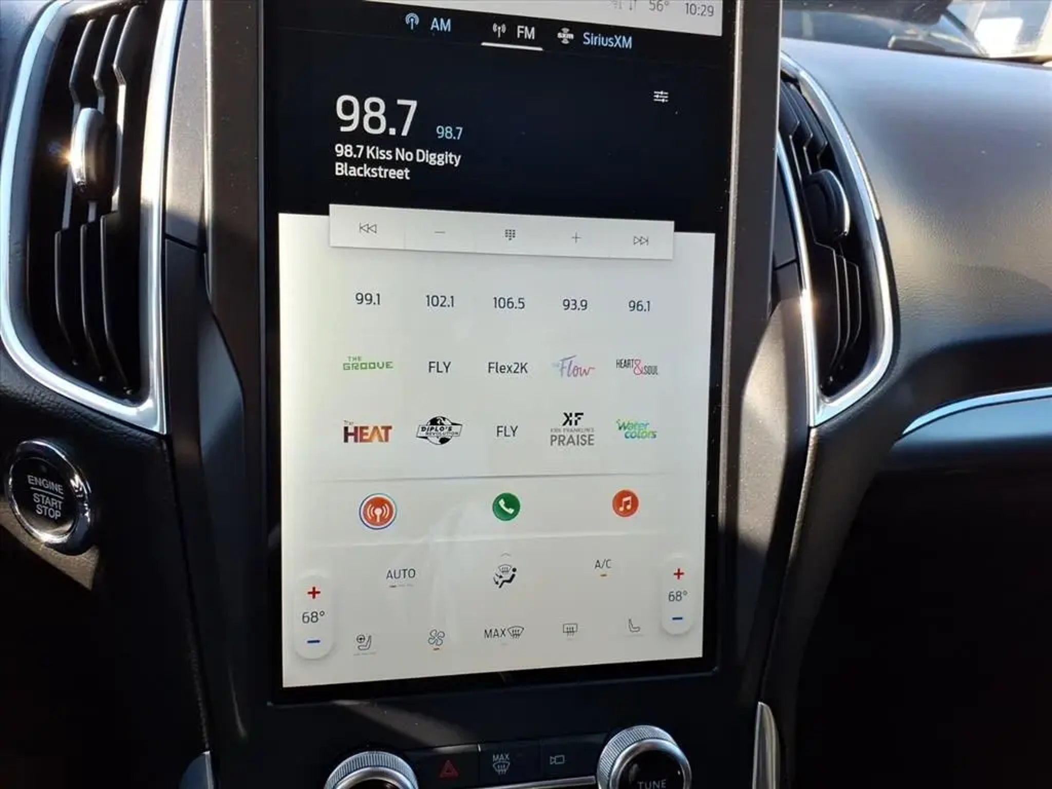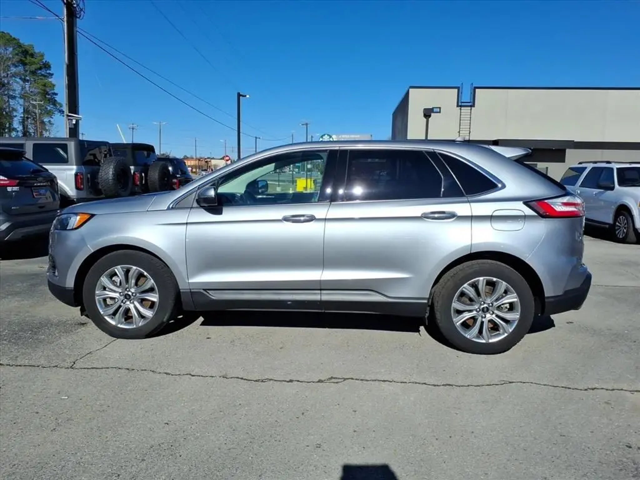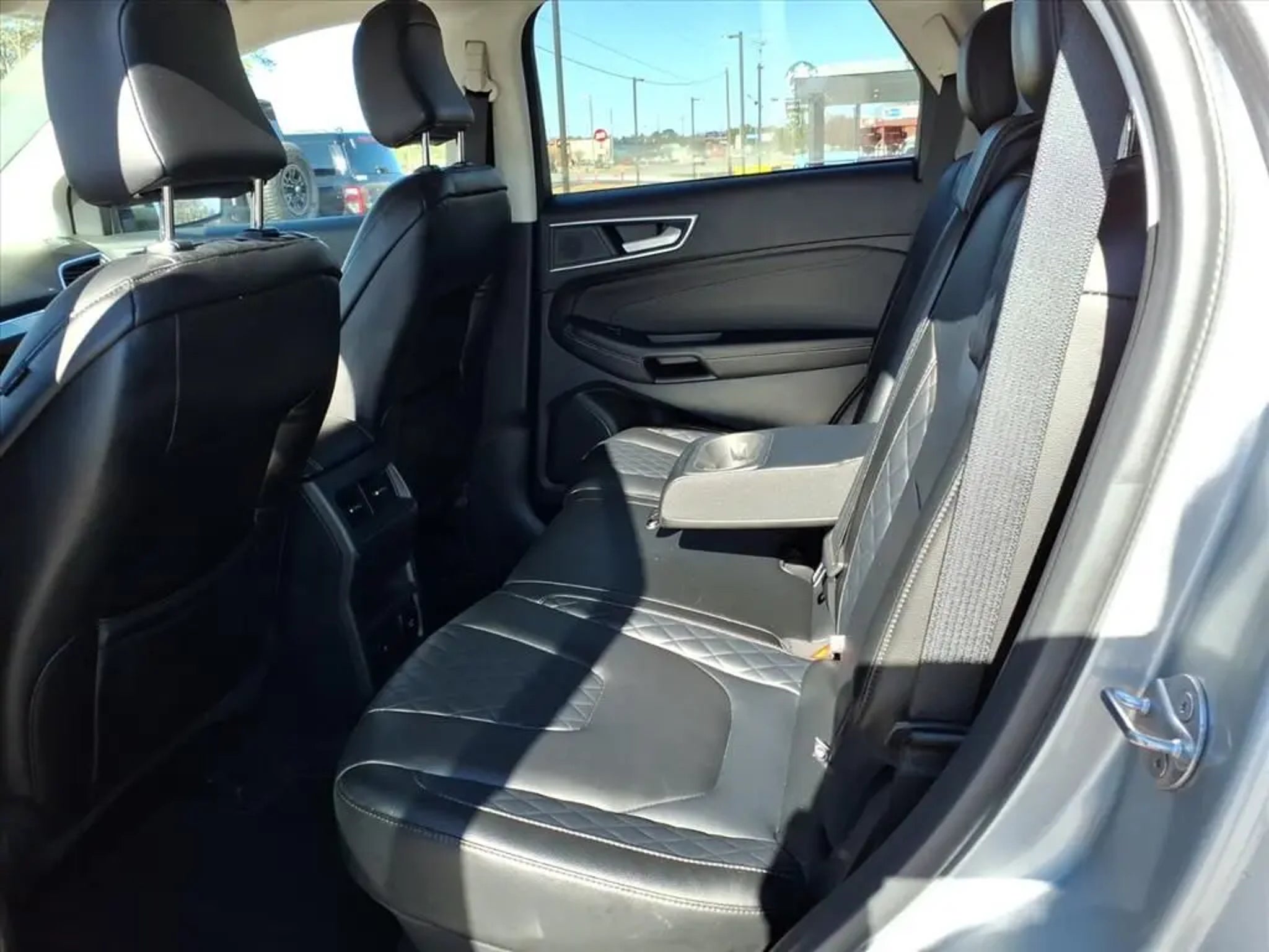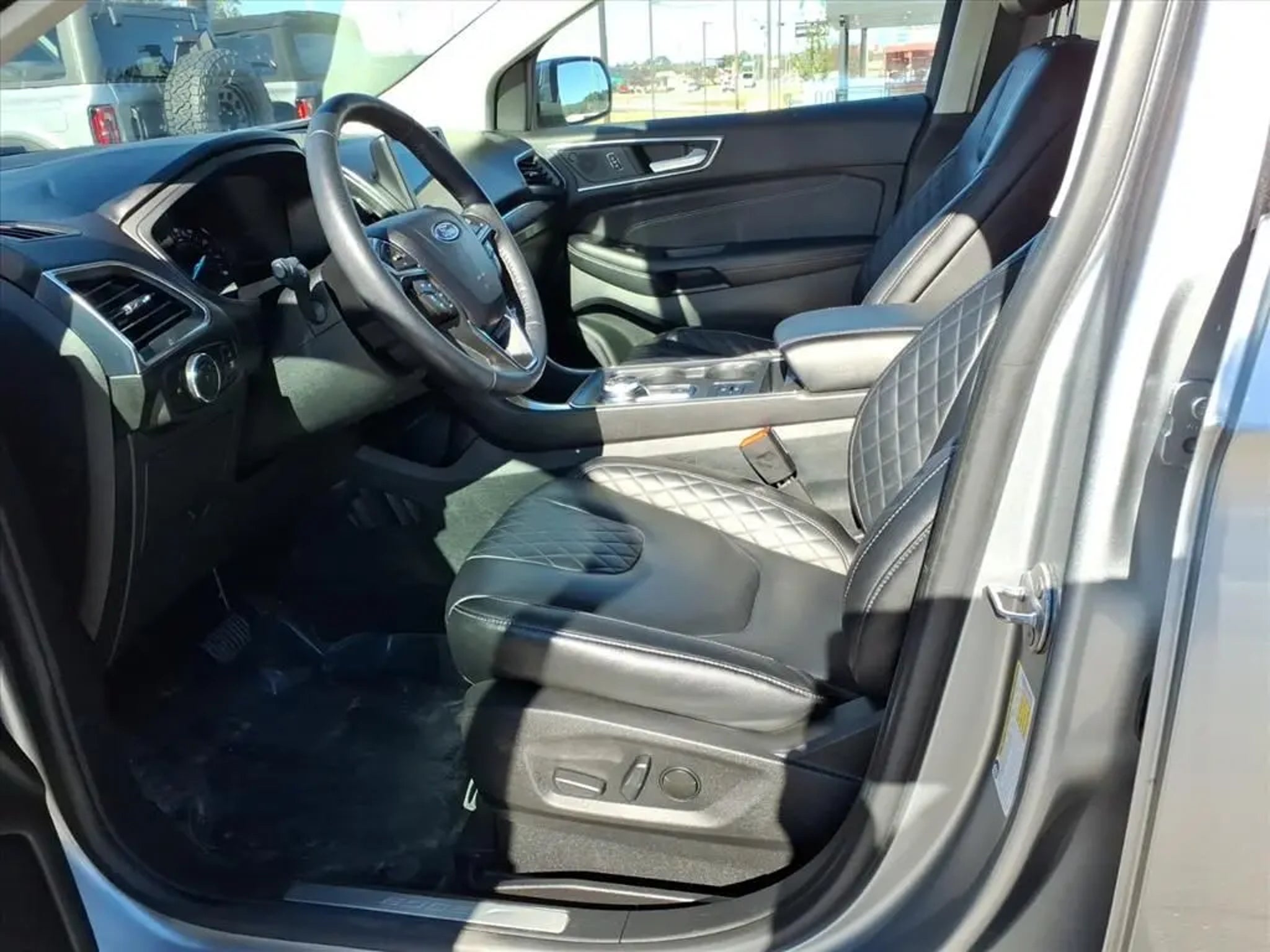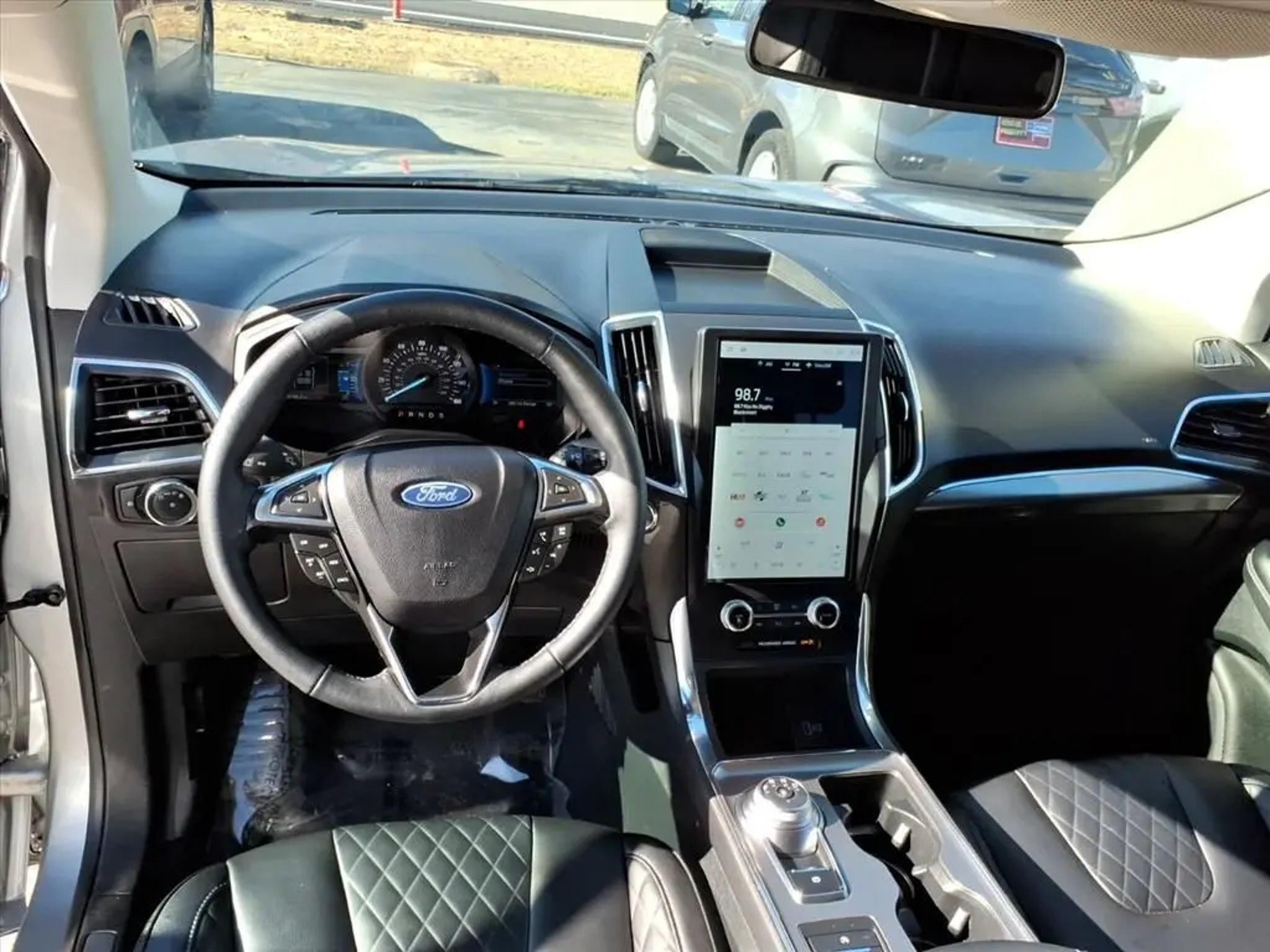 This 2024 Ford Edge Titanium 8-Speed Automatic is equipped with Equipment Group 300A, 12 Speakers, 3.80 Axle Ratio, 4-Wheel Disc Brakes, ABS brakes, ActiveX-Trimmed Heated Sport Bucket Seats, Air Conditioning, Alloy wheels, AM/FM radio: SiriusXM with 360L, Auto High-beam Headlights, Auto-dimming Rear-View mirror, Automatic temperature control, Brake assist, Bumpers: body-color, Compass, Delay-off headlights, Driver door bin, Driver vanity mirror, Dual front impact airbags, Dual front side impact airbags, Electronic Stability Control, Emergency communication system: SYNC 4 911 Assist, FordPass Connect, Four wheel independent suspension, Front anti-roll bar, Front Bucket Seats, Front Center Armrest w/Storage, Front dual zone A/C, Front fog lights, Front License Plate Bracket, Front reading lights, Fully automatic headlights, Garage door transmitter, Heated door mirrors, Heated front seats, Heated steering wheel, Illuminated entry, Knee airbag, Leather steering wheel, Low tire pressure warning, Memory seat, Occupant sensing airbag, Outside temperature display, Overhead airbag, Overhead console, Panic alarm, Passenger door bin, Passenger vanity mirror, Power door mirrors, Power driver seat, Power Liftgate, Power passenger seat, Power steering, Power windows, Radio: B&O Sound System by Bang & Olufsen, Rain sensing wipers, Rear anti-roll bar, Rear reading lights, Rear seat center armrest, Rear window defroster, Rear window wiper, Remote keyless entry, Security system, SiriusXM w/360L, Speed control, Speed-Sensitive Wipers, Split folding rear seat, Spoiler, Steering wheel mounted audio controls, SYNC 4A w/Enhanced Voice Recognition, Tachometer, Telescoping steering wheel, Tilt steering wheel, Traction control, Trip computer, Turn signal indicator mirrors, Variably intermittent wipers, and Wheels: 19 Luster Nickel-Painted Aluminum.