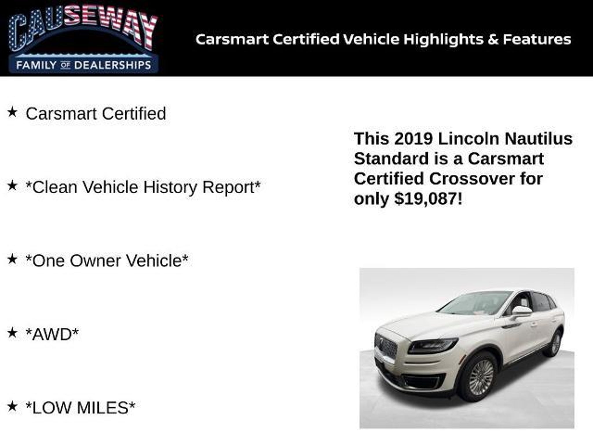 2019 Lincoln Nautilus Standard Refined Luxury with Confident Capability Experience elegant design, advanced comfort, and smooth performance in this 2019 Lincoln Nautilus Standard AWD, finished in White Platinum with a sophisticated Cappuccino interior. This one-owner SUV is Carsmart Certified and backed by a Clean Vehicle History Report, Comprehensive 100 Point Inspection, and a 6-Month / 6,000-Mile Limited Warrantydelivering luxury and reliability you can trust. Performance & Capability Under the hood, the Nautilus features a 2.0L Turbocharged I4 engine paired with an 8-speed automatic transmission, providing smooth, confident power and exceptional efficiency. The All-Wheel Drive (AWD) system ensures optimal traction and control, while speed-sensing steering and four-wheel independent suspension deliver a balanced, composed ride. Interior Comfort & Technology The cabin offers a calm, premium environment crafted for comfort and convenience. Enjoy dual-zone automatic climate control, memory seating, and power-adjustable front seats. The intuitive SYNC 3 Communications & Entertainment System with AM/FM/SiriusXM radio, CD player, and 11-speaker audio system keeps you connected and entertained on every drive. Other interior highlights include: Power windows and steering Remote keyless entry Steering wheel-mounted A/C and audio controls Rear window defroster Safety & Confidence Lincolns focus on safety ensures peace of mind with features such as: 4-Wheel Disc Brakes & ABS Dual front and side-impact airbags Knee and overhead airbags Emergency communication system (911 Assist) Traction and stability control The Nautiluss reinforced structure and intelligent safety systems work together to protect you and your passengers from every angle. Exterior Design The White Platinum finish highlights Lincolns timeless elegance with modern sophistication. Signature details include: 18 Premium Painted Aluminum Wheels Power liftgate LED headlights with Auto High-Beam Assist Heated power door mirrors with turn signal indicators Body-color bumpers and roof spoiler Every design element enhances both function and formcreating a luxurious yet athletic presence on the road. Ownership Confidence Buy smart with Carsmart Certified best-in-class benefits, including: Comprehensive 100 point inspection 6-Month / 6,000-Mile Limited Warranty Complimentary Carfax History Report Available Extended Protection Plans Low, no-haggle pricing Drive with peace of mind knowing this Nautilus delivers luxury, value