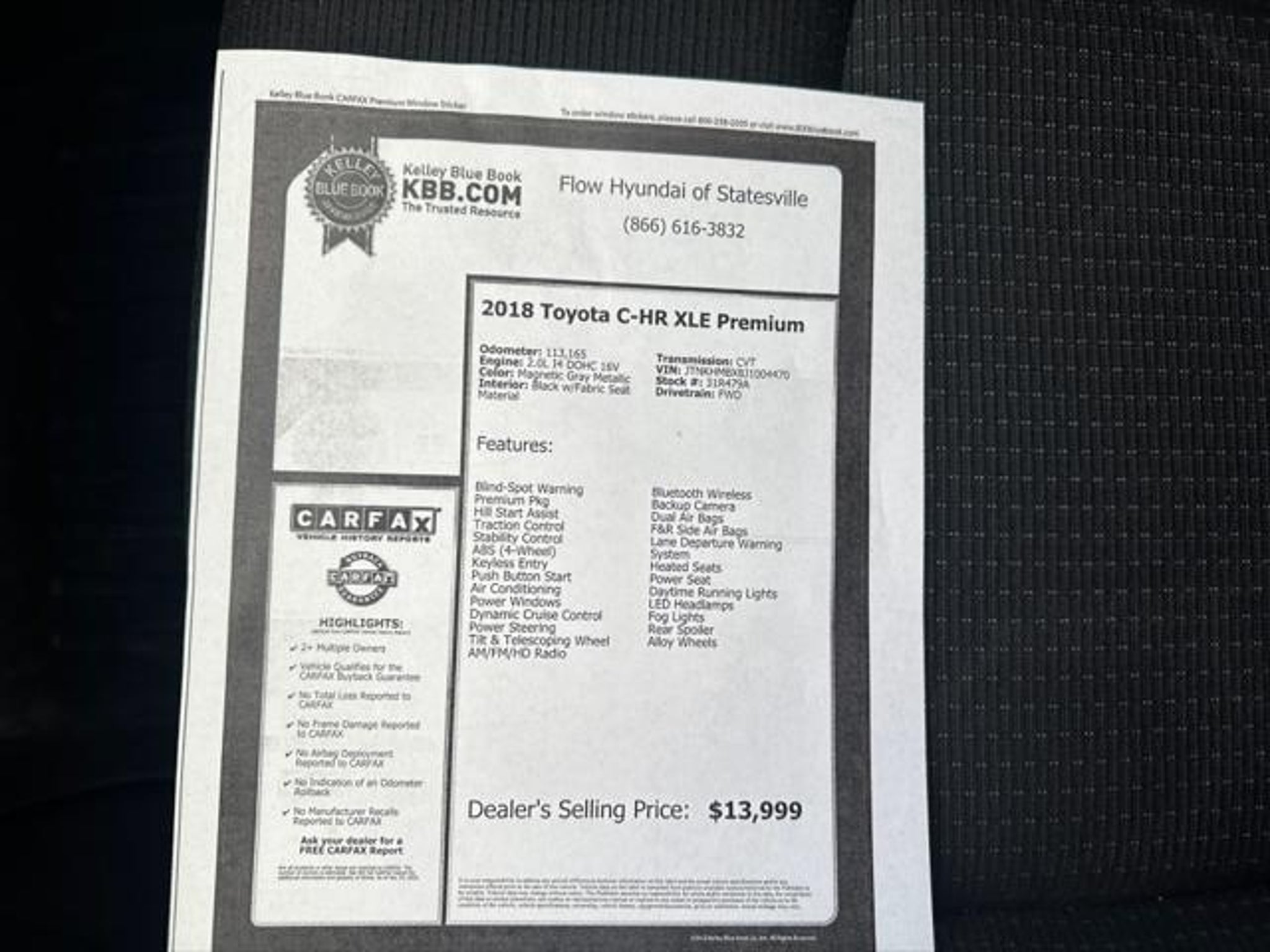 BLUETOOTH HANDS FREE ** BACK UP CAMERA ** FLOW CERTIFIED ** PREMIUM WHEELS ** ABS brakes Active Cruise Control Alloy wheels Electronic Stability Control Front dual zone A/C Heated door mirrors Heated Front Bucket Seats Heated front seats Illuminated entry Lane Change Assist Low tire pressure warning Remote keyless entry Smart Master 2 Key Plate Traction control XLE Premium Package. FLOW CERTIFIED! 12 MONTHS/12000 MILE WARRANTY 3 day money back guarantee and a free maintenance package on this 2018 Toyota C-HR Magnetic Gray Metallic XLE Premium! ** ** All of our cars go through a comprehensive QRP Quality Renewal Process. Come check out Flow Hyundai of Statesvilles No haggle No Pressure Transparent Easy Fun car shopping experience!! We have the most professional and courteous sales staff in North Carolina. Call Internet Sales Dept at to set schedule a test drive or https:// . Thank you for allowing us to serve your automotive needs over the past 50 years.