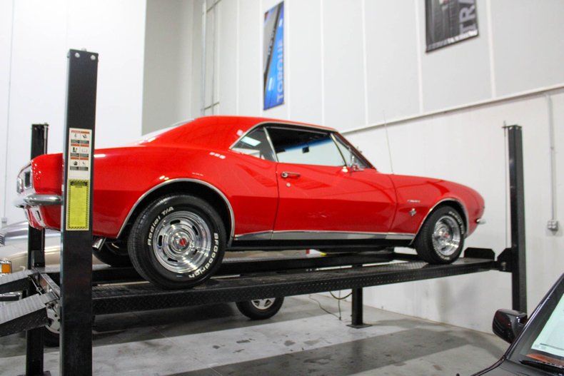 This 1967 Chevrolet Camaro RS is a sharp and well-kept example of the first-year Camaro, finished in a bright Red repaint completed around 2001. The paint still shows beautifully, reflecting the care and garage storage it's received since. As a true Rally Sport car, it features the iconic hidden headlights, RS badging, and refined trim package that set these early Camaros apart.
