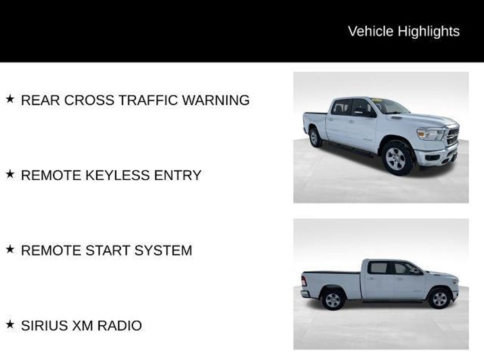 2019 Ram 1500 Big Horn/Lone Star Bright White Clearcoat HEMI 5.7L V8 Multi Displacement VVT 4WD 4X4, BACKUP CAMERA, BLUETOOTH FOR PHONES, DUAL ZONE CLIMATE, FOG LIGHTS, HEATED SEATS, HEATED STEERING WHEEL, PARKING SENSORS, REAR CROSS TRAFFIC WARNING, REMOTE KEYLESS ENTRY, REMOTE START SYSTEM, SIRIUS XM RADIO, 1500 Big Horn/Lone Star, 4D Crew Cab, HEMI 5.7L V8 Multi Displacement VVT, 8-Speed Automatic, 4WD, Bright White Clearcoat, Black Cloth. Must finance at standard rates and/or have a trade-in for all Discounts and Patriot Savings. PRICE DOES NOT INCLUDE TAX, TITLE, LICENSE, SERVICE FEE OF $399, DEALER OPTIONS.