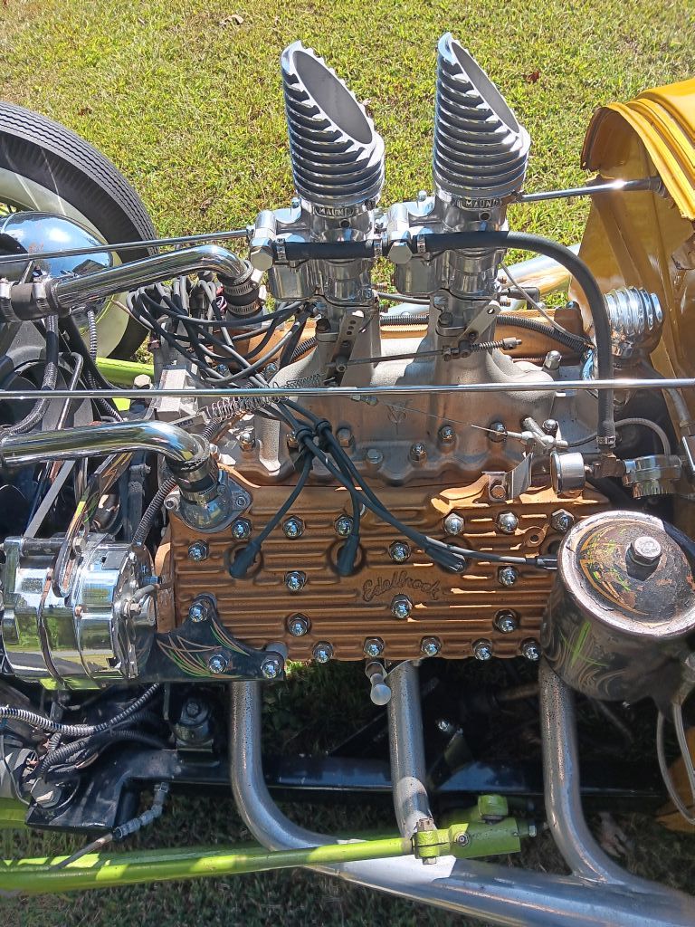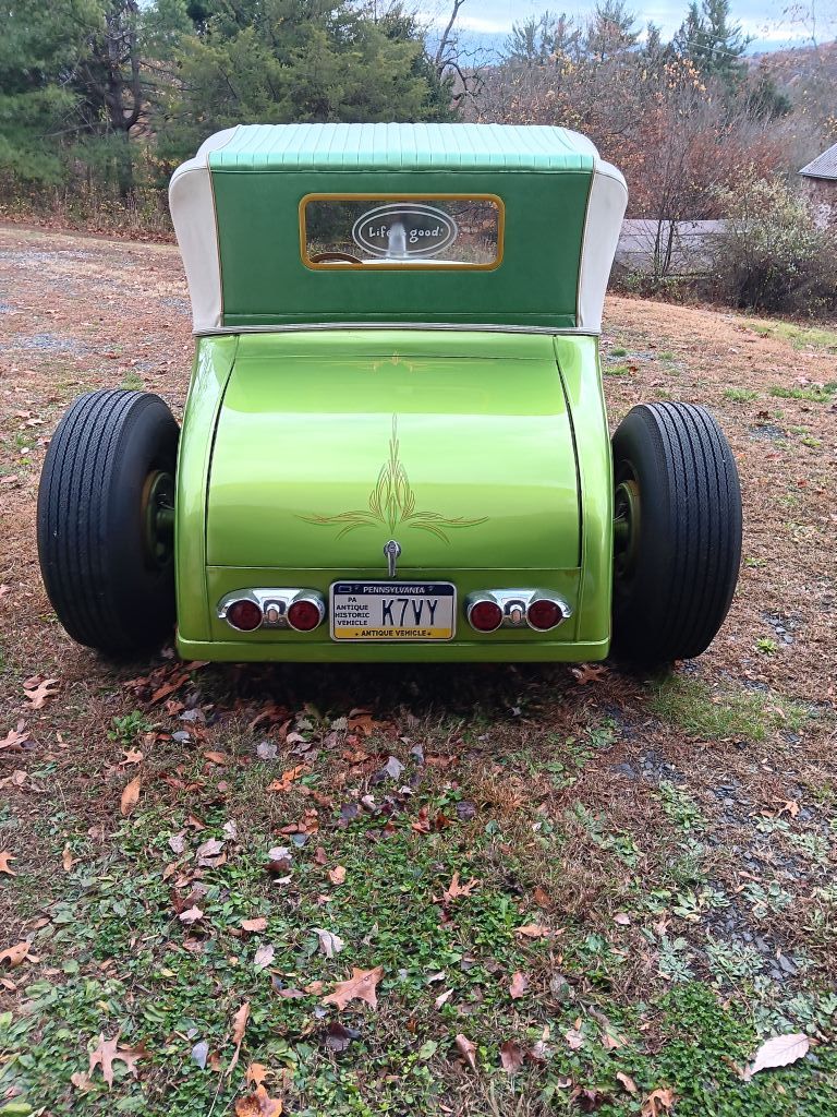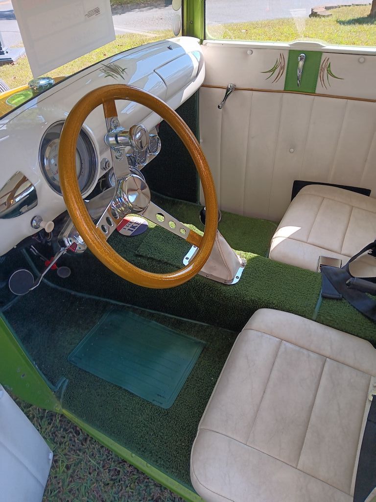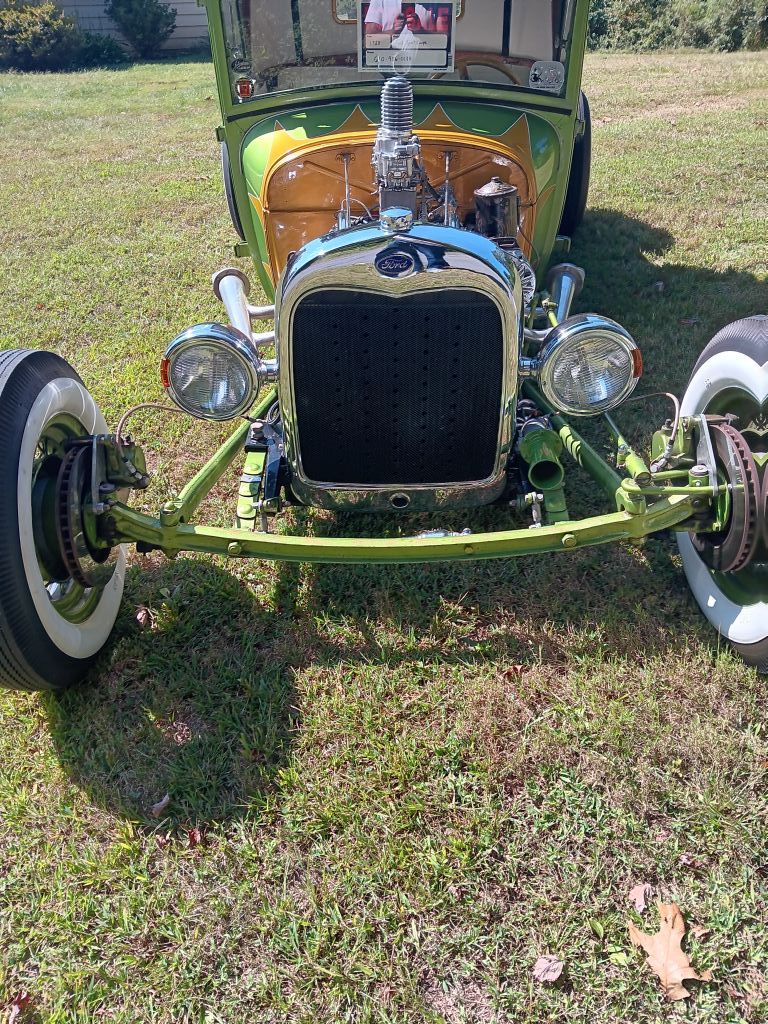 1928 Ford Sport Coupe. 1950 Ford Flathead backed by 5 speed manual transmission, high rise manifold, dual carbs, 409 Chevy, water pump conversion, new battery, starter, spoked wires with whitewalls, battery cut off switch, 1950 Ford dashboard cut down, Disc brakes, front drums rear, gauges and lights work, Peterbilt truck headlights, Channeled. Neat nostalgic hot rod.