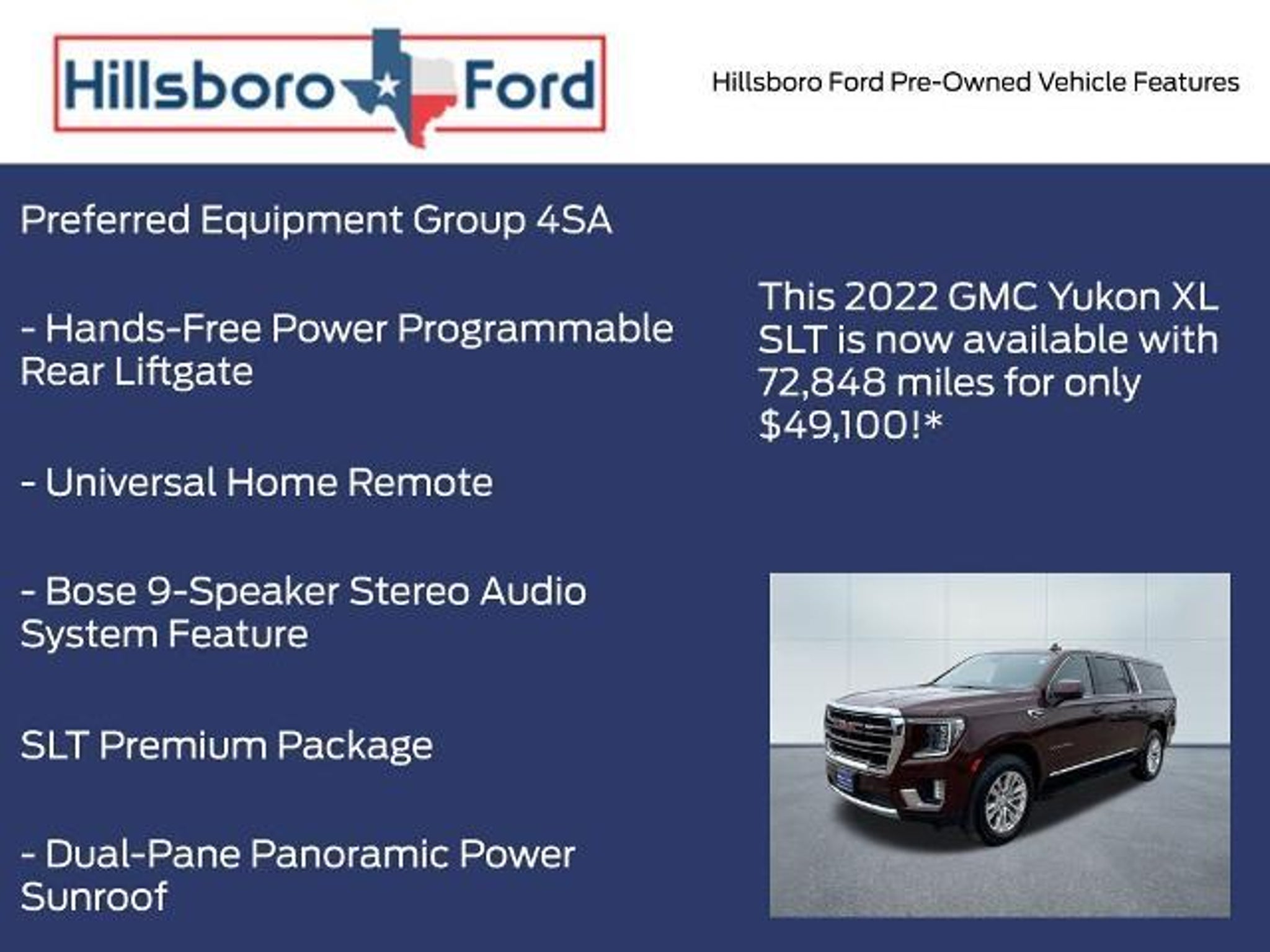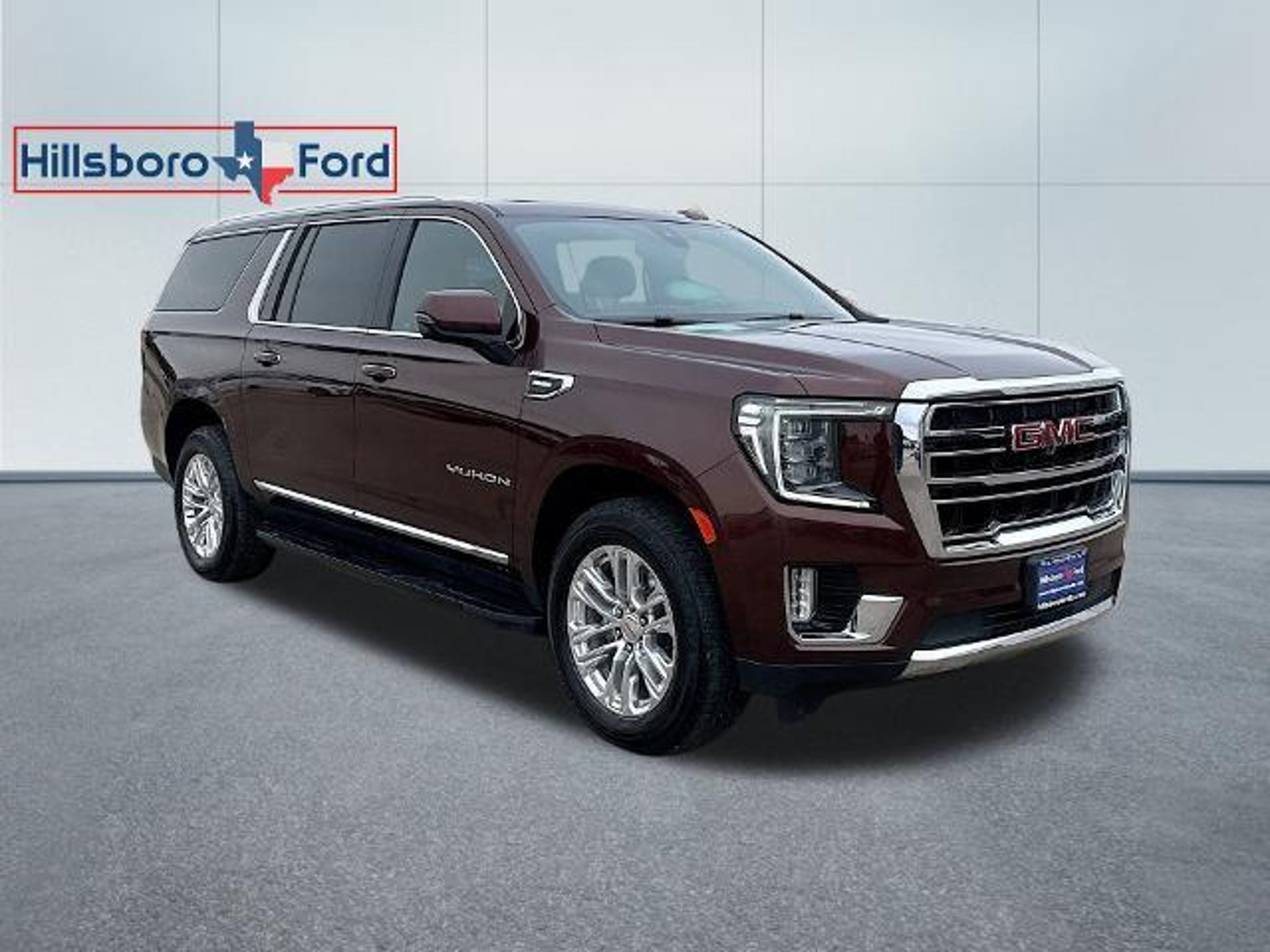 Our Diesel powered 2022 GMC Yukon XL SLT 4WD is built for big fun in Redwood Metallic! Motivated by a TurboCharged 3.0 Liter DuraMax Diesel 6 Cylinder that serves up 277hp and 460lb-ft of torque to a 10 Speed Automatic transmission. This Four Wheel Drive SUV is well-prepared for rugged family fun with robust body-on-frame construction and a Premium Smooth Ride suspension, plus it scores nearly 26mpg on the highway. Prepare for stares, too, since our Yukon XL has an imposing presence with LED lighting, fog lamps, bright chrome accents, a hands-free tailgate, heated power mirrors, assist steps, and 20-inch wheels. Upsized for your convenience, our SLT cabin welcomes you with a sunroof, heated/ventilated leather power front seats, versatile second and third rows, a leather-wrapped steering wheel, tri-zone automatic climate control, keyless access/ignition, remote start, a large rear cargo area, and a 12-inch driver display. Further digital benefits include a 10.2-inch touchscreen, built-in Google services, wireless Android Auto/Apple CarPlay, Bluetooth, WiFi compatibility, wireless charging, and Bose audio. GMC provides intelligent safety with technologies like automatic braking, lane-keeping assistance, blind-spot alert, forward collision warning, and an HD backup camera with hitch guidance. The bottom line is that you can do more and fit more in our Yukon XL SLT! Save this Page and Call for Availability. We Know You Will Enjoy Your Hillsboro Ford Test Drive Towards Ownership! Clean CARFAX. Redwood Metallic 2022 GMC Yukon XL SLT 4WD 10-Speed Automatic with Overdrive 3.0L I6 2 Presets For Outside Rearview Mirrors, 2 Presets For Power Driver Seat, 3rd Row 60/40 Power-Folding Split-Bench Seat, Automatic Stop/Start, Bose 9-Speaker Stereo Audio System Feature, Bright Chrome Bodyside Moldings, Bright Front & Rear Door Sill Plates, Chrome Door Handles w/Body-Color Strip, Dual-Pane Panoramic Power Sunroof, Hands-Free Power Programmable Rear Liftgate, HD Surround Vision, Heated & Ventilated Driver & Front Passenger Seats, Heated 2nd Row Outboard Position Seats, Heated Driver & Front Passenger Seats, Heated Steering Wheel, Inside Rear-View Auto-Dimming Mirror, License Plate Front Mounting Package, Outside Heated Power-Adjustable Mirrors, Power Release 2nd Row 60/40 Split-Folding Bench Seat, Power Tilt & Telescopic Steering Column, Preferred Equipment Group 4SA, Rear Pedestrian Alert, Safety Alert Seat, SLT Luxury Package, SLT Premium Package, Start/Stop System Disable Button, Universal Home Remote, Wireless Charging. Hillsboro Ford is conveniently located on the frontage road of Interstate 35 and only 30 miles South of Waxahachie and 30 miles North of Waco. It takes less than 30 minutes to drive to our dealership from Whitney, Midlothian and Cleburne. Make the short trip to buy your new 2022 GMC Yukon XL SLT today and have it parked in your driveway tonight! Odometer is 2098 miles below market average! 20/26 City/Highway MPG Hillsboro Ford has been in operation since the 1930s. Visit us today and find out for yourself why our reputation has stood the test of time. Our expert sales, service and parts personnel are standing by and waiting to assist you. Drive the short country mile down the road to Hillsboro Ford today. Find out for yourself why our neighbors in Waco, Waxahachie, Whitney, Cleburne and Midlothian have been shopping with us for years. Your new 2022 GMC Yukon XL SLT is waiting for you.