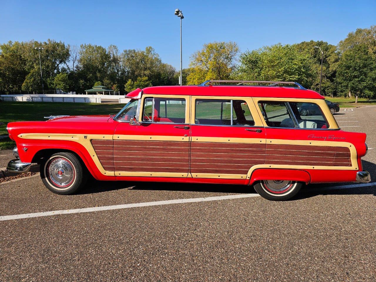 This rare and hard to find 1955 Ford County Squire Woody Wagon is ready to the road with new ownership. It is numbers matching, highly original, and has been very well cared for. This wagon has always been stored in a temperature-controlled storage and routinely maintained. Under the hood is a 272ci V8 that is paired to an automatic transmission and standard rear axle. It is equipped with power steering, manual drum brakes, dual exhaust, wood grain side trim, visor, fender skirts, dual mirrors, roof rack, bumper guards, 3rd row seating, stop light mirror, original wheel covers, new mufflers, white wall tires, carb recently rebuilt, recently rebuilt front steering, and new upholstery. The exterior shows good and has no rust, bubbling, or areas of concern and is painted in torch red. The body panels, lines, gaps, etc. are all in good condition. The chrome, stainless, and brightwork are all present and in good condition. The interior shows good and has no issues or concerns. The dash, door panels, carpet, headliner, etc. are all in good condition. All lights, turn signals, radio, wipers, heater, gauges, etc. are all in good working condition. The underbody shows just as nice as the rest of the vehicle. There is no rust, rot, soft spots, or areas of concern. This is a turnkey, rare classic that can be driven anywhere with no worries. We have a clean and clear title and have additional photos and video upon request. We can assist with financing, warranty, and worldwide shipping Check us out online: https://www.madmusclegarage.com View our full inventory: https://www.mmgclassiccars.com About Mad Muscle Garage: Discover Mad Muscle Garage, your ultimate destination for vintage and collector car aficionados. Immerse yourself in our array of professional, high-end services tailored to cater to both seasoned collectors and weekend enthusiasts. Explore our time-tested, globally renowned vehicle consignment program, guaranteeing your classic car's sale within 90 days, devoid of any upfront or concealed fees. Our vehicles find homes not just locally but also across state lines and overseas. Engage our certified vehicle appraisal services covering diverse makes, models, and years, spanning from bank/insurance market value assessments to instances of total loss. Experience our nationwide travel for third-party pre-purchase inspections, providing you unparalleled assurance when purchasing a vehicle unseen. Rely on our meticulously detailed inspection reports, accompanied by comprehensive narratives, abundant visual aids, including photos and videos, fostering your confidence in your purchase decision. Peruse our extensive online dealership showcasing a dynamic inventory of classic cars for sale, continually refreshed with new arrivals weekly. For specific requirements, leverage our vehicle locating service, ensuring your dream car becomes a reality. Mad Muscle Garage doesn't just stop at sales; we offer a spectrum of automotive services, from routine tune-ups to comprehensive rotisserie restorations, addressing any automotive need, big or small. Your journey into the world of classic cars starts here. Let Mad Muscle Garage create your next automotive memory! Contact Us: 952-220-2993 or matt@madmusclegarage.com