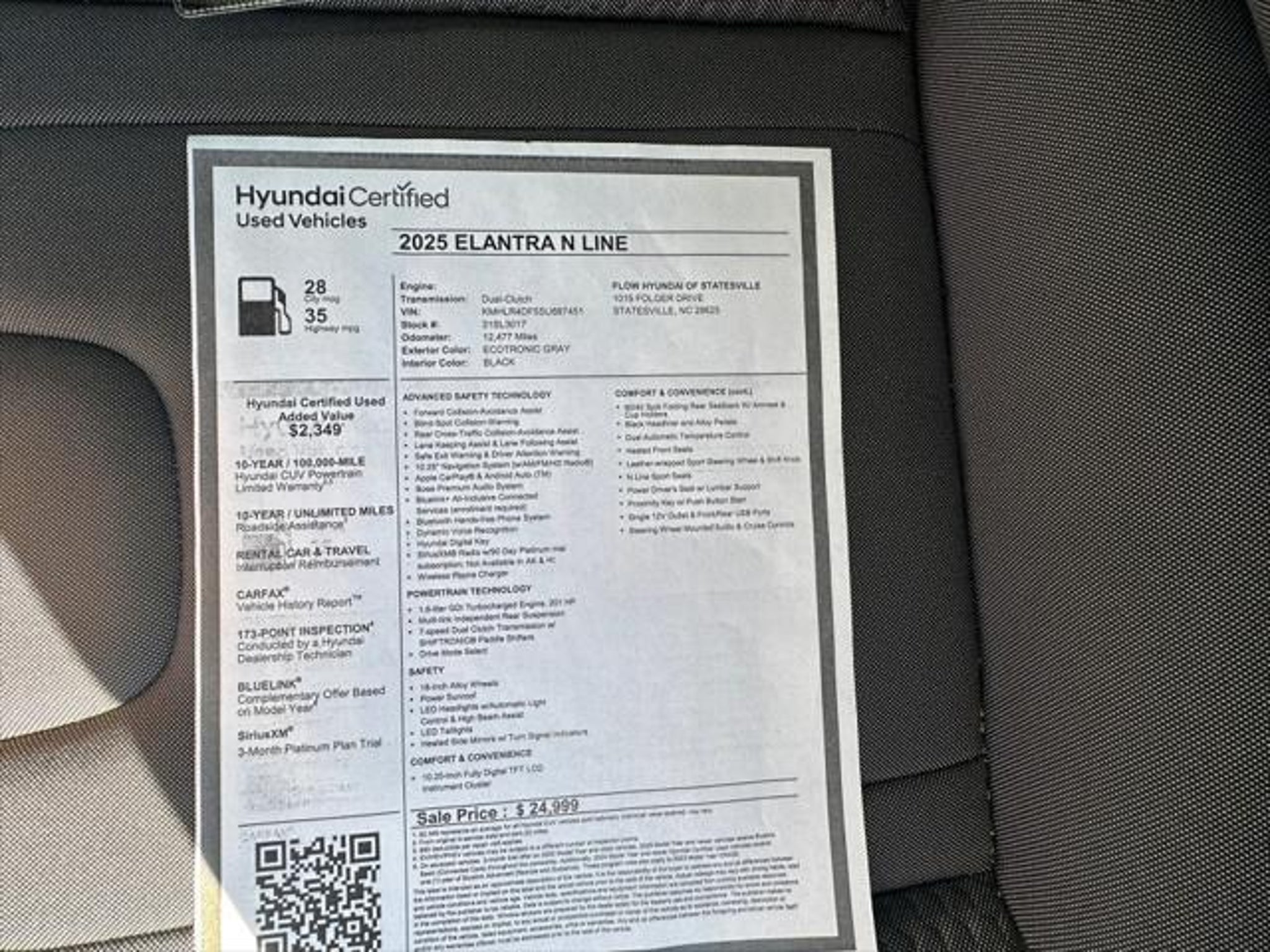 DEALER OWNED RETIRED SERVICE LOANER *** SAVE THOUSANDS BELOW MSRP*** GREAT SERVICE HISTORY ** SUPER LOW MILES ** CARFAX ONE OWNER ** HEATED SEATS ** BLUETOOTH HANDS FREE ** BACK UP CAMERA ** SUNROOF / MOONROOF ** NAVIGATION / GPS ** APPLE CAR PLAY ** ANDROID AUTO ** BLIND SPOT MONITOR / DRIVER ASSISTANCE PACKAGE ** PUSH BUTTON START ** REMOTE START ** NEW TIRES ** FACTORY MAINTENANCE UP TO DATE ** REMAINDER OF FACTORY WARRANTY ** PREMIUM WHEELS ** Navigation System. Certified. Hyundai Certified Used Vehicles Details: * Roadside Assistance * Includes 10-year/Unlimited Mileage Roadside Assistance with Rental Car and Trip Interruption Reimbursement; Please See Dealers for Specific Vehicle Eligibility Requirements. 10-Year/100 000 Mile Hybrid/EV Battery Warranty. 3-Months SiriusXM Trial Subscription. Complimentary 1 Year (Connected Care & Remote Pkgs). * Limited Warranty: 60 Month/60 000 Mile (whichever comes first) from original in-service date * Vehicle History * 173 Point Inspection * Powertrain Limited Warranty: 120 Month/100 000 Mile (whichever comes first) from original in-service date * Warranty Deductible: $50 ** All of our cars go through a comprehensive QRP Quality Renewal Process. Come check out Flow Hyundai of Statesvilles No haggle No Pressure Transparent Easy Fun car shopping experience!! We have the most professional and courteous sales staff in North Carolina. Call Internet Sales Dept at to set schedule a test drive or https:// . Thank you for allowing us to serve your automotive needs over the past 50 years.