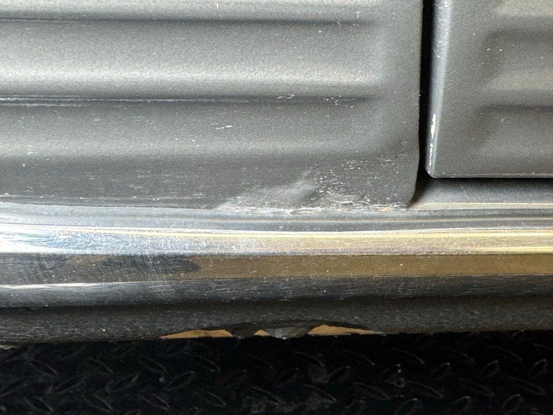 The well balanced body dimensions of the 450 look good in any color, and single stage Anthracite Gray is no exception. This car comes with a matching removable hardtop that provides all weather protection, and a nice black canvas top that provides spur of the moment, open air motoring. It can be tucked under a hard tonneau that is essentially seamless and maintains the flat plain profile between the straight shoulder lines. The offset wheel openings result in the rear wheel partially covered, but the 15-inch Mercedes Benz wheels are fully visible front and rear while the ribbed rocker panels under side molding is a trademark detail of the model, and the ribs continue to the front valance. Imperfections are limited to some bubbling on that rocker, and scuffs on a wheel.