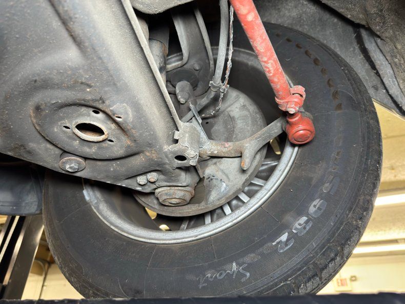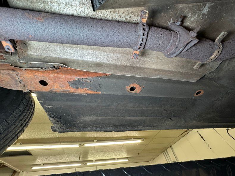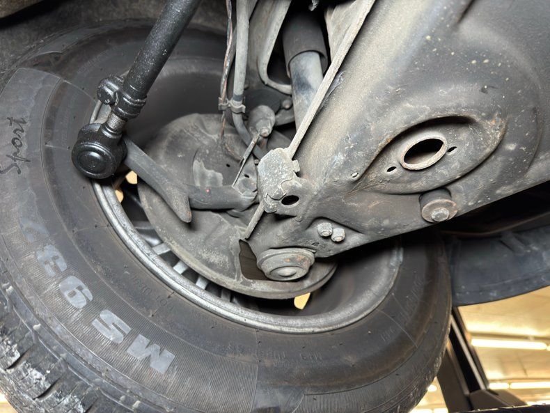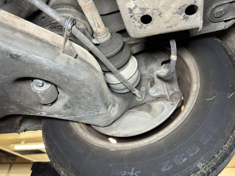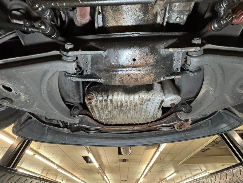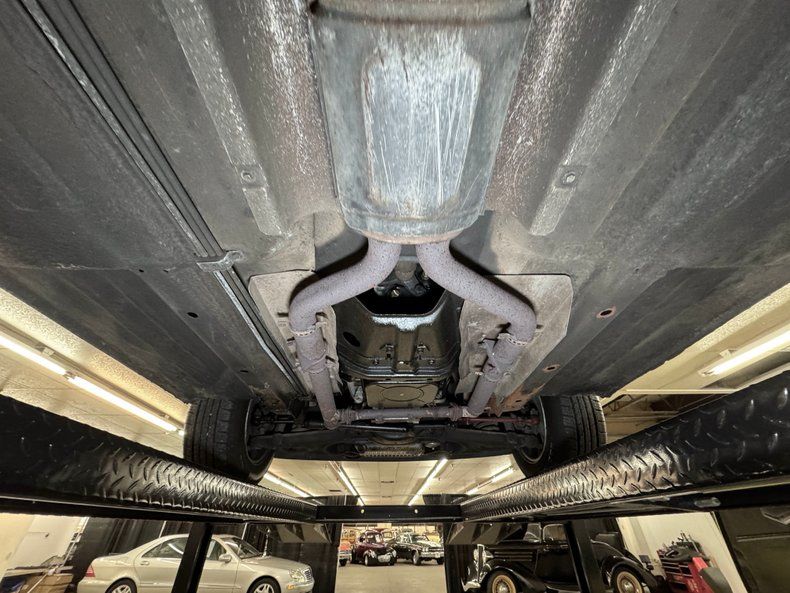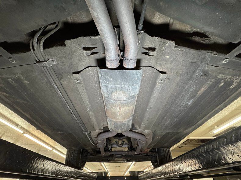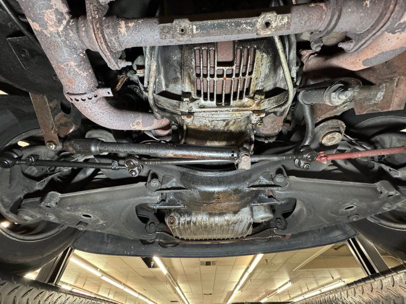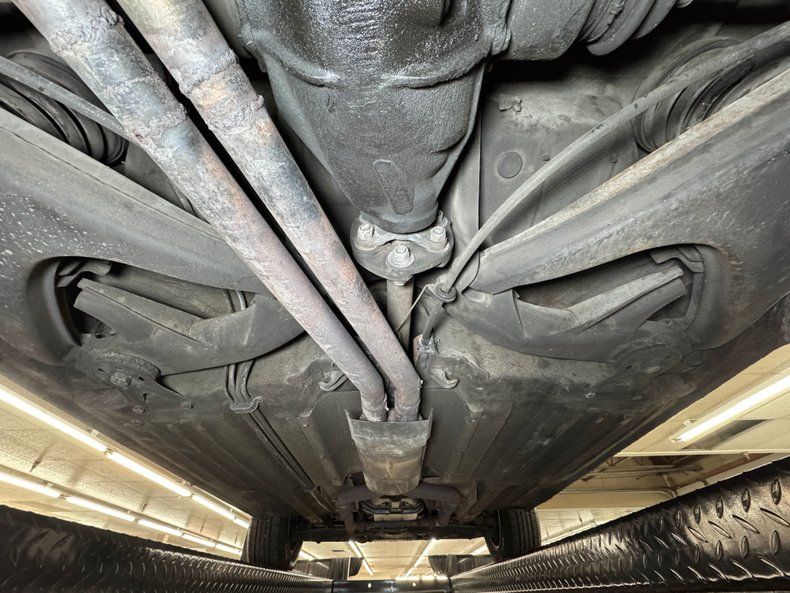 Some residual oil is noted on the rear differential and transmission pan with a touch of dampness on the oil pan as well. In general, we have driver quality conditions here with typical road grime, clear knuckles, and minimal surface rust. Independent coil spring suspension is front and rear and so are power disc brakes. Dual exhaust meets at the stock style muffler in pack and exude twin tips.