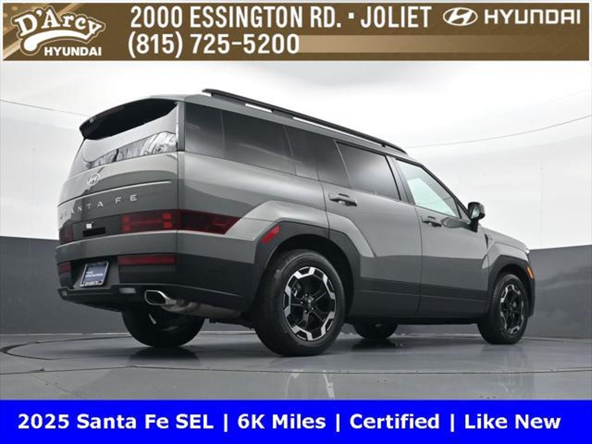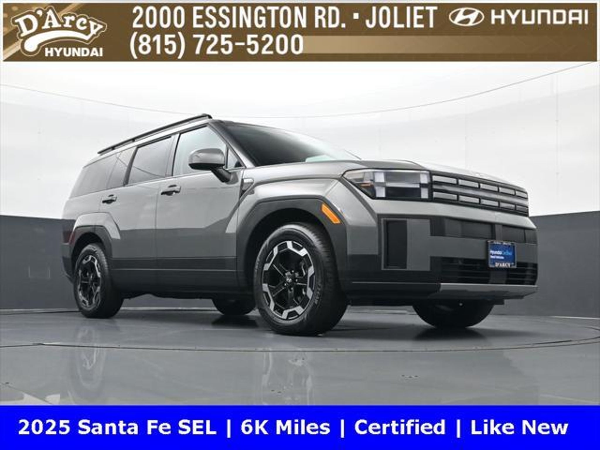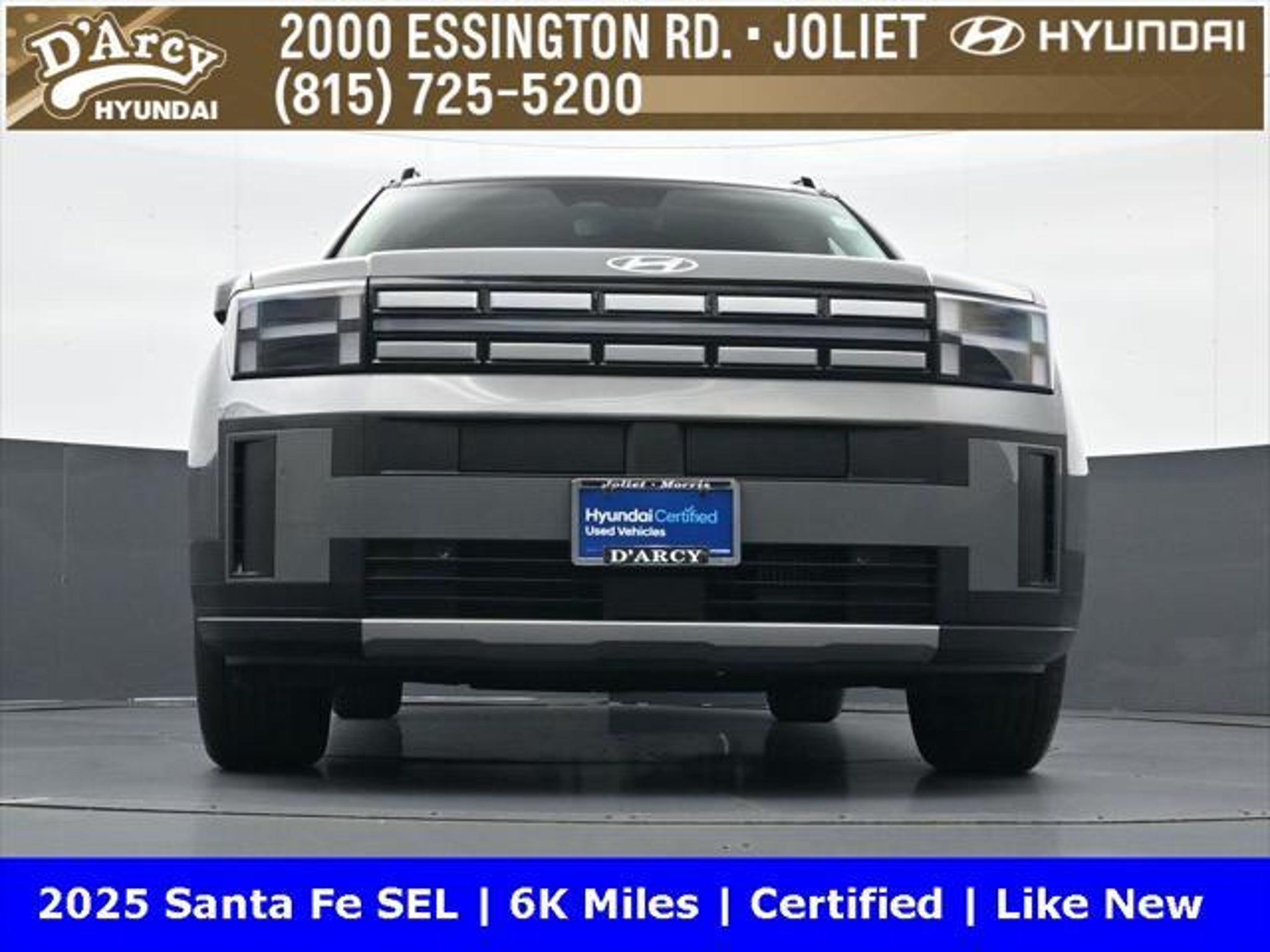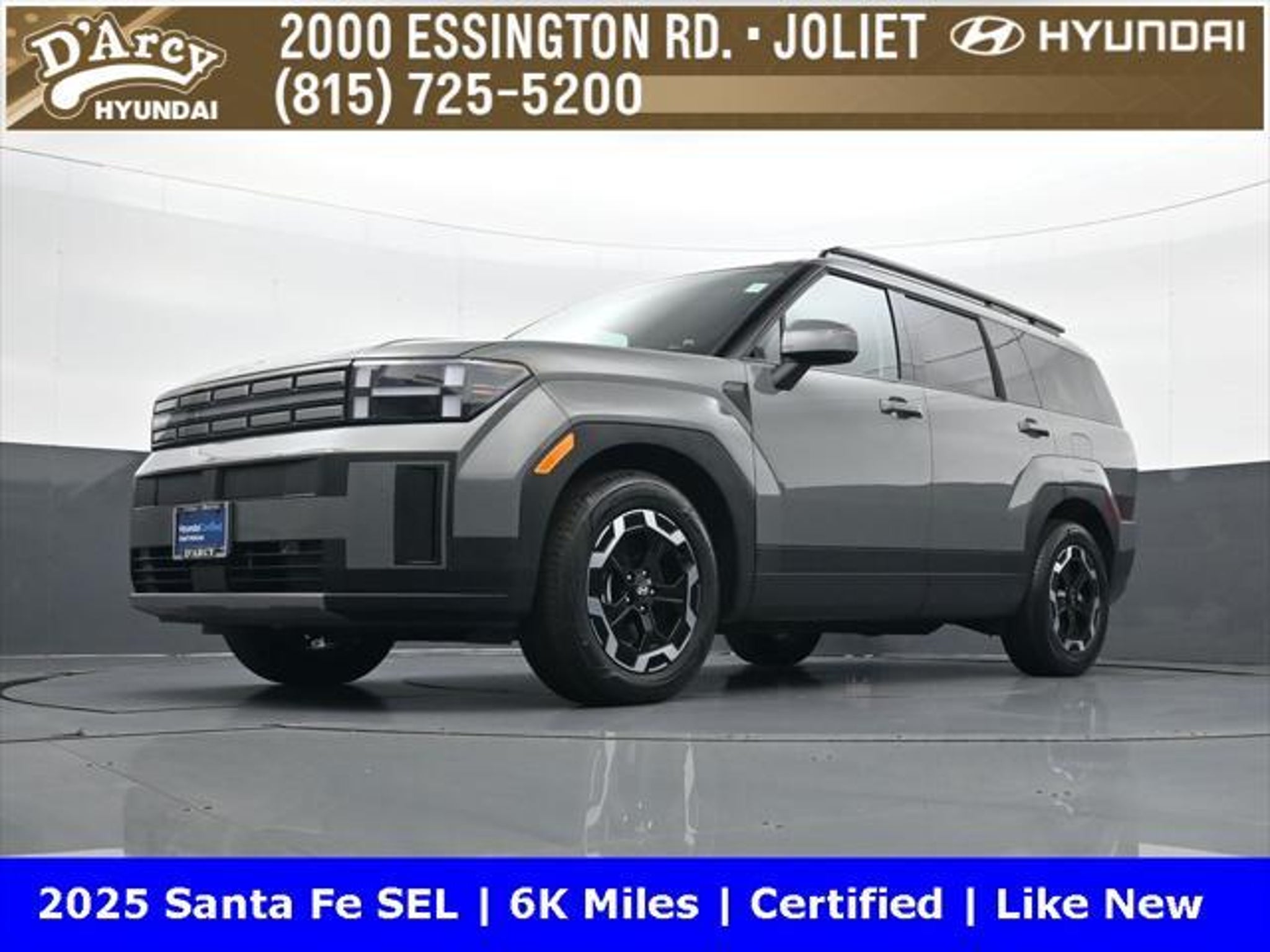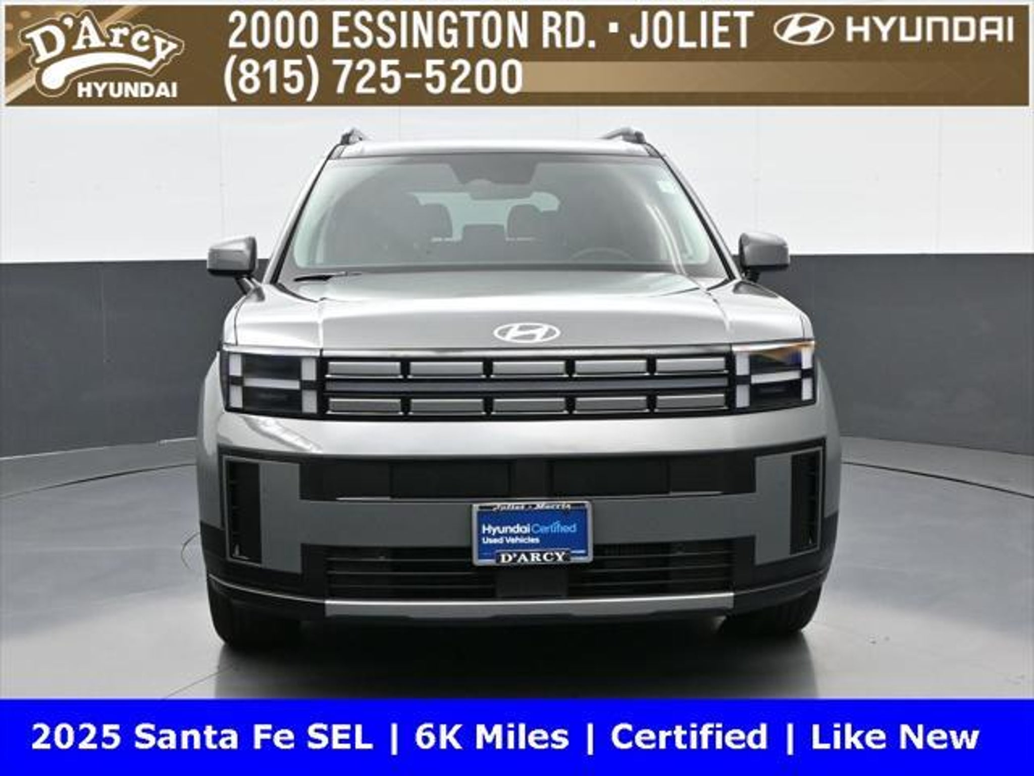 ONE OWNER LOCAL TRADE!, LOW MILES!, GREAT VEHICLE HISTORY!, REMAINING FULL FACTORY WARRANTY!, BOUGHT HERE SERVICED HERE!, HYUNDAI CERTIFIED!, FULLY SERVICED AND READY TO GO!. Certified. Hampton Gray 2025 Hyundai Santa Fe SEL FWD Shiftronic 2.5L I4 Hyundai Certified Used Vehicles Details: * Includes 10-year/Unlimited Mileage Roadside Assistance with Rental Car and Trip Interruption Reimbursement; Please See Dealers for Specific Vehicle Eligibility Requirements. 10-Year/100,000 Mile Hybrid/EV Battery Warranty. 3-Months SiriusXM Trial Subscription. Complimentary 1 Year (Connected Care & Remote Pkgs). * Powertrain Limited Warranty: 120 Month/100,000 Mile (whichever comes first) from original in-service date * Vehicle History * Roadside Assistance * Warranty Deductible: $50 * 173 Point Inspection * Limited Warranty: 60 Month/60,000 Mile (whichever comes first) from original in-service date Discover the D'Arcy Difference! We care - we are here and we are ready to help! Stop by today to see up to date information, including showroom and service hours, and how to make an appointment or schedule delivery. D'Arcy Motors has been serving Joliet and its surrounding communities for over 25 years. Our business philosophy, which is to sell cars one car at a time and to make the guest the most important part of the process, has remained the same since 1991. Contact us today to experience the D'Arcy Difference! Pulse® Safer Braking Technology for $399 added to all New and CPO"“ The rear-end collision deterrent that rapidly pulses your third brake light four times before going solid when you press the brake pedal. This feature enhances safety by helping alert trailing drivers. Discover the D'Arcy Difference! We care - we are here and we are ready to help! Stop by today to see up to date information, including showroom and service hours, and how to make an appointment or schedule delivery. D'Arcy Motors has been serving Joliet and its surrounding communities for over 25 years. Our business philosophy, which is to sell cars one car at a time and to make the guest the most important part of the process, has remained the same since 1991. Contact us today to experience the D'Arcy Difference! Odometer is 14548 miles below market average! 20/29 City/Highway MPG This 2025 Hyundai Santa Fe comes equipped with: Option Group 01, 18 x 7.5J Alloy Wheels, 3rd row seats: bench, 4-Wheel Disc Brakes, 6 Speakers, ABS brakes, Air Conditioning, All Season Fitted Liners, Alloy wheels, AM/FM radio: SiriusXM, Apple CarPlay & Android Auto, Auto High-beam Headlights, Automatic temperature control, Brake assist, Bumpers: body-color, Cargo Net, Delay-off headlights, Driver door bin, Driver vanity mirror, Dual front impact airbags, Dual front side impact airbags, Electronic Stability Control, Emergency communication system, Exterior Parking Camera Rear, First Aid Kit, Four wheel independent suspension, Front anti-roll bar, Front Bucket Seats, Front Center Armrest, Front dual zone A/C, Front reading lights, Fully automatic headlights, H-Tex Leatherette Seat Trim, Heated door mirrors, Heated Front Bucket Seats, Heated front seats, Illuminated entry, Knee airbag, Leather steering wheel, Low tire pressure warning, Occupant sensing airbag, Outside temperature display, Overhead airbag, Overhead console, Panic alarm, Passenger door bin, Passenger vanity mirror, Power door mirrors, Power driver seat, Power Liftgate, Power steering, Power windows, Radio: AM/FM/HD Display Audio, Rear anti-roll bar, Rear seat center armrest, Rear side impact airbag, Rear window defroster, Rear window wiper, Remote keyless entry, Roadside Assistance Kit, Security system, Speed control, Speed-sensing steering, Split folding rear seat, Spoiler, Steering wheel mounted audio controls, Tachometer, Telescoping steering wheel, Tilt steering wheel, Traction control, Trip computer, Turn signal indicator mirrors, and Variably intermittent w