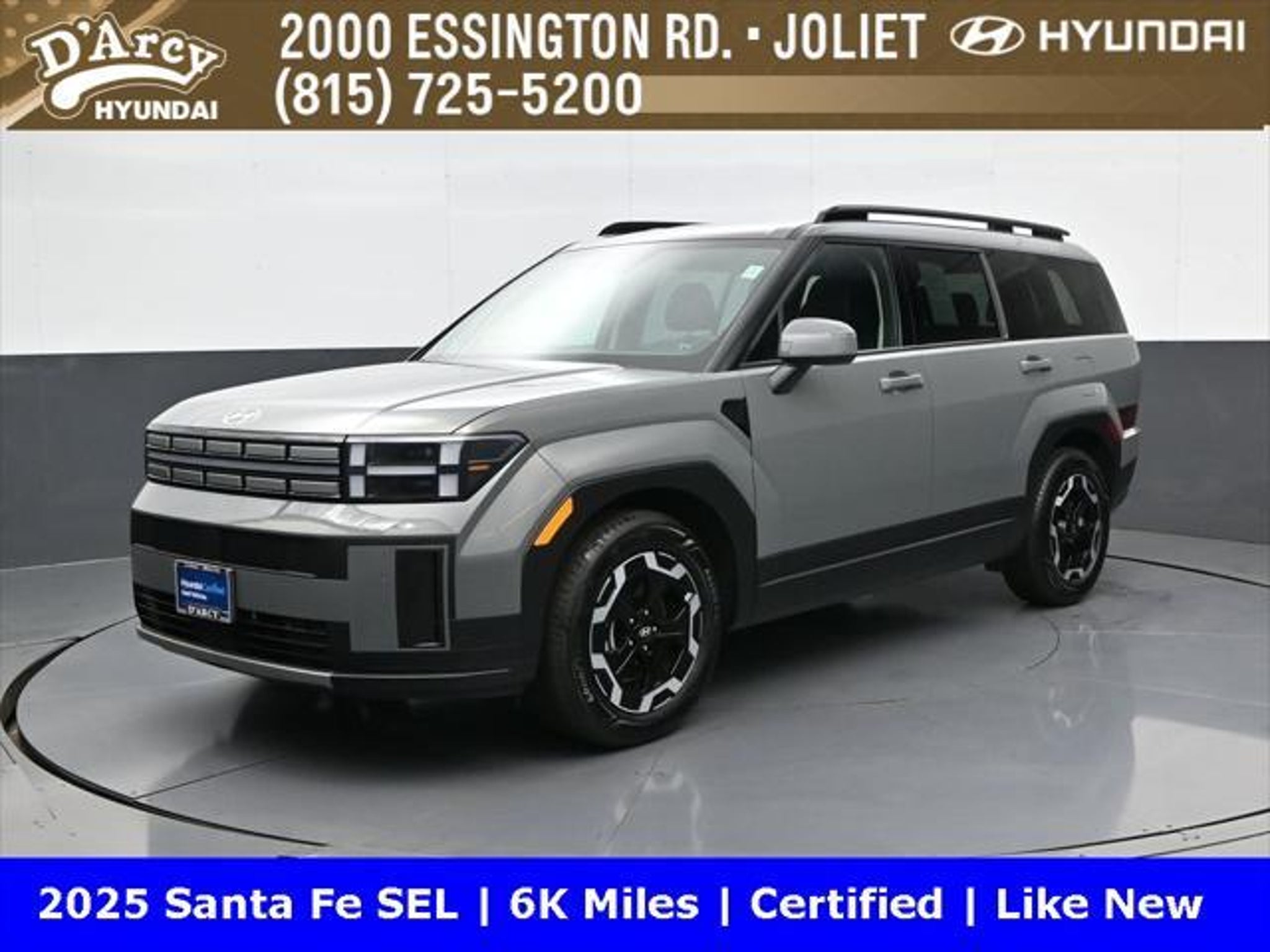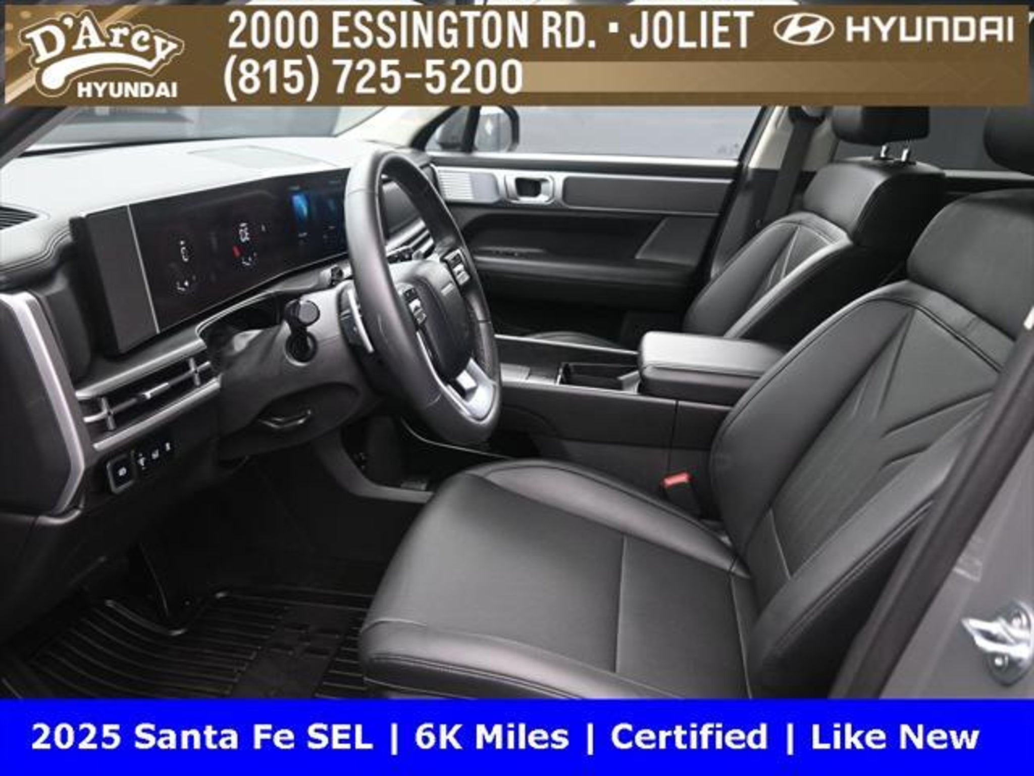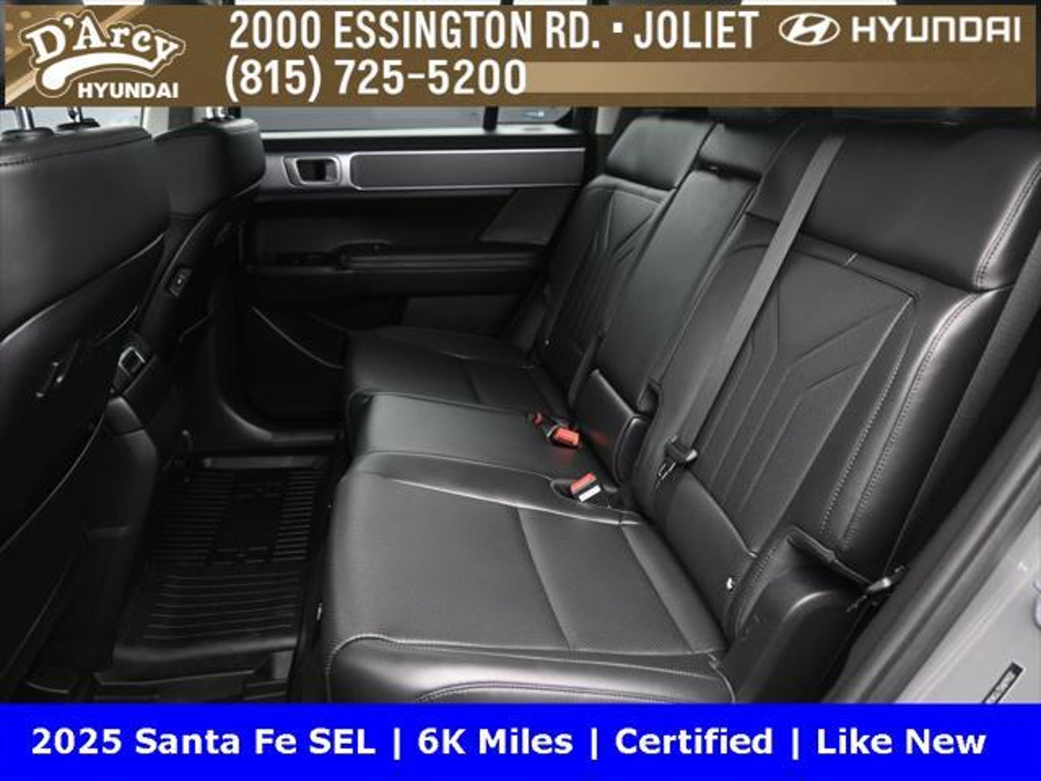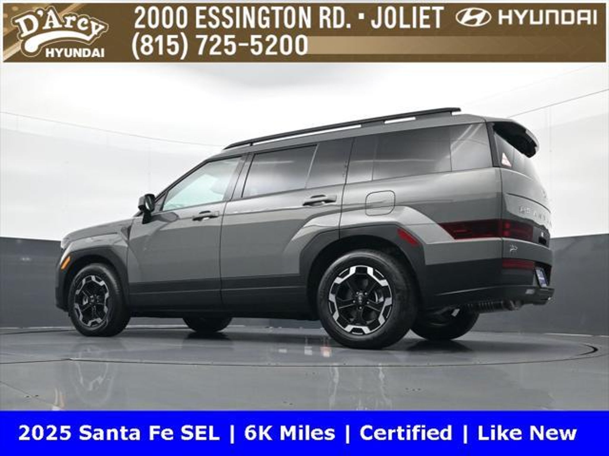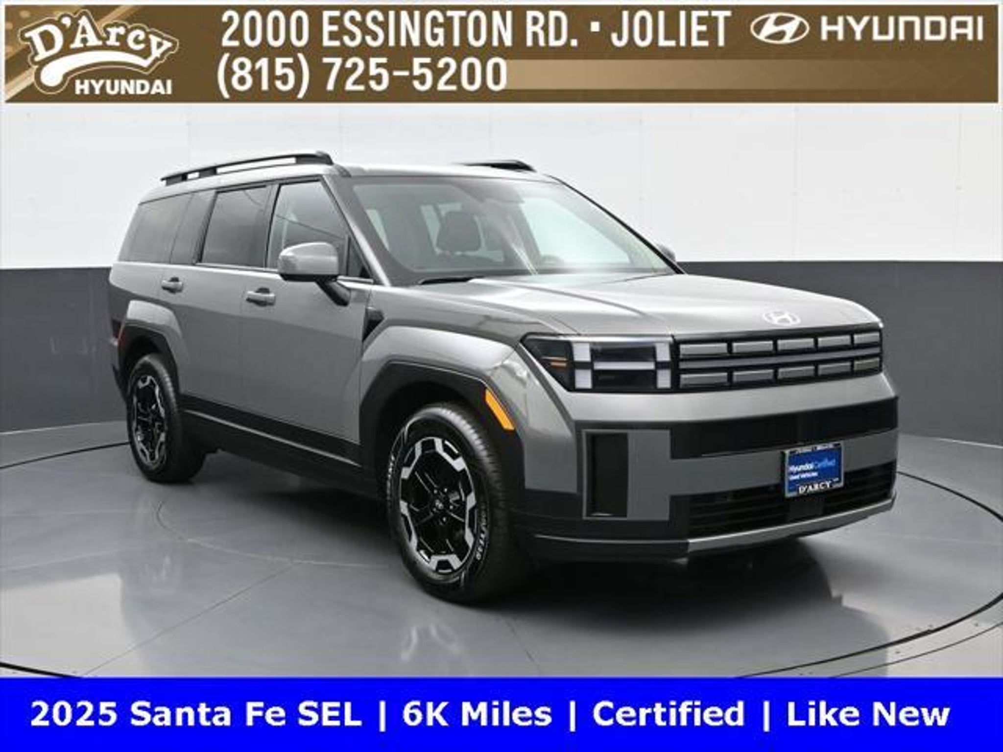 ONE OWNER LOCAL TRADE!, LOW MILES!, GREAT VEHICLE HISTORY!, REMAINING FULL FACTORY WARRANTY!, BOUGHT HERE SERVICED HERE!, HYUNDAI CERTIFIED!, FULLY SERVICED AND READY TO GO!. Certified. Hampton Gray 2025 Hyundai Santa Fe SEL FWD Shiftronic 2.5L I4 Hyundai Certified Used Vehicles Details: * Includes 10-year/Unlimited Mileage Roadside Assistance with Rental Car and Trip Interruption Reimbursement; Please See Dealers for Specific Vehicle Eligibility Requirements. 10-Year/100,000 Mile Hybrid/EV Battery Warranty. 3-Months SiriusXM Trial Subscription. Complimentary 1 Year (Connected Care & Remote Pkgs). * Powertrain Limited Warranty: 120 Month/100,000 Mile (whichever comes first) from original in-service date * Vehicle History * Roadside Assistance * Warranty Deductible: $50 * 173 Point Inspection * Limited Warranty: 60 Month/60,000 Mile (whichever comes first) from original in-service date Discover the D'Arcy Difference! We care - we are here and we are ready to help! Stop by today to see up to date information, including showroom and service hours, and how to make an appointment or schedule delivery. D'Arcy Motors has been serving Joliet and its surrounding communities for over 25 years. Our business philosophy, which is to sell cars one car at a time and to make the guest the most important part of the process, has remained the same since 1991. Contact us today to experience the D'Arcy Difference! Pulse® Safer Braking Technology for $399 added to all New and CPO"“ The rear-end collision deterrent that rapidly pulses your third brake light four times before going solid when you press the brake pedal. This feature enhances safety by helping alert trailing drivers. Discover the D'Arcy Difference! We care - we are here and we are ready to help! Stop by today to see up to date information, including showroom and service hours, and how to make an appointment or schedule delivery. D'Arcy Motors has been serving Joliet and its surrounding communities for over 25 years. Our business philosophy, which is to sell cars one car at a time and to make the guest the most important part of the process, has remained the same since 1991. Contact us today to experience the D'Arcy Difference! Odometer is 14548 miles below market average! 20/29 City/Highway MPG This 2025 Hyundai Santa Fe comes equipped with: Option Group 01, 18 x 7.5J Alloy Wheels, 3rd row seats: bench, 4-Wheel Disc Brakes, 6 Speakers, ABS brakes, Air Conditioning, All Season Fitted Liners, Alloy wheels, AM/FM radio: SiriusXM, Apple CarPlay & Android Auto, Auto High-beam Headlights, Automatic temperature control, Brake assist, Bumpers: body-color, Cargo Net, Delay-off headlights, Driver door bin, Driver vanity mirror, Dual front impact airbags, Dual front side impact airbags, Electronic Stability Control, Emergency communication system, Exterior Parking Camera Rear, First Aid Kit, Four wheel independent suspension, Front anti-roll bar, Front Bucket Seats, Front Center Armrest, Front dual zone A/C, Front reading lights, Fully automatic headlights, H-Tex Leatherette Seat Trim, Heated door mirrors, Heated Front Bucket Seats, Heated front seats, Illuminated entry, Knee airbag, Leather steering wheel, Low tire pressure warning, Occupant sensing airbag, Outside temperature display, Overhead airbag, Overhead console, Panic alarm, Passenger door bin, Passenger vanity mirror, Power door mirrors, Power driver seat, Power Liftgate, Power steering, Power windows, Radio: AM/FM/HD Display Audio, Rear anti-roll bar, Rear seat center armrest, Rear side impact airbag, Rear window defroster, Rear window wiper, Remote keyless entry, Roadside Assistance Kit, Security system, Speed control, Speed-sensing steering, Split folding rear seat, Spoiler, Steering wheel mounted audio controls, Tachometer, Telescoping steering wheel, Tilt steering wheel, Traction control, Trip computer, Turn signal indicator mirrors, and Variably intermittent w