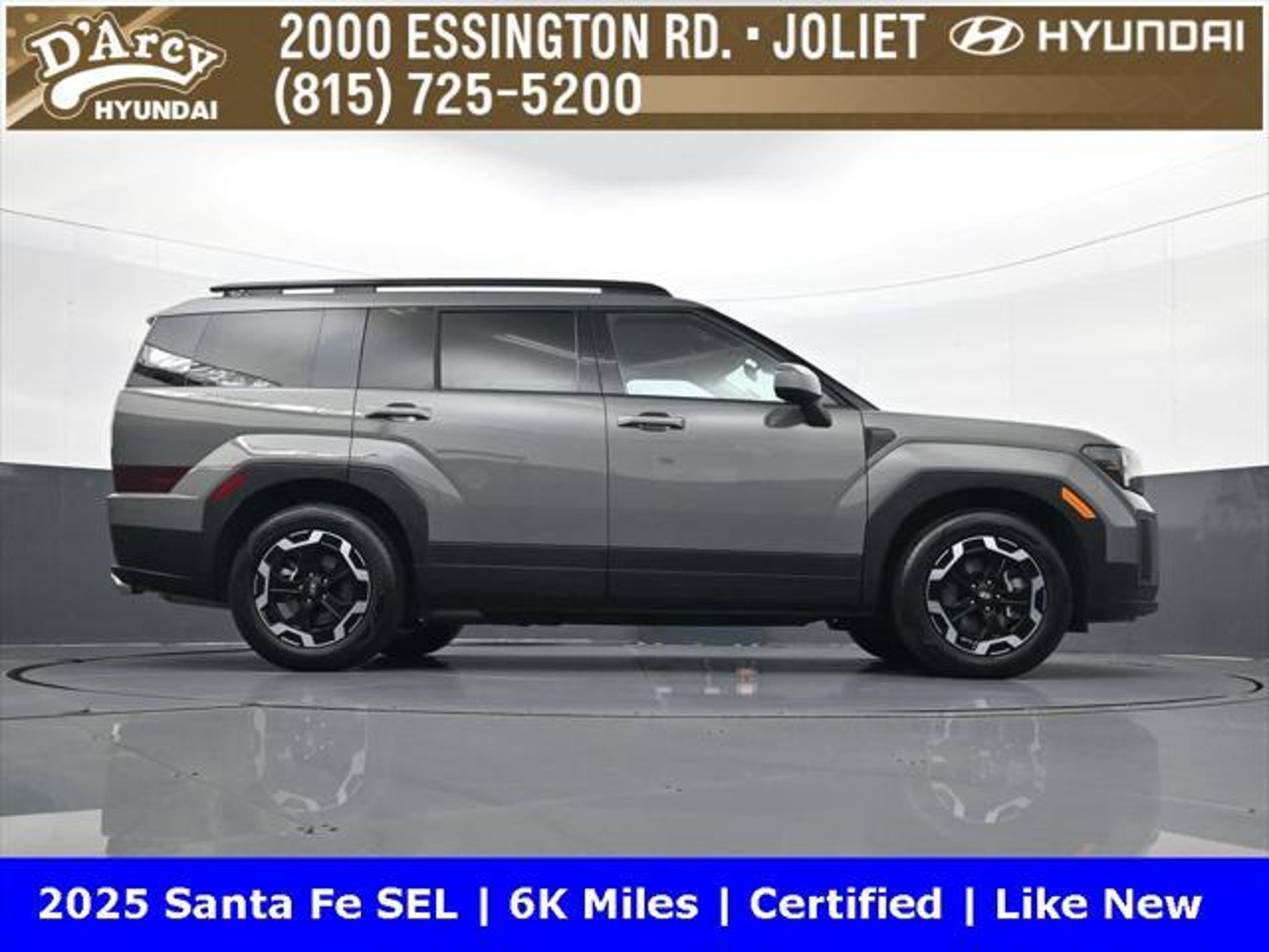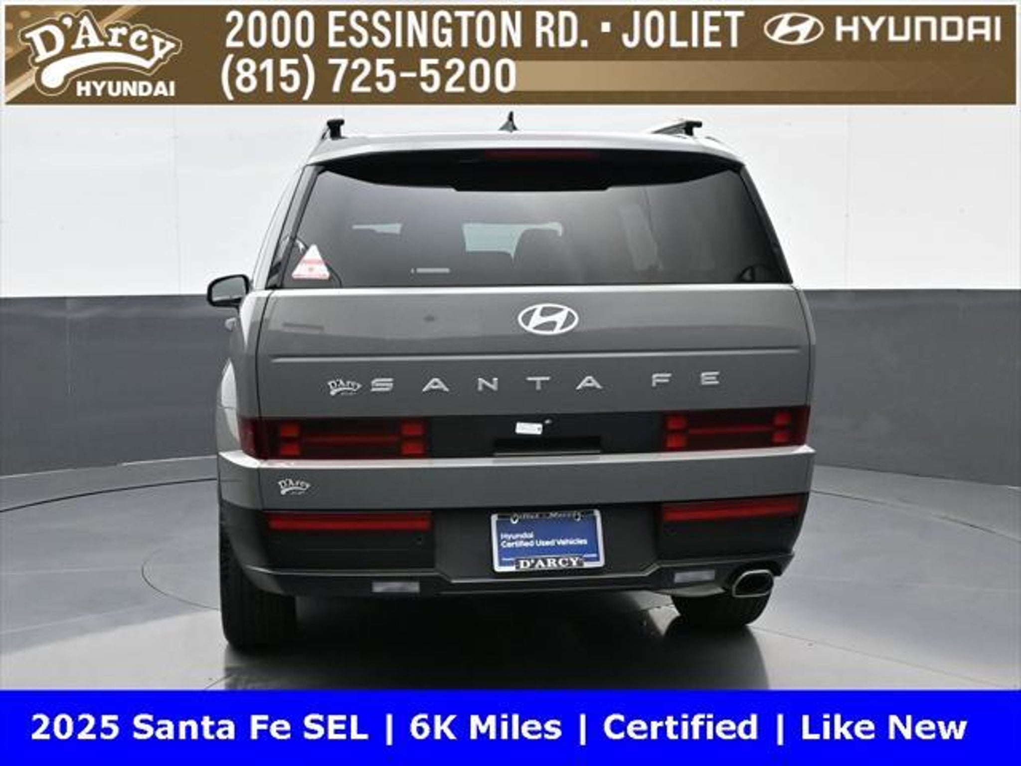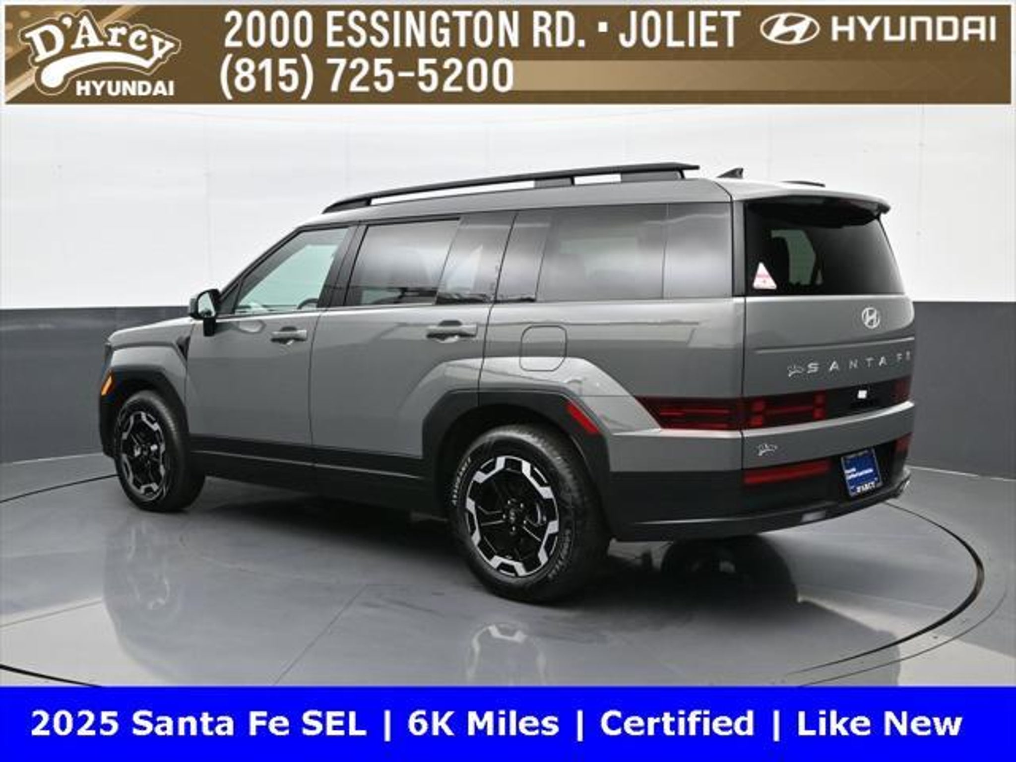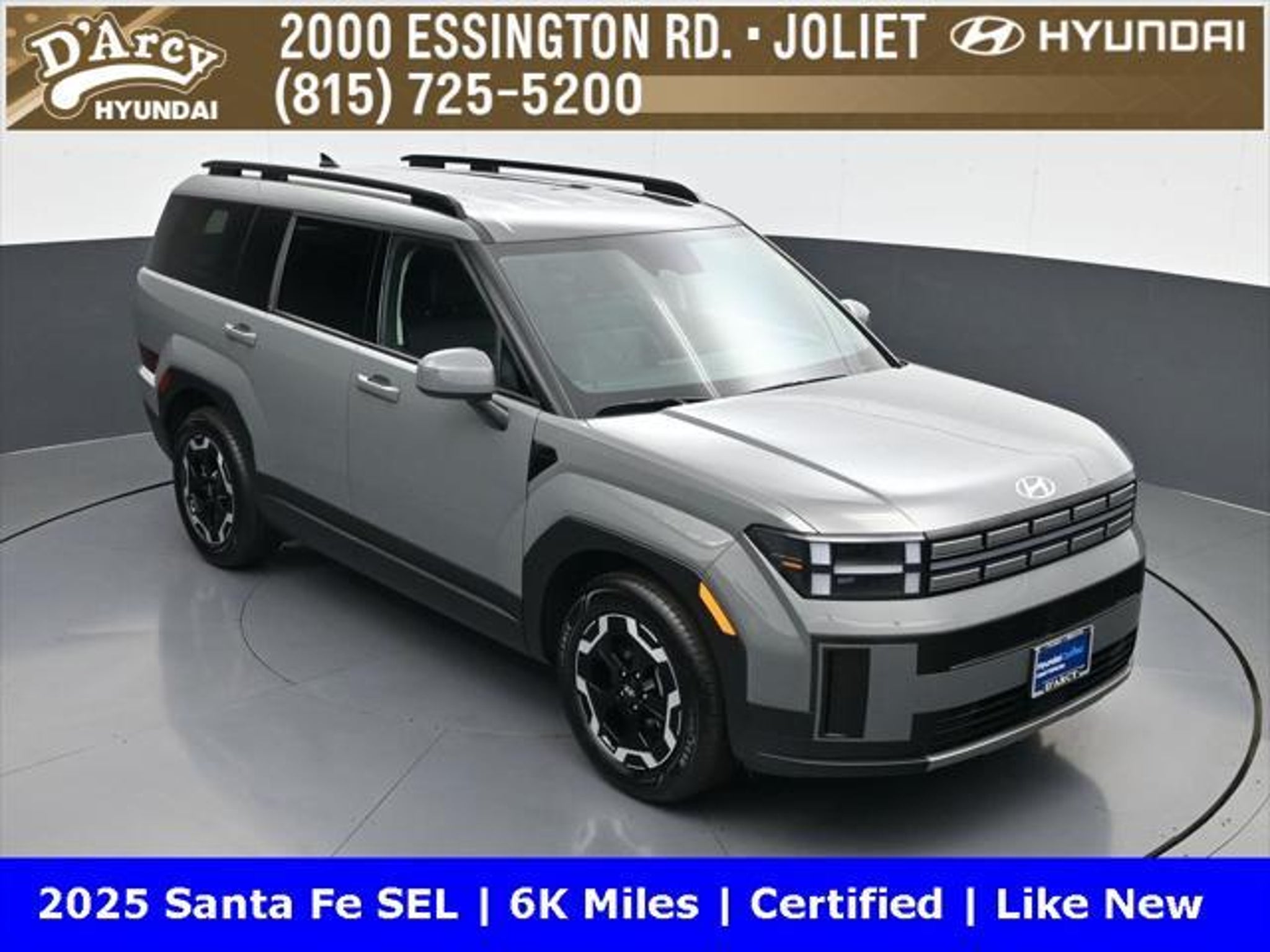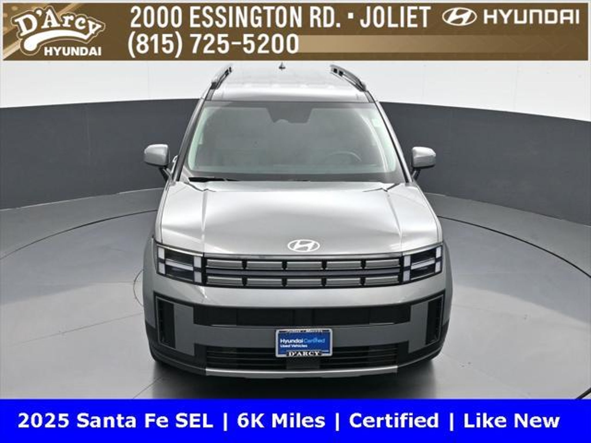 ONE OWNER LOCAL TRADE!, LOW MILES!, GREAT VEHICLE HISTORY!, REMAINING FULL FACTORY WARRANTY!, BOUGHT HERE SERVICED HERE!, HYUNDAI CERTIFIED!, FULLY SERVICED AND READY TO GO!. Certified. Hampton Gray 2025 Hyundai Santa Fe SEL FWD Shiftronic 2.5L I4 Hyundai Certified Used Vehicles Details: * Includes 10-year/Unlimited Mileage Roadside Assistance with Rental Car and Trip Interruption Reimbursement; Please See Dealers for Specific Vehicle Eligibility Requirements. 10-Year/100,000 Mile Hybrid/EV Battery Warranty. 3-Months SiriusXM Trial Subscription. Complimentary 1 Year (Connected Care & Remote Pkgs). * Powertrain Limited Warranty: 120 Month/100,000 Mile (whichever comes first) from original in-service date * Vehicle History * Roadside Assistance * Warranty Deductible: $50 * 173 Point Inspection * Limited Warranty: 60 Month/60,000 Mile (whichever comes first) from original in-service date Discover the D'Arcy Difference! We care - we are here and we are ready to help! Stop by today to see up to date information, including showroom and service hours, and how to make an appointment or schedule delivery. D'Arcy Motors has been serving Joliet and its surrounding communities for over 25 years. Our business philosophy, which is to sell cars one car at a time and to make the guest the most important part of the process, has remained the same since 1991. Contact us today to experience the D'Arcy Difference! Pulse® Safer Braking Technology for $399 added to all New and CPO"“ The rear-end collision deterrent that rapidly pulses your third brake light four times before going solid when you press the brake pedal. This feature enhances safety by helping alert trailing drivers. Discover the D'Arcy Difference! We care - we are here and we are ready to help! Stop by today to see up to date information, including showroom and service hours, and how to make an appointment or schedule delivery. D'Arcy Motors has been serving Joliet and its surrounding communities for over 25 years. Our business philosophy, which is to sell cars one car at a time and to make the guest the most important part of the process, has remained the same since 1991. Contact us today to experience the D'Arcy Difference! Odometer is 14548 miles below market average! 20/29 City/Highway MPG This 2025 Hyundai Santa Fe comes equipped with: Option Group 01, 18 x 7.5J Alloy Wheels, 3rd row seats: bench, 4-Wheel Disc Brakes, 6 Speakers, ABS brakes, Air Conditioning, All Season Fitted Liners, Alloy wheels, AM/FM radio: SiriusXM, Apple CarPlay & Android Auto, Auto High-beam Headlights, Automatic temperature control, Brake assist, Bumpers: body-color, Cargo Net, Delay-off headlights, Driver door bin, Driver vanity mirror, Dual front impact airbags, Dual front side impact airbags, Electronic Stability Control, Emergency communication system, Exterior Parking Camera Rear, First Aid Kit, Four wheel independent suspension, Front anti-roll bar, Front Bucket Seats, Front Center Armrest, Front dual zone A/C, Front reading lights, Fully automatic headlights, H-Tex Leatherette Seat Trim, Heated door mirrors, Heated Front Bucket Seats, Heated front seats, Illuminated entry, Knee airbag, Leather steering wheel, Low tire pressure warning, Occupant sensing airbag, Outside temperature display, Overhead airbag, Overhead console, Panic alarm, Passenger door bin, Passenger vanity mirror, Power door mirrors, Power driver seat, Power Liftgate, Power steering, Power windows, Radio: AM/FM/HD Display Audio, Rear anti-roll bar, Rear seat center armrest, Rear side impact airbag, Rear window defroster, Rear window wiper, Remote keyless entry, Roadside Assistance Kit, Security system, Speed control, Speed-sensing steering, Split folding rear seat, Spoiler, Steering wheel mounted audio controls, Tachometer, Telescoping steering wheel, Tilt steering wheel, Traction control, Trip computer, Turn signal indicator mirrors, and Variably intermittent w