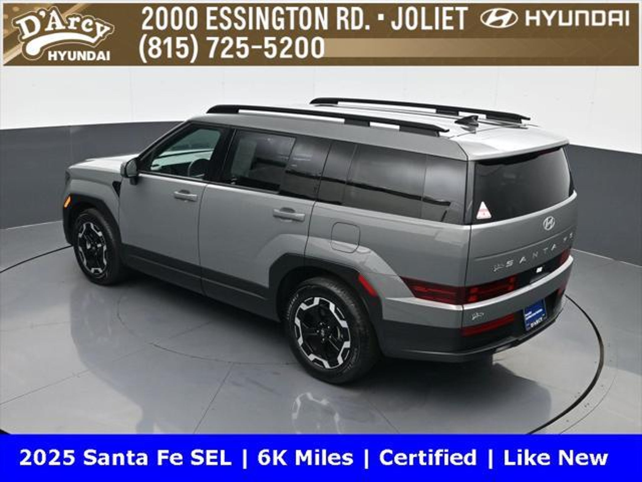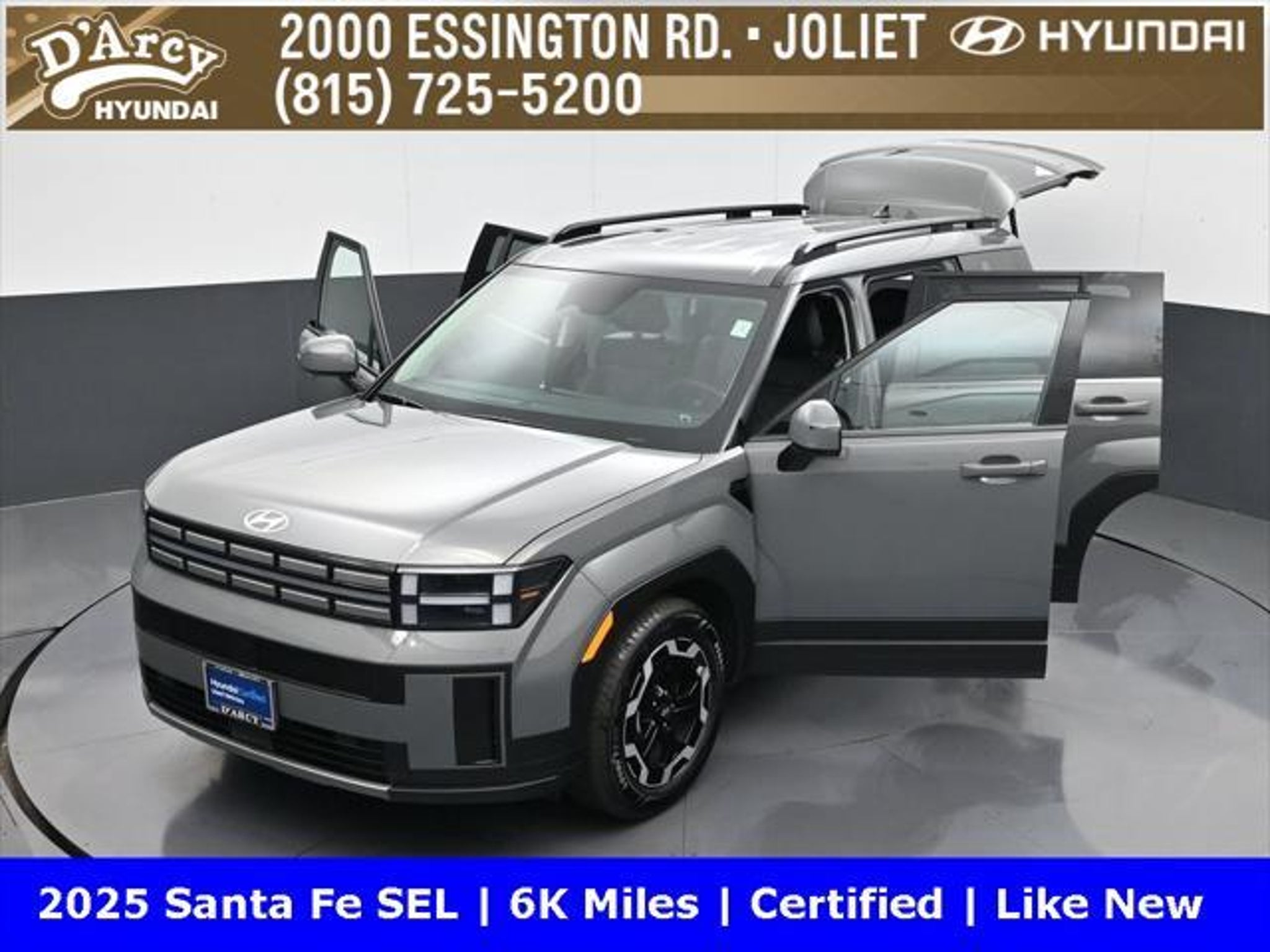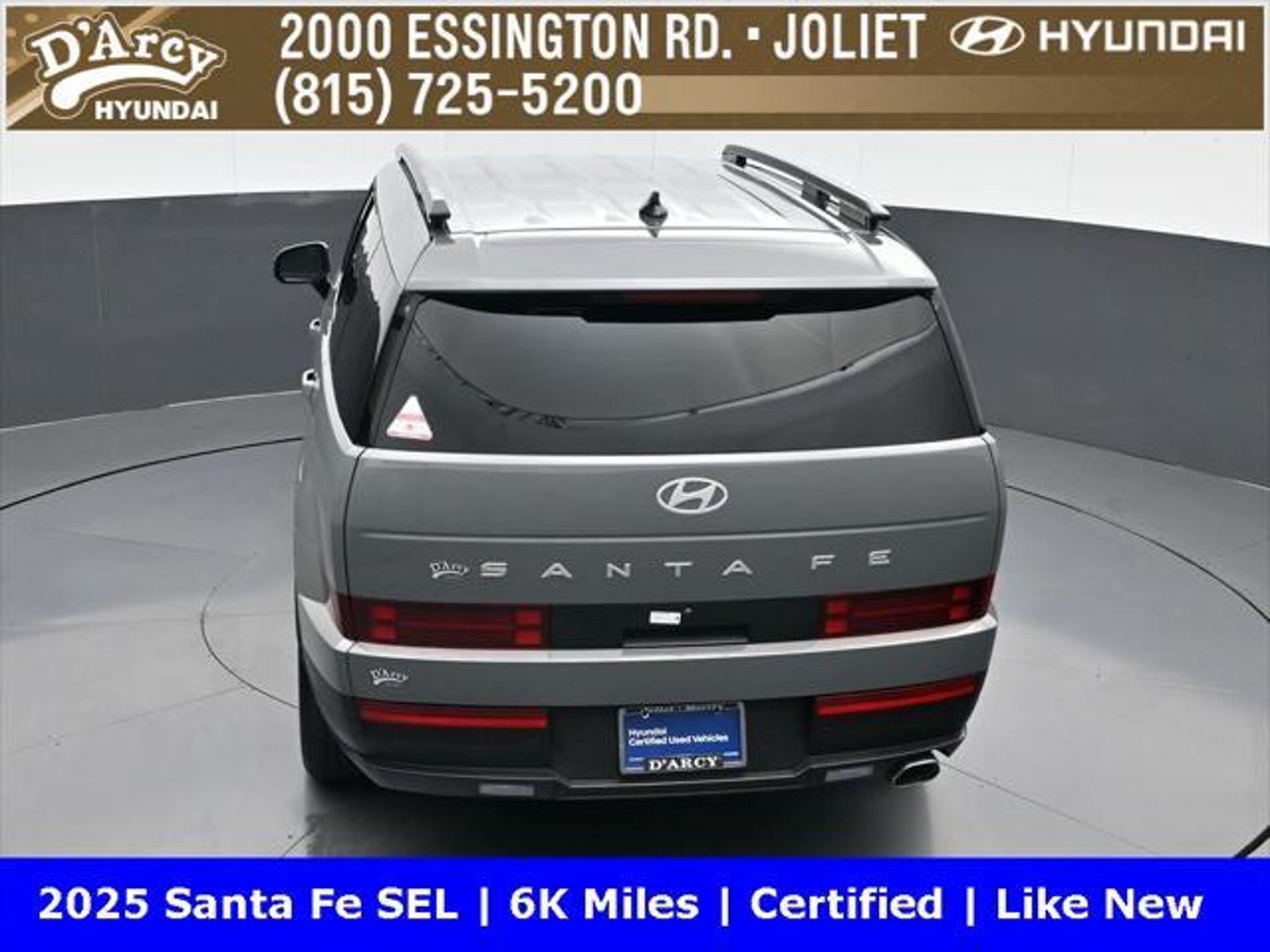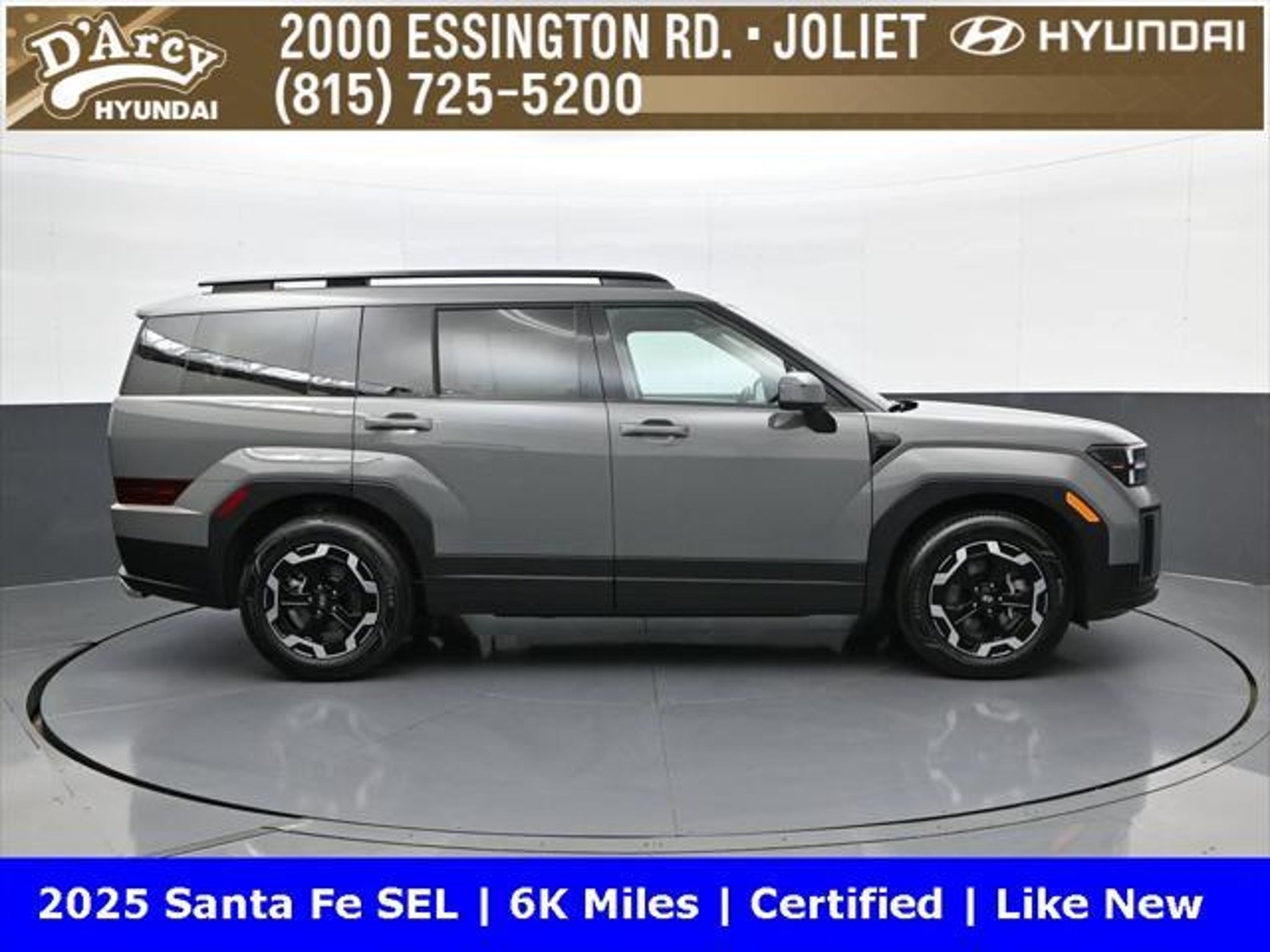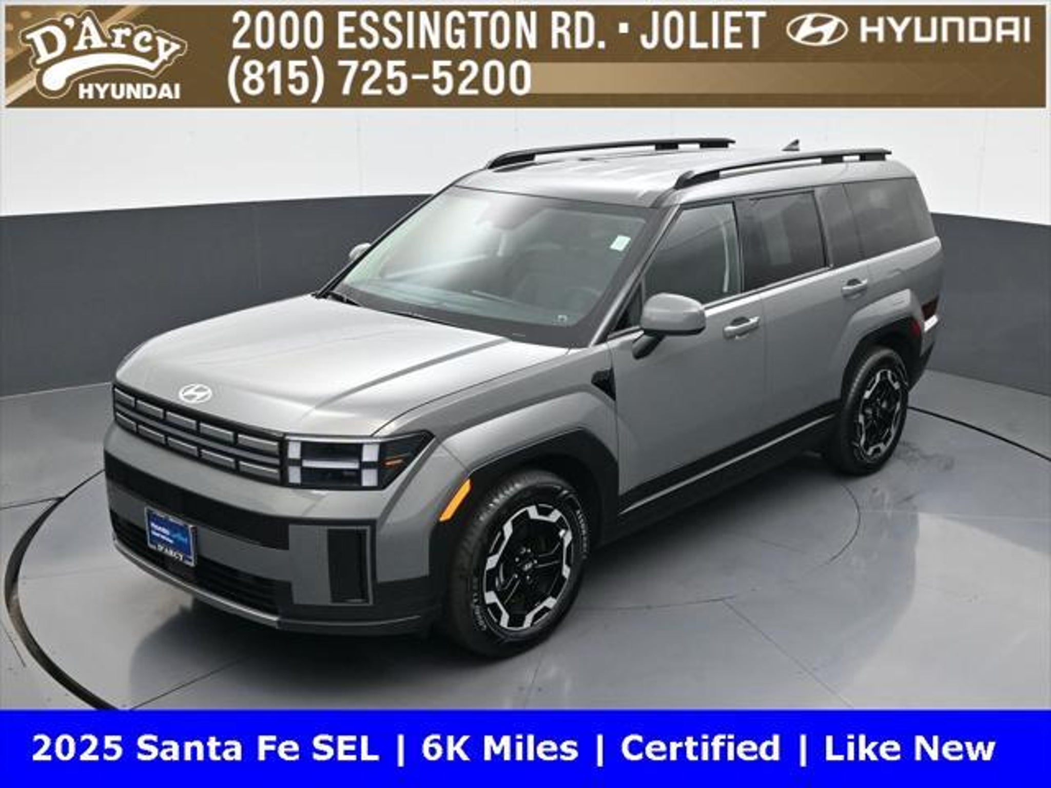 ONE OWNER LOCAL TRADE!, LOW MILES!, GREAT VEHICLE HISTORY!, REMAINING FULL FACTORY WARRANTY!, BOUGHT HERE SERVICED HERE!, HYUNDAI CERTIFIED!, FULLY SERVICED AND READY TO GO!. Certified. Hampton Gray 2025 Hyundai Santa Fe SEL FWD Shiftronic 2.5L I4 Hyundai Certified Used Vehicles Details: * Includes 10-year/Unlimited Mileage Roadside Assistance with Rental Car and Trip Interruption Reimbursement; Please See Dealers for Specific Vehicle Eligibility Requirements. 10-Year/100,000 Mile Hybrid/EV Battery Warranty. 3-Months SiriusXM Trial Subscription. Complimentary 1 Year (Connected Care & Remote Pkgs). * Powertrain Limited Warranty: 120 Month/100,000 Mile (whichever comes first) from original in-service date * Vehicle History * Roadside Assistance * Warranty Deductible: $50 * 173 Point Inspection * Limited Warranty: 60 Month/60,000 Mile (whichever comes first) from original in-service date Discover the D'Arcy Difference! We care - we are here and we are ready to help! Stop by today to see up to date information, including showroom and service hours, and how to make an appointment or schedule delivery. D'Arcy Motors has been serving Joliet and its surrounding communities for over 25 years. Our business philosophy, which is to sell cars one car at a time and to make the guest the most important part of the process, has remained the same since 1991. Contact us today to experience the D'Arcy Difference! Pulse® Safer Braking Technology for $399 added to all New and CPO"“ The rear-end collision deterrent that rapidly pulses your third brake light four times before going solid when you press the brake pedal. This feature enhances safety by helping alert trailing drivers. Discover the D'Arcy Difference! We care - we are here and we are ready to help! Stop by today to see up to date information, including showroom and service hours, and how to make an appointment or schedule delivery. D'Arcy Motors has been serving Joliet and its surrounding communities for over 25 years. Our business philosophy, which is to sell cars one car at a time and to make the guest the most important part of the process, has remained the same since 1991. Contact us today to experience the D'Arcy Difference! Odometer is 14548 miles below market average! 20/29 City/Highway MPG This 2025 Hyundai Santa Fe comes equipped with: Option Group 01, 18 x 7.5J Alloy Wheels, 3rd row seats: bench, 4-Wheel Disc Brakes, 6 Speakers, ABS brakes, Air Conditioning, All Season Fitted Liners, Alloy wheels, AM/FM radio: SiriusXM, Apple CarPlay & Android Auto, Auto High-beam Headlights, Automatic temperature control, Brake assist, Bumpers: body-color, Cargo Net, Delay-off headlights, Driver door bin, Driver vanity mirror, Dual front impact airbags, Dual front side impact airbags, Electronic Stability Control, Emergency communication system, Exterior Parking Camera Rear, First Aid Kit, Four wheel independent suspension, Front anti-roll bar, Front Bucket Seats, Front Center Armrest, Front dual zone A/C, Front reading lights, Fully automatic headlights, H-Tex Leatherette Seat Trim, Heated door mirrors, Heated Front Bucket Seats, Heated front seats, Illuminated entry, Knee airbag, Leather steering wheel, Low tire pressure warning, Occupant sensing airbag, Outside temperature display, Overhead airbag, Overhead console, Panic alarm, Passenger door bin, Passenger vanity mirror, Power door mirrors, Power driver seat, Power Liftgate, Power steering, Power windows, Radio: AM/FM/HD Display Audio, Rear anti-roll bar, Rear seat center armrest, Rear side impact airbag, Rear window defroster, Rear window wiper, Remote keyless entry, Roadside Assistance Kit, Security system, Speed control, Speed-sensing steering, Split folding rear seat, Spoiler, Steering wheel mounted audio controls, Tachometer, Telescoping steering wheel, Tilt steering wheel, Traction control, Trip computer, Turn signal indicator mirrors, and Variably intermittent w