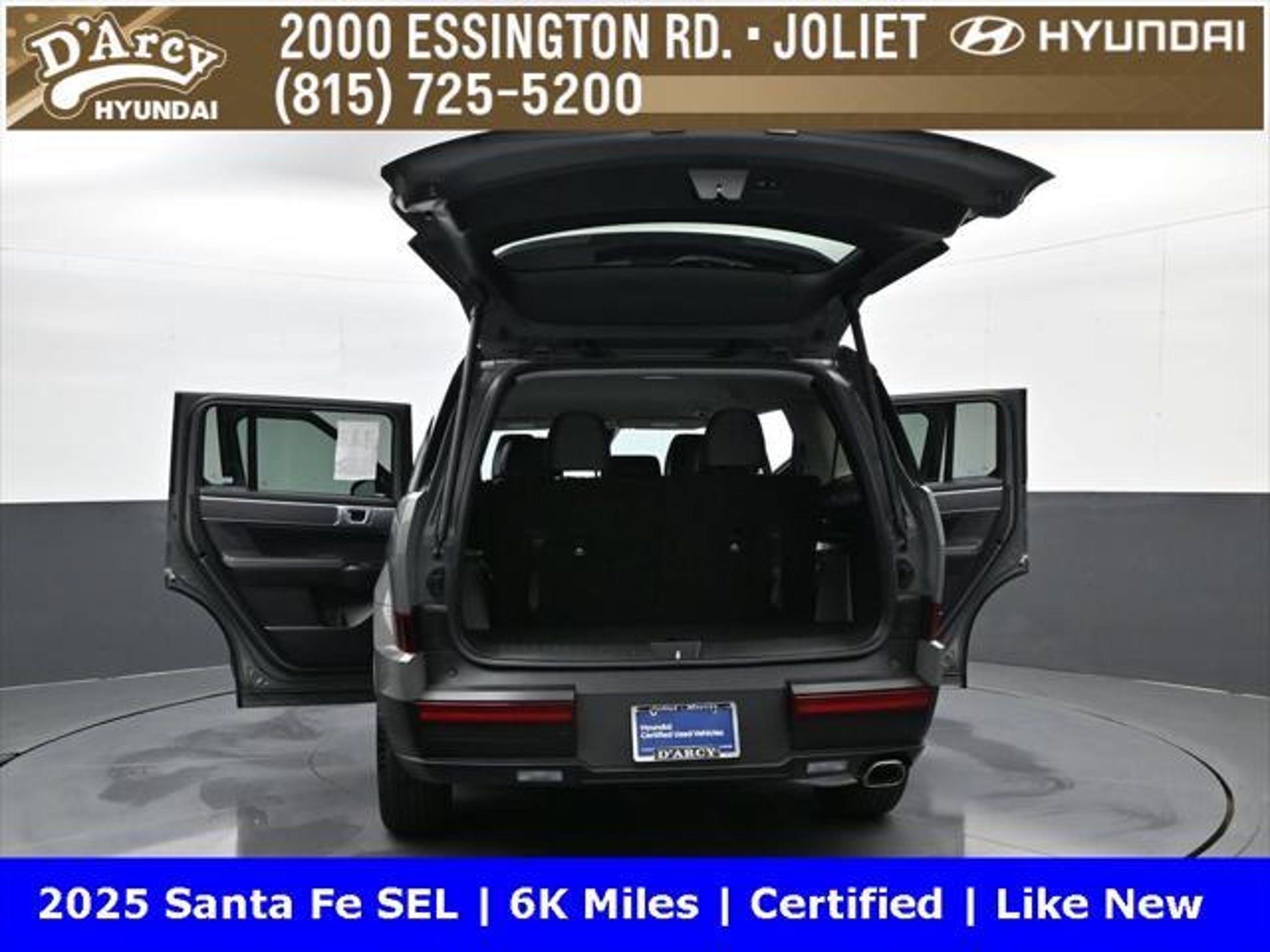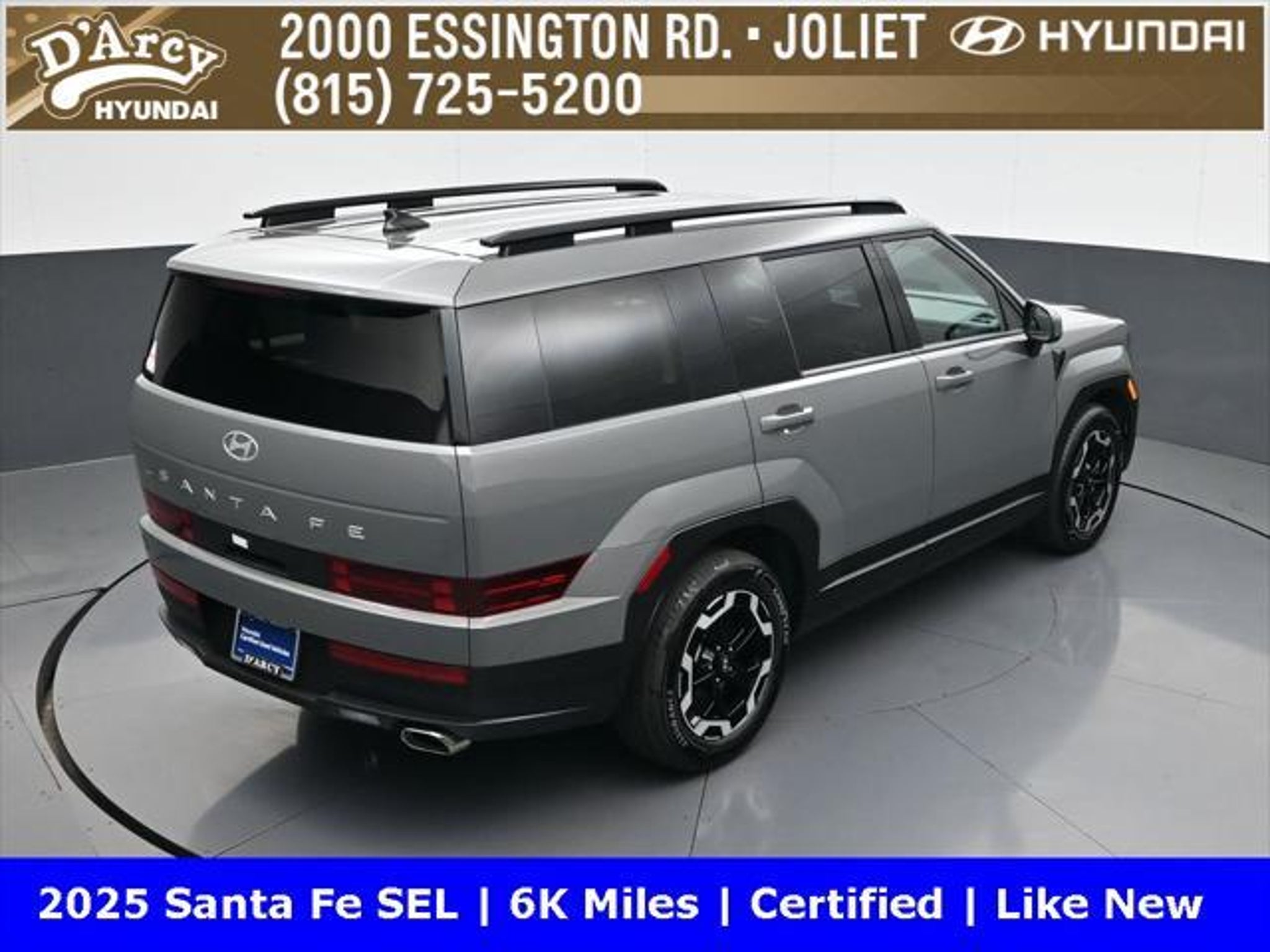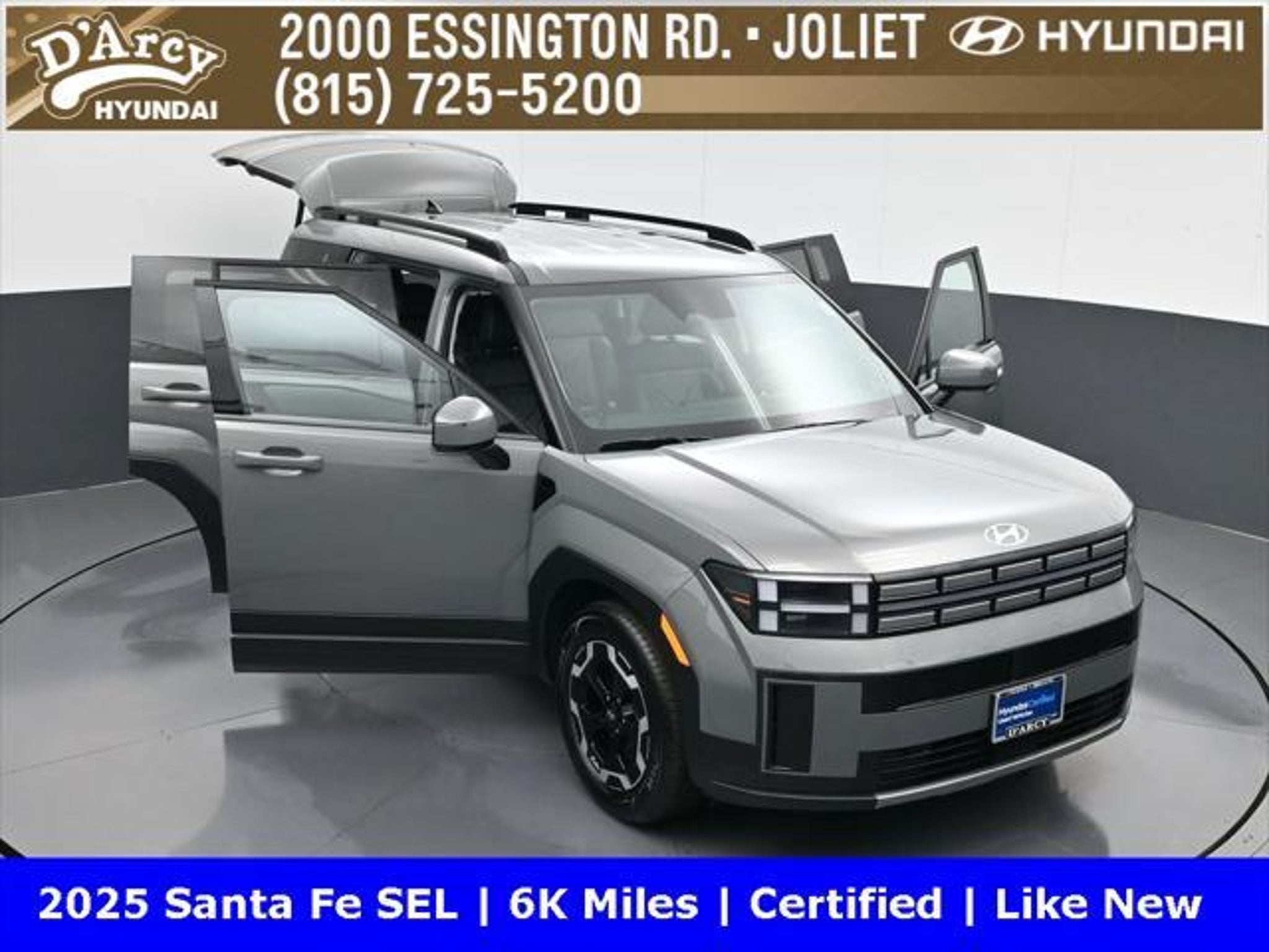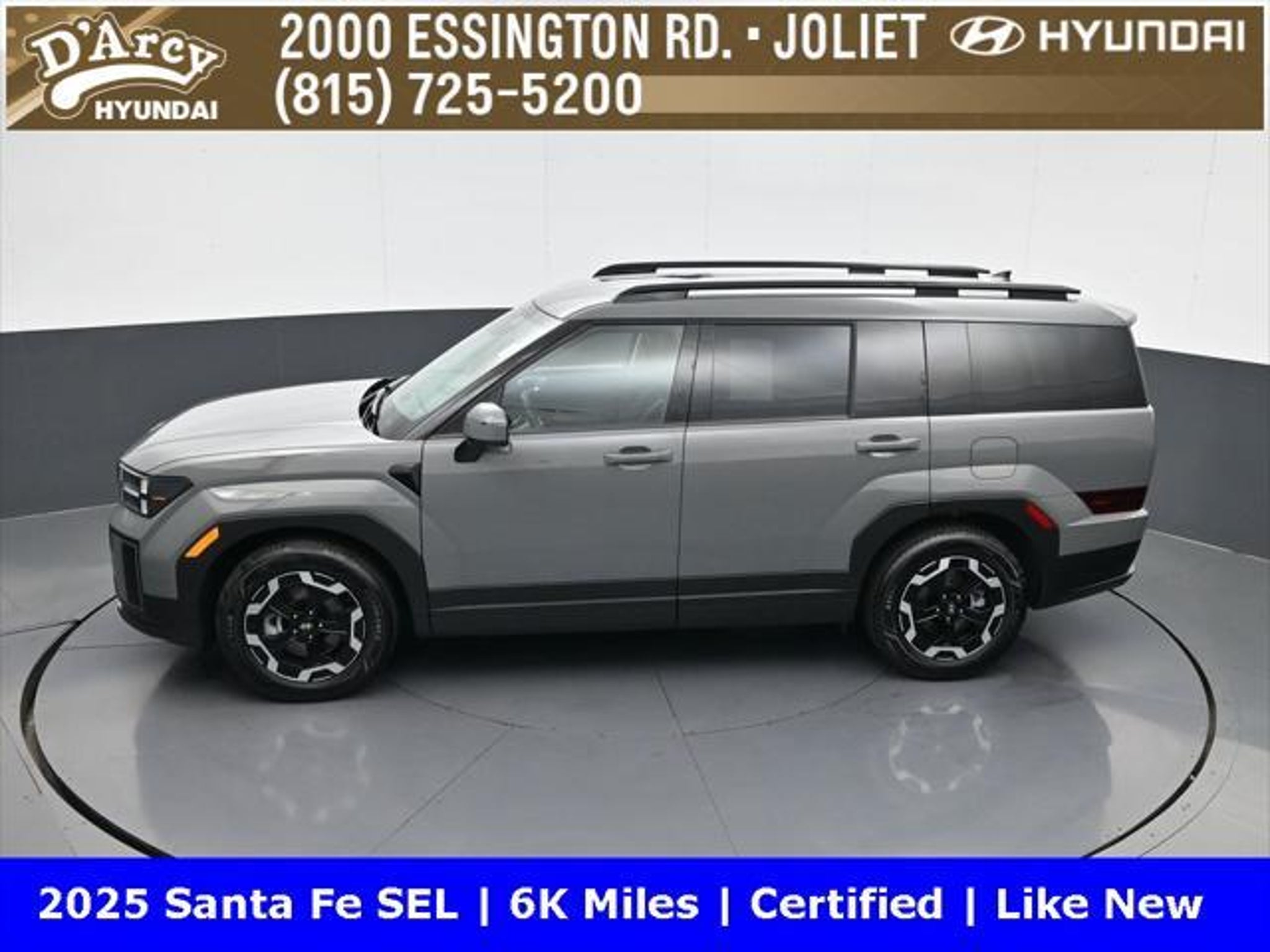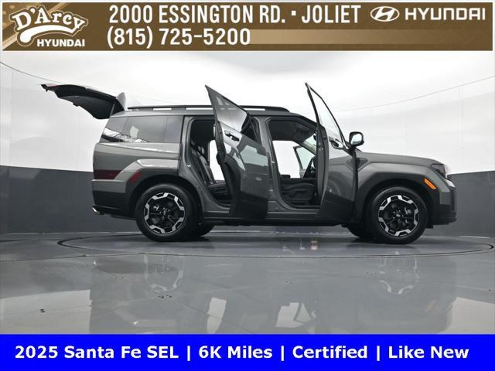 ONE OWNER LOCAL TRADE!, LOW MILES!, GREAT VEHICLE HISTORY!, REMAINING FULL FACTORY WARRANTY!, BOUGHT HERE SERVICED HERE!, HYUNDAI CERTIFIED!, FULLY SERVICED AND READY TO GO!. Certified. Hampton Gray 2025 Hyundai Santa Fe SEL FWD Shiftronic 2.5L I4 Hyundai Certified Used Vehicles Details: * Includes 10-year/Unlimited Mileage Roadside Assistance with Rental Car and Trip Interruption Reimbursement; Please See Dealers for Specific Vehicle Eligibility Requirements. 10-Year/100,000 Mile Hybrid/EV Battery Warranty. 3-Months SiriusXM Trial Subscription. Complimentary 1 Year (Connected Care & Remote Pkgs). * Powertrain Limited Warranty: 120 Month/100,000 Mile (whichever comes first) from original in-service date * Vehicle History * Roadside Assistance * Warranty Deductible: $50 * 173 Point Inspection * Limited Warranty: 60 Month/60,000 Mile (whichever comes first) from original in-service date Discover the D'Arcy Difference! We care - we are here and we are ready to help! Stop by today to see up to date information, including showroom and service hours, and how to make an appointment or schedule delivery. D'Arcy Motors has been serving Joliet and its surrounding communities for over 25 years. Our business philosophy, which is to sell cars one car at a time and to make the guest the most important part of the process, has remained the same since 1991. Contact us today to experience the D'Arcy Difference! Pulse® Safer Braking Technology for $399 added to all New and CPO"“ The rear-end collision deterrent that rapidly pulses your third brake light four times before going solid when you press the brake pedal. This feature enhances safety by helping alert trailing drivers. Discover the D'Arcy Difference! We care - we are here and we are ready to help! Stop by today to see up to date information, including showroom and service hours, and how to make an appointment or schedule delivery. D'Arcy Motors has been serving Joliet and its surrounding communities for over 25 years. Our business philosophy, which is to sell cars one car at a time and to make the guest the most important part of the process, has remained the same since 1991. Contact us today to experience the D'Arcy Difference! Odometer is 14548 miles below market average! 20/29 City/Highway MPG This 2025 Hyundai Santa Fe comes equipped with: Option Group 01, 18 x 7.5J Alloy Wheels, 3rd row seats: bench, 4-Wheel Disc Brakes, 6 Speakers, ABS brakes, Air Conditioning, All Season Fitted Liners, Alloy wheels, AM/FM radio: SiriusXM, Apple CarPlay & Android Auto, Auto High-beam Headlights, Automatic temperature control, Brake assist, Bumpers: body-color, Cargo Net, Delay-off headlights, Driver door bin, Driver vanity mirror, Dual front impact airbags, Dual front side impact airbags, Electronic Stability Control, Emergency communication system, Exterior Parking Camera Rear, First Aid Kit, Four wheel independent suspension, Front anti-roll bar, Front Bucket Seats, Front Center Armrest, Front dual zone A/C, Front reading lights, Fully automatic headlights, H-Tex Leatherette Seat Trim, Heated door mirrors, Heated Front Bucket Seats, Heated front seats, Illuminated entry, Knee airbag, Leather steering wheel, Low tire pressure warning, Occupant sensing airbag, Outside temperature display, Overhead airbag, Overhead console, Panic alarm, Passenger door bin, Passenger vanity mirror, Power door mirrors, Power driver seat, Power Liftgate, Power steering, Power windows, Radio: AM/FM/HD Display Audio, Rear anti-roll bar, Rear seat center armrest, Rear side impact airbag, Rear window defroster, Rear window wiper, Remote keyless entry, Roadside Assistance Kit, Security system, Speed control, Speed-sensing steering, Split folding rear seat, Spoiler, Steering wheel mounted audio controls, Tachometer, Telescoping steering wheel, Tilt steering wheel, Traction control, Trip computer, Turn signal indicator mirrors, and Variably intermittent w