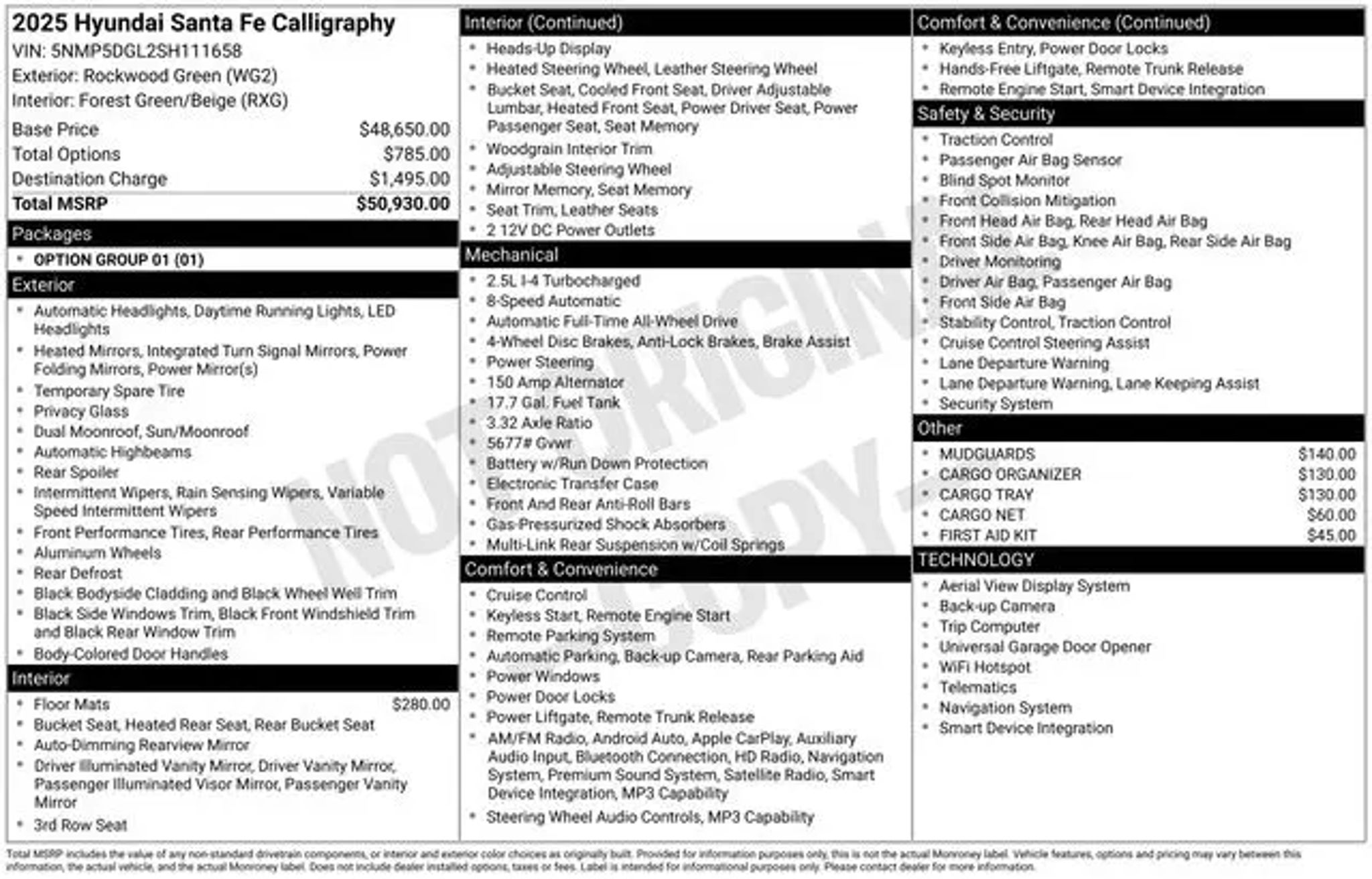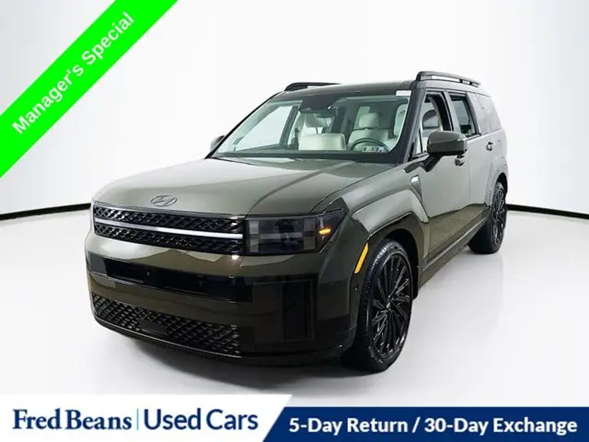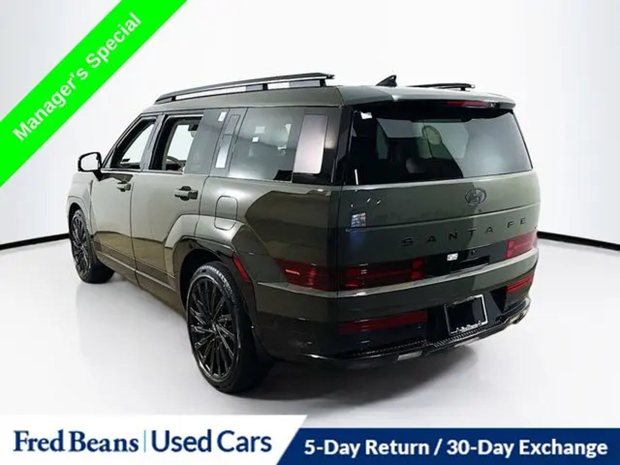 Discover the ultimate in luxury and versatility with the 2025 Hyundai Santa Fe Calligraphy. This stunning SUV is now available at our dealership, and it's the perfect blend of style, performance, and cutting-edge technology. Boasting a sleek and sophisticated exterior in a stunning Green color, the Santa Fe Calligraphy commands attention wherever it goes. Under the hood, you'll find a powerful 2.5L I4 engine paired with Shiftronic all-wheel drive, delivering an impressive balance of power and efficiency. "¢ Factory Certified Vehicle "¢ Free First Oil Change "¢ 5 Day Return / 30 Day Exchange "¢ Auto Reward Program "¢ 5 Year / 60,000 miles comprehensive OISD "¢ 10 Year / 100,000 miles powertrain OISD "¢ ALL SEASON FITTED LINERS "¢ MUDGUARDS "¢ CARGO ORGANIZER "¢ CARGO TRAY "¢ CARGO NET "¢ FIRST AID KIT "¢ Option Group 01 The Santa Fe Calligraphy is packed with an array of premium features that will elevate your driving experience. Enjoy the convenience of a Navigation System, Front dual zone A/C, Heads-Up Display, and Memory seating. Stay connected with Apple CarPlay and Android Auto, and keep your passengers comfortable with Heated and Ventilated Front Bucket Seats and Heated rear seats. Safety is a top priority, and the Santa Fe Calligraphy delivers with a comprehensive suite of advanced driver-assistance technologies, including ABS brakes, Electronic Stability Control, and Exterior Parking Camera Rear. This Hyundai Certified Used Vehicle has undergone a rigorous 173 point inspection, ensuring you can drive with confidence. With a Limited Warranty of 60 months/60,000 miles and a Powertrain Limited Warranty of 120 months/100,000 miles, you can enjoy peace of mind on the road. Don't miss your chance to experience the ultimate in luxury and capability. Schedule a test drive today and discover why the 2025 Hyundai Santa Fe Calligraphy is the perfect choice for your next adventure.