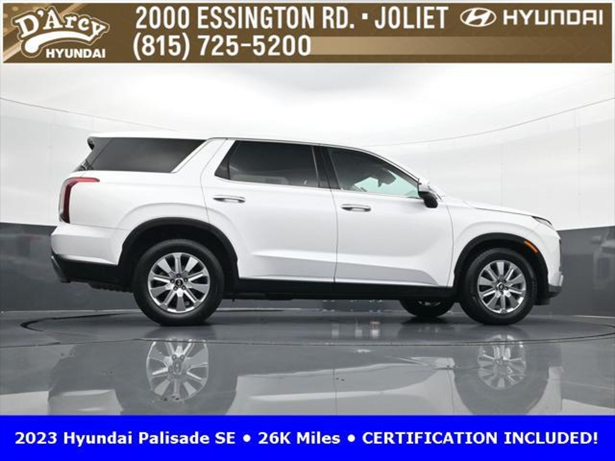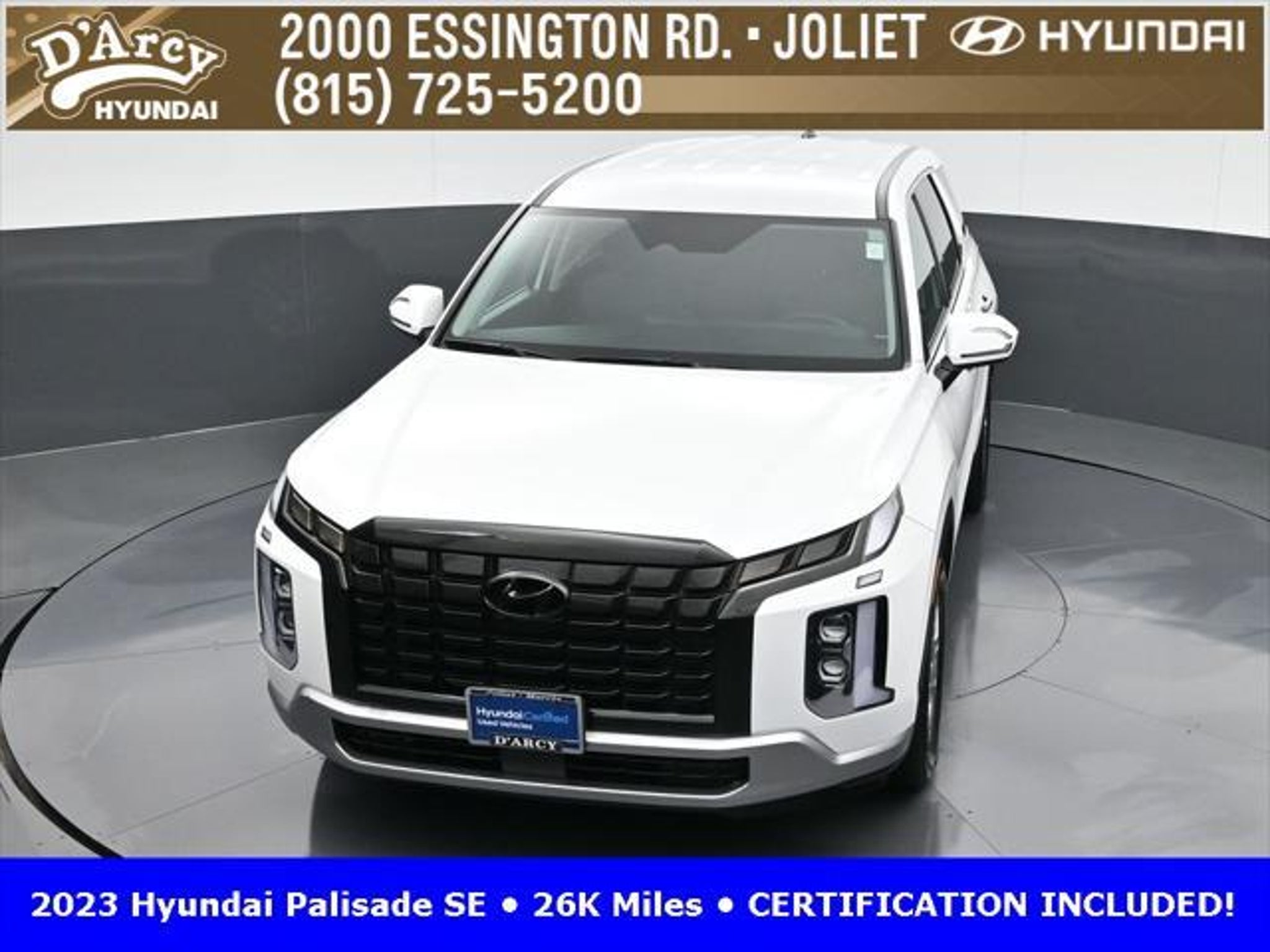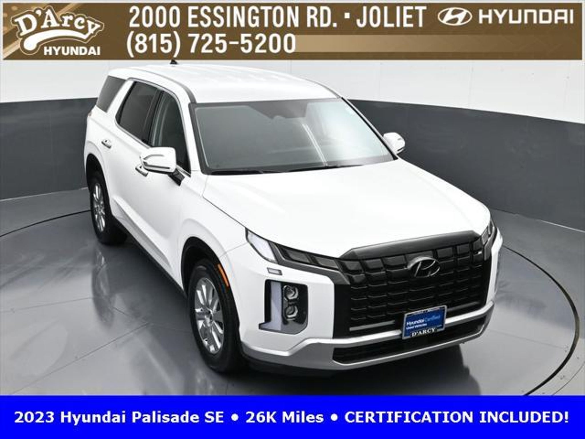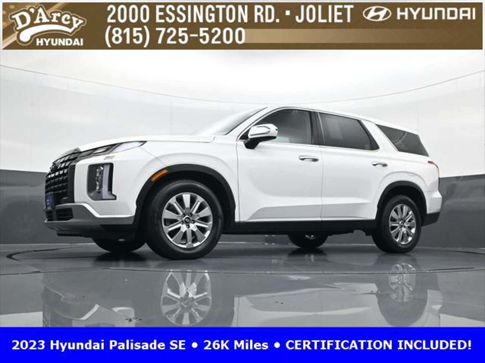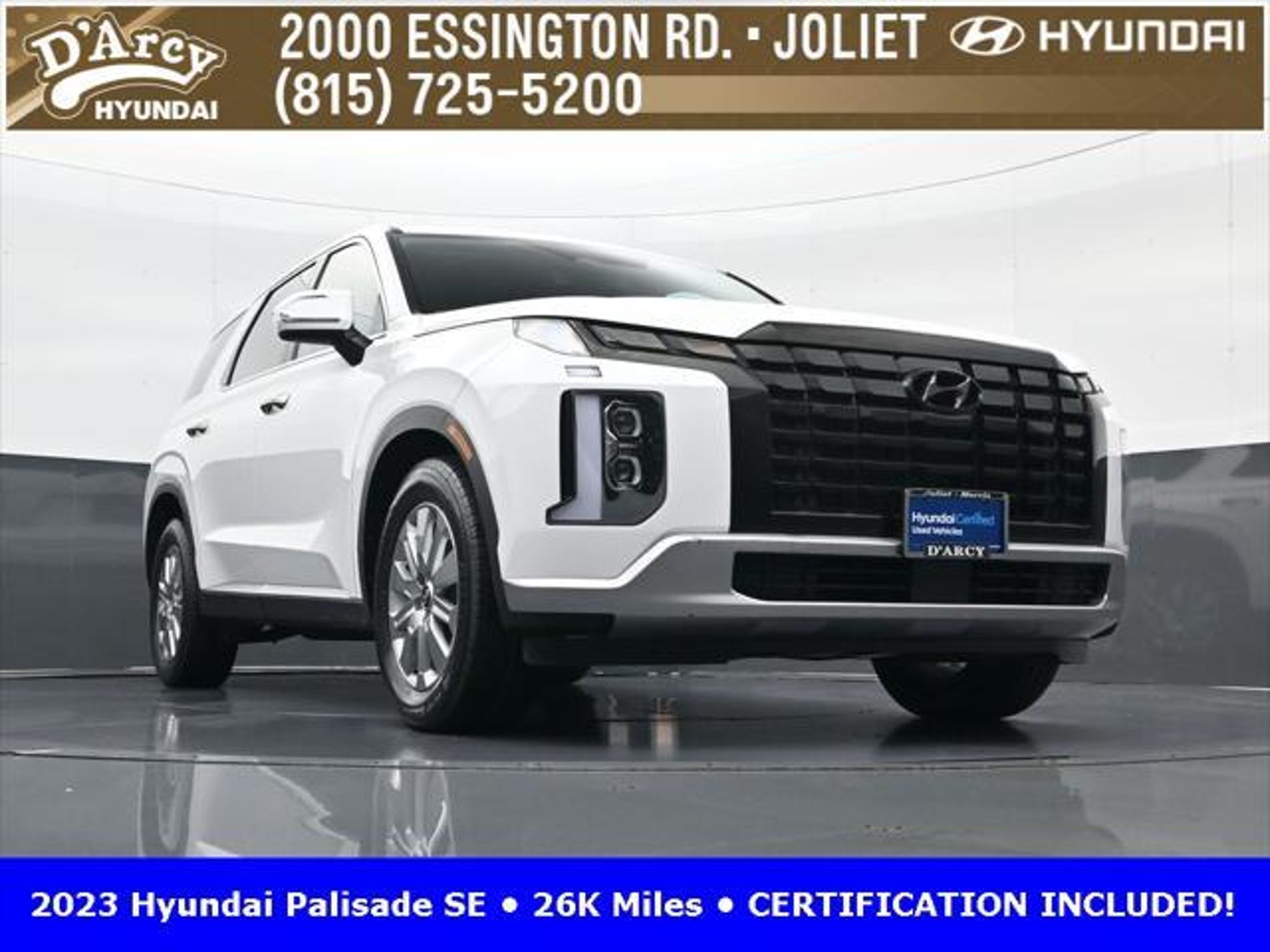 CARFAX One-Owner. ONE OWNER LOCAL TRADE!, LOW MILES!, GREAT VEHICLE HISTORY!, REMAINING FULL FACTORY WARRANTY!, BOUGHT HERE SERVICED HERE!, HYUNDAI CERTIFIED!, FULLY SERVICED AND READY TO GO!. Certified. Hyper White 2023 Hyundai Palisade SE FWD 8-Speed Automatic with SHIFTRONIC V6 Hyundai Certified Used Vehicles Details: * Includes 10-year/Unlimited Mileage Roadside Assistance with Rental Car and Trip Interruption Reimbursement; Please See Dealers for Specific Vehicle Eligibility Requirements. 10-Year/100,000 Mile Hybrid/EV Battery Warranty. 3-Months SiriusXM Trial Subscription. Complimentary 1 Year (Connected Care & Remote Pkgs). * 173 Point Inspection * Limited Warranty: 60 Month/60,000 Mile (whichever comes first) from original in-service date * Powertrain Limited Warranty: 120 Month/100,000 Mile (whichever comes first) from original in-service date * Roadside Assistance * Warranty Deductible: $50 * Vehicle History Discover the D'Arcy Difference! We care - we are here and we are ready to help! Stop by today to see up to date information, including showroom and service hours, and how to make an appointment or schedule delivery. D'Arcy Motors has been serving Joliet and its surrounding communities for over 25 years. Our business philosophy, which is to sell cars one car at a time and to make the guest the most important part of the process, has remained the same since 1991. Contact us today to experience the D'Arcy Difference! Pulse® Safer Braking Technology for $399 added to all New and CPO"“ The rear-end collision deterrent that rapidly pulses your third brake light four times before going solid when you press the brake pedal. This feature enhances safety by helping alert trailing drivers. Discover the D'Arcy Difference! We care - we are here and we are ready to help! Stop by today to see up to date information, including showroom and service hours, and how to make an appointment or schedule delivery. D'Arcy Motors has been serving Joliet and its surrounding communities for over 25 years. Our business philosophy, which is to sell cars one car at a time and to make the guest the most important part of the process, has remained the same since 1991. Contact us today to experience the D'Arcy Difference! Odometer is 31116 miles below market average! 19/27 City/Highway MPG This 2023 Hyundai Palisade comes equipped with: Option Group 01, 3.510 Axle Ratio, 3rd row seats: split-bench, 4-Wheel Disc Brakes, 6 Speakers, ABS brakes, Air Conditioning, Alloy wheels, AM/FM radio: SiriusXM, Apple CarPlay & Android Auto, Auto High-beam Headlights, Auto-dimming door mirrors, Auto-dimming Rear-View mirror, Brake assist, Bumpers: body-color, Cloth Seat Trim, Delay-off headlights, Driver door bin, Driver vanity mirror, Dual front impact airbags, Dual front side impact airbags, Electronic Stability Control, Emergency communication system: Blue Link Connected Car Service (3-year complimentary subscription), Exterior Parking Camera Rear, Four wheel independent suspension, Front anti-roll bar, Front Bucket Seats, Front Center Armrest, Front reading lights, Fully automatic headlights, Heated door mirrors, Illuminated entry, Knee airbag, Low tire pressure warning, Navigation System, Occupant sensing airbag, Outside temperature display, Overhead airbag, Overhead console, Panic alarm, Passenger door bin, Passenger vanity mirror, Power door mirrors, Power steering, Power windows, Radio data system, Radio: AM/FM/MP3 Audio System, Rear air conditioning, Rear anti-roll bar, Rear audio controls, Rear reading lights, Rear seat center armrest, Rear side impact airbag, Rear window defroster, Rear window wiper, Reclining 3rd row seat, Remote keyless entry, Security system, Speed control, Speed-sensing steering, Split folding rear seat, Spoiler, Steering wheel mounted audio controls, Tachometer, Telescoping steering wheel, Tilt steering wheel, Traction control, Trip computer, Turn signal indic