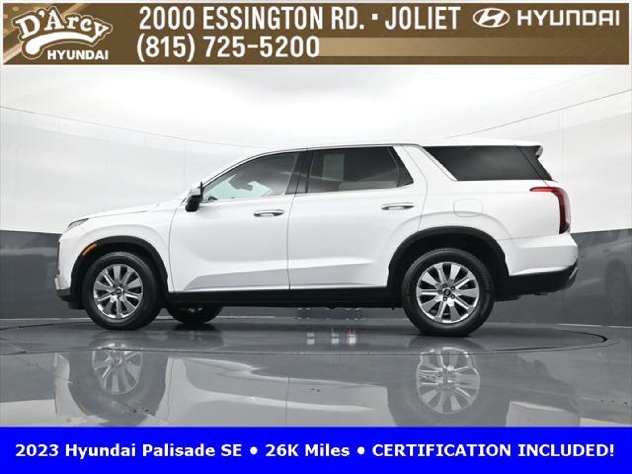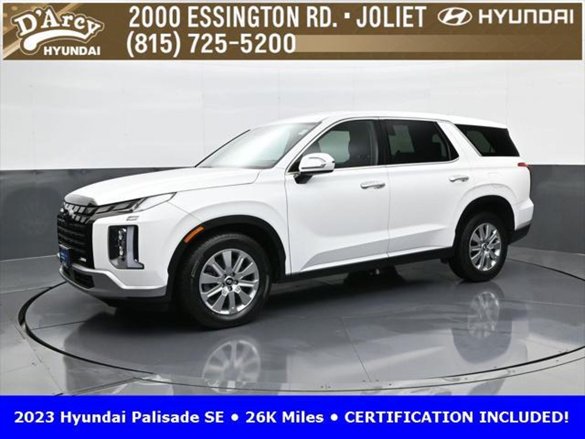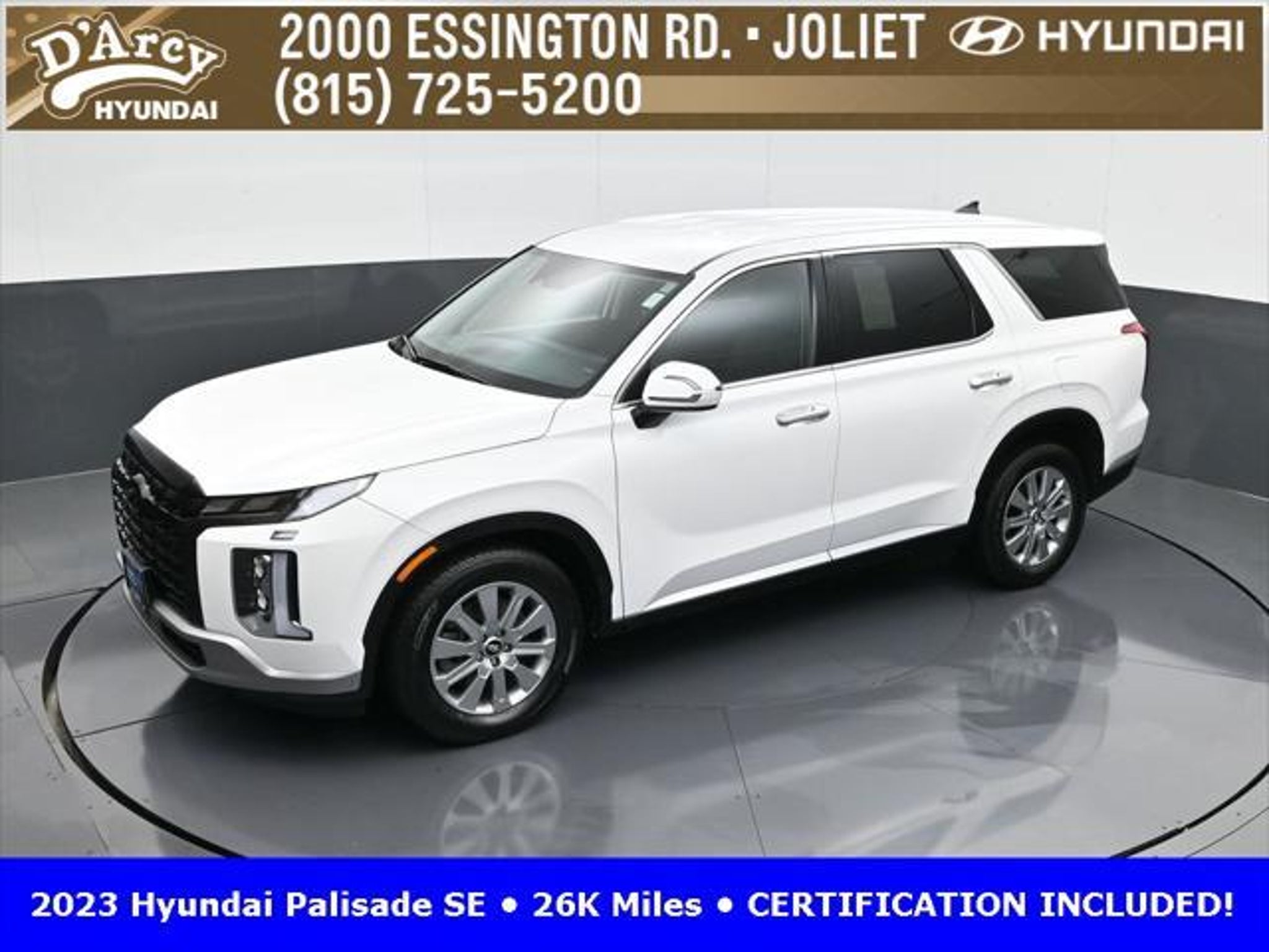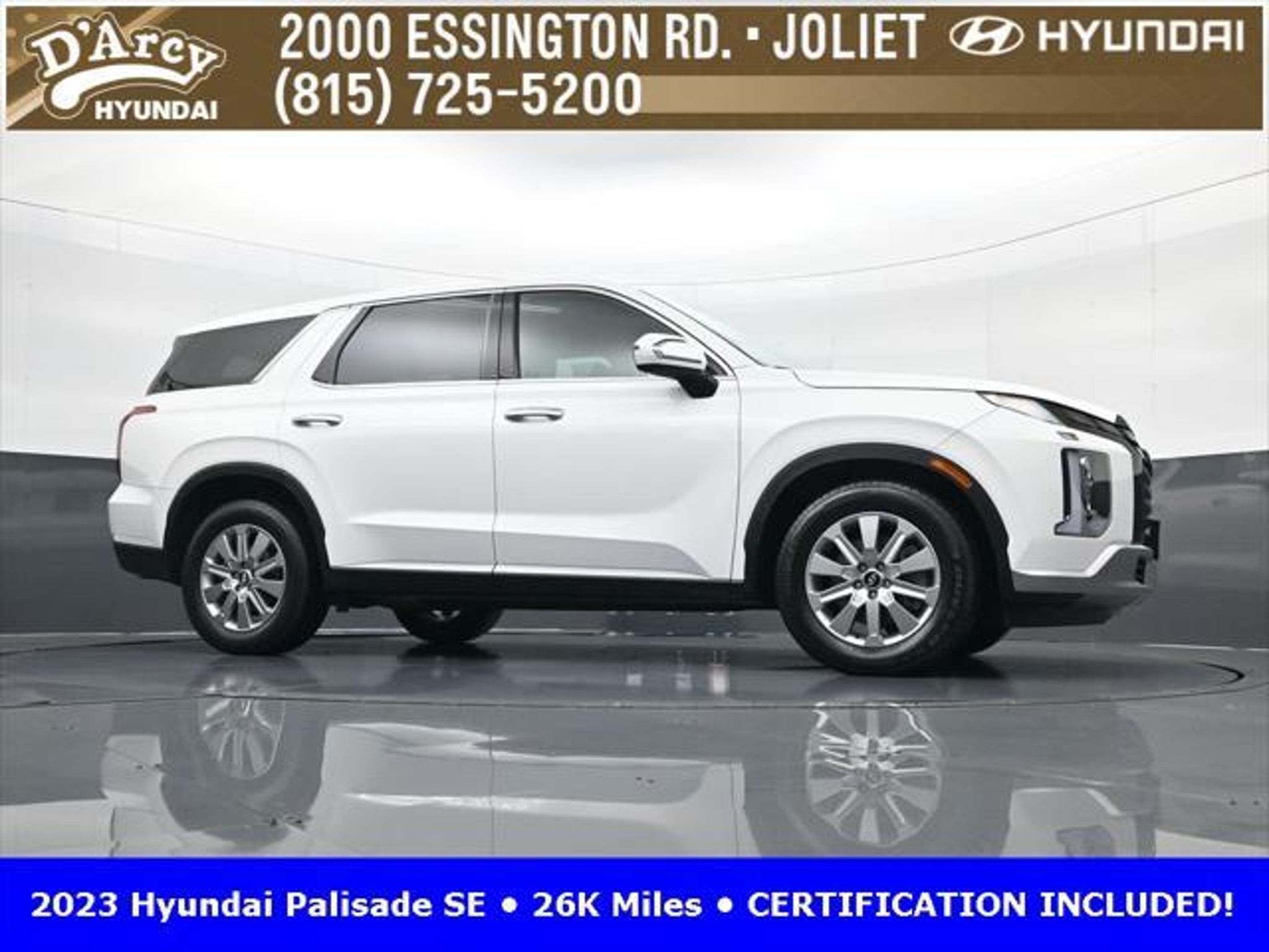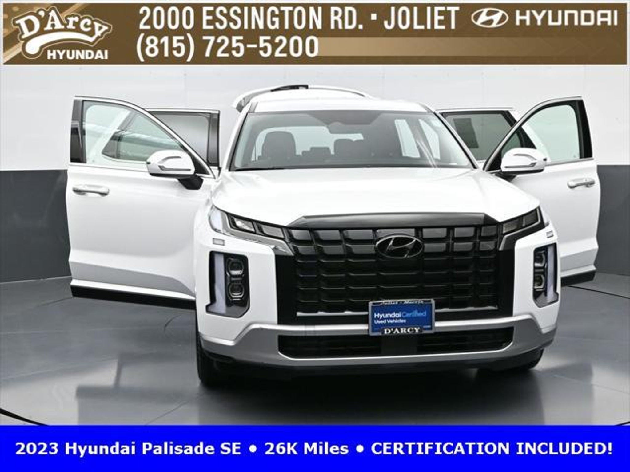 CARFAX One-Owner. ONE OWNER LOCAL TRADE!, LOW MILES!, GREAT VEHICLE HISTORY!, REMAINING FULL FACTORY WARRANTY!, BOUGHT HERE SERVICED HERE!, HYUNDAI CERTIFIED!, FULLY SERVICED AND READY TO GO!. Certified. Hyper White 2023 Hyundai Palisade SE FWD 8-Speed Automatic with SHIFTRONIC V6 Hyundai Certified Used Vehicles Details: * Includes 10-year/Unlimited Mileage Roadside Assistance with Rental Car and Trip Interruption Reimbursement; Please See Dealers for Specific Vehicle Eligibility Requirements. 10-Year/100,000 Mile Hybrid/EV Battery Warranty. 3-Months SiriusXM Trial Subscription. Complimentary 1 Year (Connected Care & Remote Pkgs). * 173 Point Inspection * Limited Warranty: 60 Month/60,000 Mile (whichever comes first) from original in-service date * Powertrain Limited Warranty: 120 Month/100,000 Mile (whichever comes first) from original in-service date * Roadside Assistance * Warranty Deductible: $50 * Vehicle History Discover the D'Arcy Difference! We care - we are here and we are ready to help! Stop by today to see up to date information, including showroom and service hours, and how to make an appointment or schedule delivery. D'Arcy Motors has been serving Joliet and its surrounding communities for over 25 years. Our business philosophy, which is to sell cars one car at a time and to make the guest the most important part of the process, has remained the same since 1991. Contact us today to experience the D'Arcy Difference! Pulse® Safer Braking Technology for $399 added to all New and CPO"“ The rear-end collision deterrent that rapidly pulses your third brake light four times before going solid when you press the brake pedal. This feature enhances safety by helping alert trailing drivers. Discover the D'Arcy Difference! We care - we are here and we are ready to help! Stop by today to see up to date information, including showroom and service hours, and how to make an appointment or schedule delivery. D'Arcy Motors has been serving Joliet and its surrounding communities for over 25 years. Our business philosophy, which is to sell cars one car at a time and to make the guest the most important part of the process, has remained the same since 1991. Contact us today to experience the D'Arcy Difference! Odometer is 31116 miles below market average! 19/27 City/Highway MPG This 2023 Hyundai Palisade comes equipped with: Option Group 01, 3.510 Axle Ratio, 3rd row seats: split-bench, 4-Wheel Disc Brakes, 6 Speakers, ABS brakes, Air Conditioning, Alloy wheels, AM/FM radio: SiriusXM, Apple CarPlay & Android Auto, Auto High-beam Headlights, Auto-dimming door mirrors, Auto-dimming Rear-View mirror, Brake assist, Bumpers: body-color, Cloth Seat Trim, Delay-off headlights, Driver door bin, Driver vanity mirror, Dual front impact airbags, Dual front side impact airbags, Electronic Stability Control, Emergency communication system: Blue Link Connected Car Service (3-year complimentary subscription), Exterior Parking Camera Rear, Four wheel independent suspension, Front anti-roll bar, Front Bucket Seats, Front Center Armrest, Front reading lights, Fully automatic headlights, Heated door mirrors, Illuminated entry, Knee airbag, Low tire pressure warning, Navigation System, Occupant sensing airbag, Outside temperature display, Overhead airbag, Overhead console, Panic alarm, Passenger door bin, Passenger vanity mirror, Power door mirrors, Power steering, Power windows, Radio data system, Radio: AM/FM/MP3 Audio System, Rear air conditioning, Rear anti-roll bar, Rear audio controls, Rear reading lights, Rear seat center armrest, Rear side impact airbag, Rear window defroster, Rear window wiper, Reclining 3rd row seat, Remote keyless entry, Security system, Speed control, Speed-sensing steering, Split folding rear seat, Spoiler, Steering wheel mounted audio controls, Tachometer, Telescoping steering wheel, Tilt steering wheel, Traction control, Trip computer, Turn signal indic