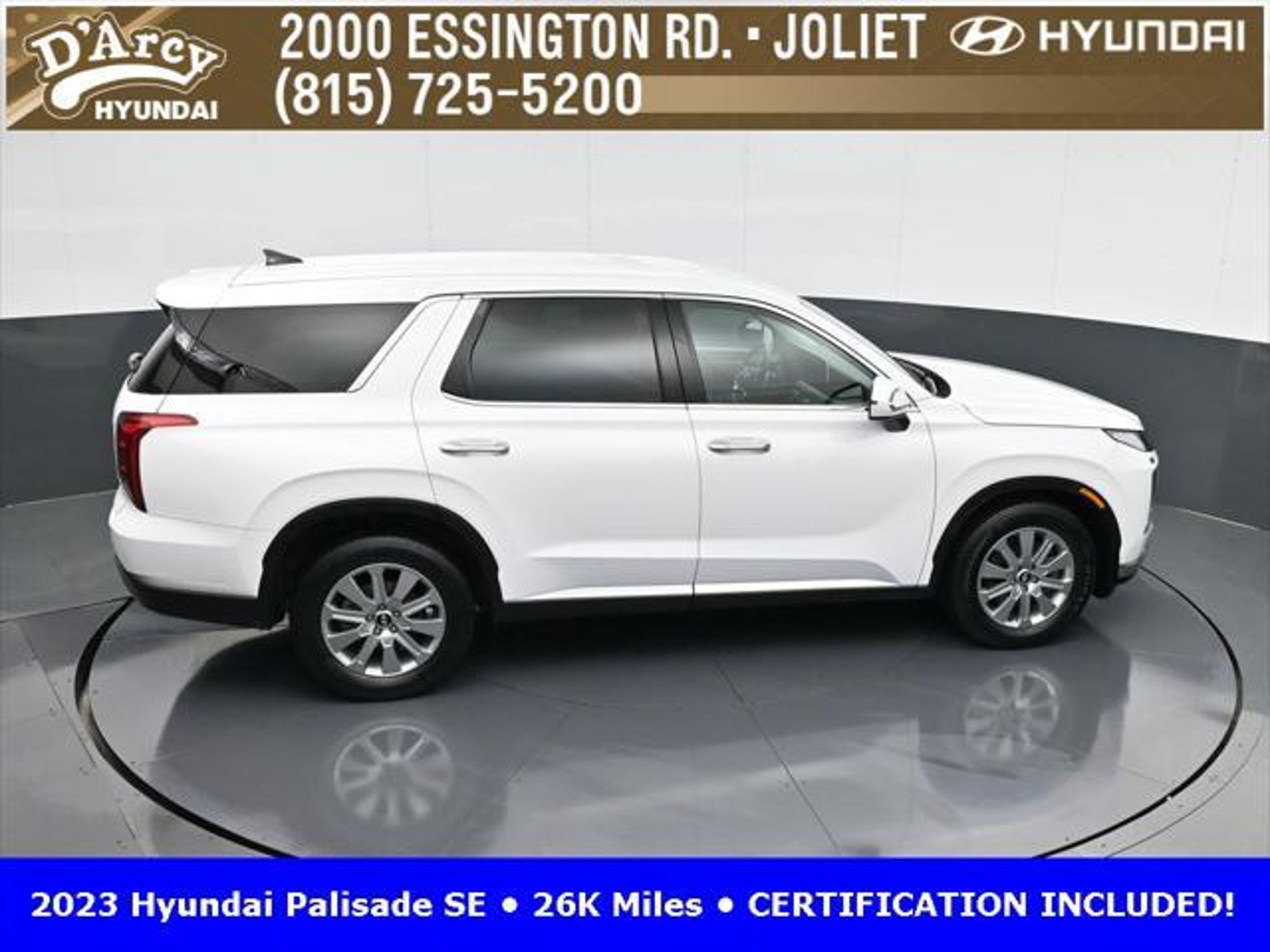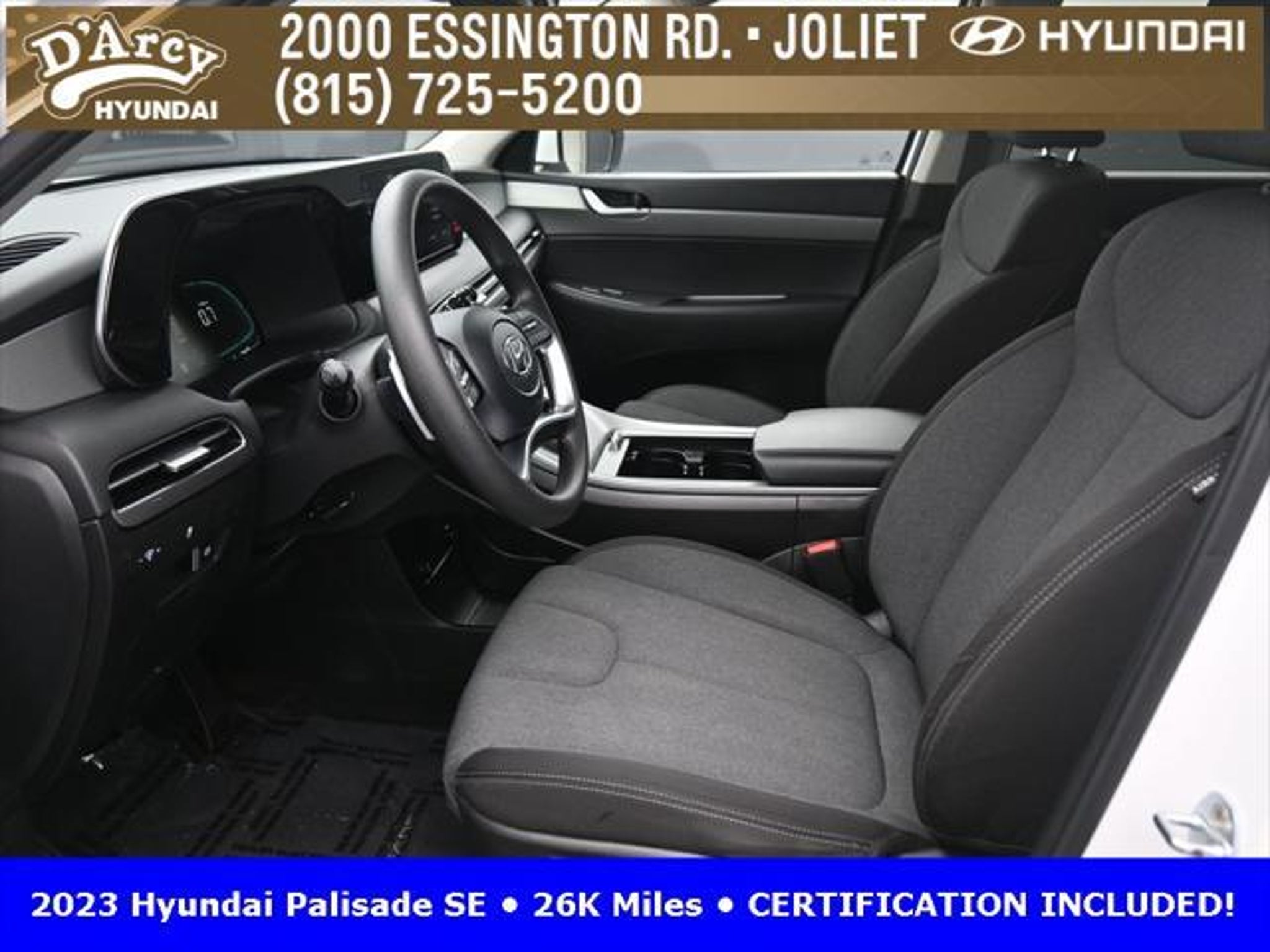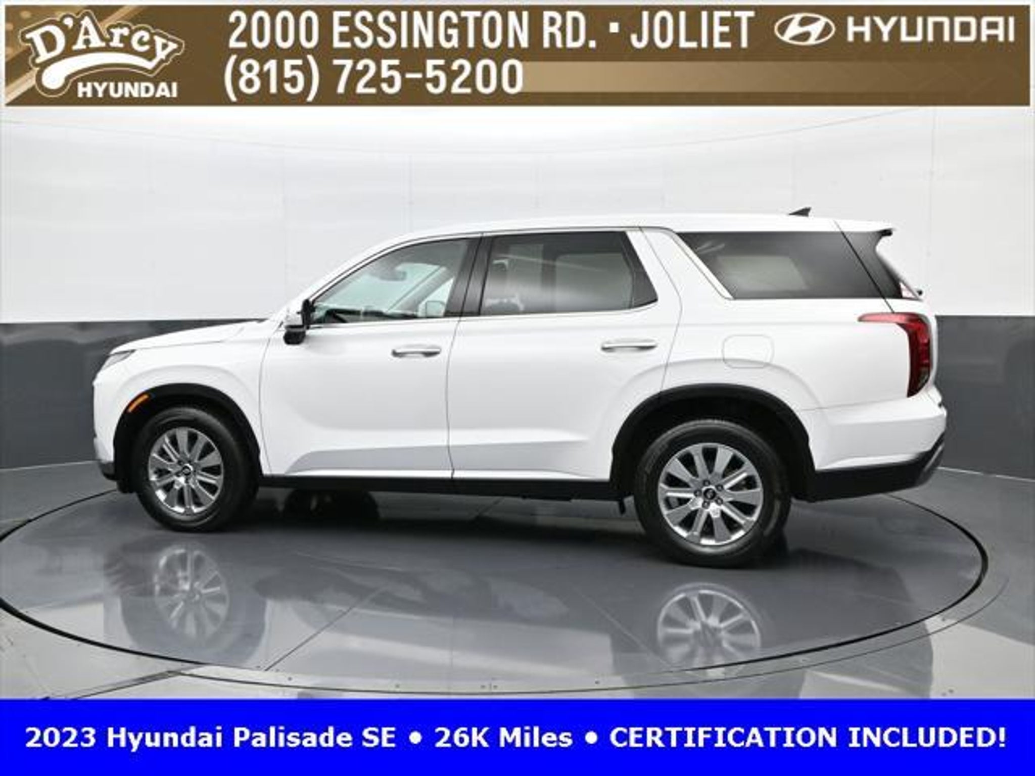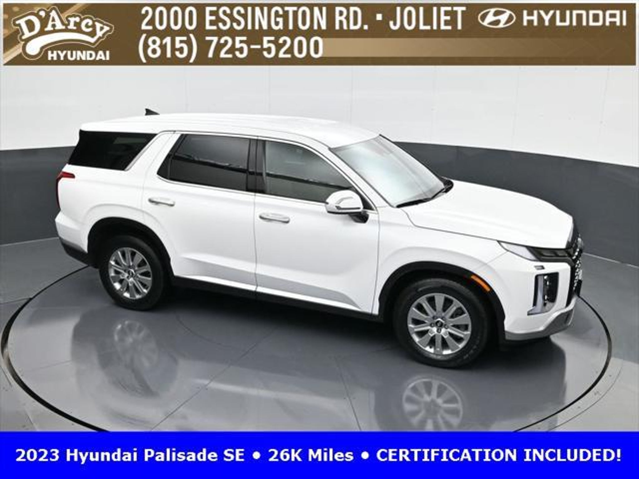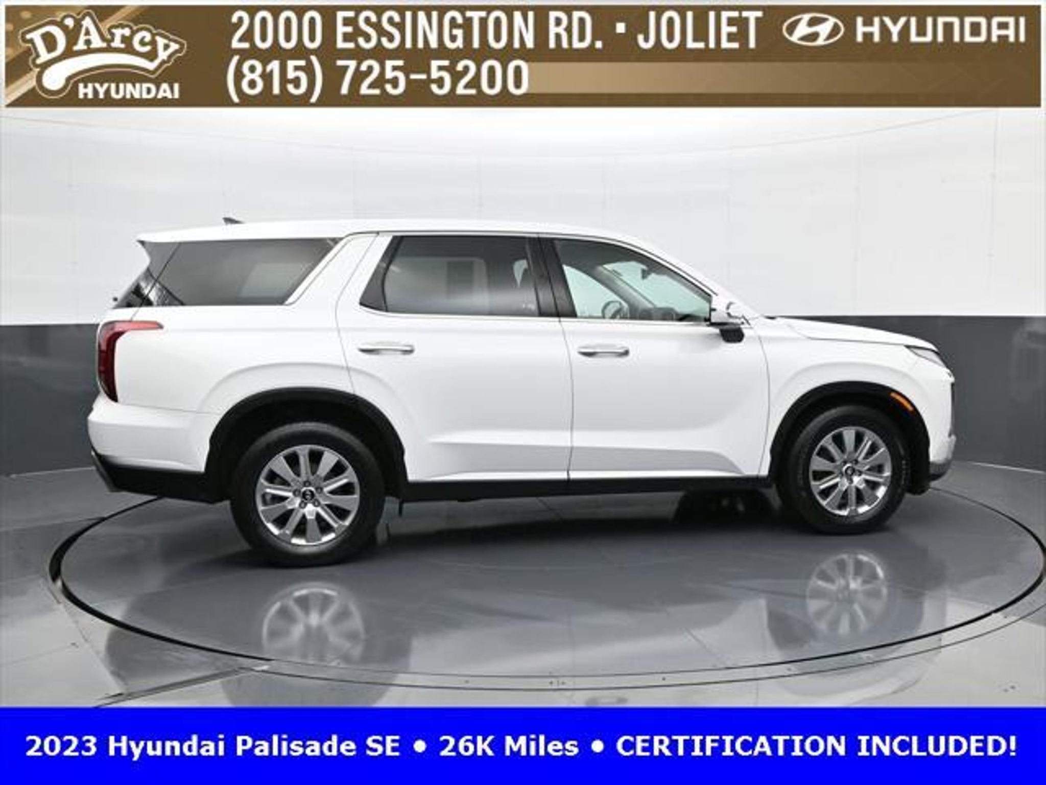 CARFAX One-Owner. ONE OWNER LOCAL TRADE!, LOW MILES!, GREAT VEHICLE HISTORY!, REMAINING FULL FACTORY WARRANTY!, BOUGHT HERE SERVICED HERE!, HYUNDAI CERTIFIED!, FULLY SERVICED AND READY TO GO!. Certified. Hyper White 2023 Hyundai Palisade SE FWD 8-Speed Automatic with SHIFTRONIC V6 Hyundai Certified Used Vehicles Details: * Includes 10-year/Unlimited Mileage Roadside Assistance with Rental Car and Trip Interruption Reimbursement; Please See Dealers for Specific Vehicle Eligibility Requirements. 10-Year/100,000 Mile Hybrid/EV Battery Warranty. 3-Months SiriusXM Trial Subscription. Complimentary 1 Year (Connected Care & Remote Pkgs). * 173 Point Inspection * Limited Warranty: 60 Month/60,000 Mile (whichever comes first) from original in-service date * Powertrain Limited Warranty: 120 Month/100,000 Mile (whichever comes first) from original in-service date * Roadside Assistance * Warranty Deductible: $50 * Vehicle History Discover the D'Arcy Difference! We care - we are here and we are ready to help! Stop by today to see up to date information, including showroom and service hours, and how to make an appointment or schedule delivery. D'Arcy Motors has been serving Joliet and its surrounding communities for over 25 years. Our business philosophy, which is to sell cars one car at a time and to make the guest the most important part of the process, has remained the same since 1991. Contact us today to experience the D'Arcy Difference! Pulse® Safer Braking Technology for $399 added to all New and CPO"“ The rear-end collision deterrent that rapidly pulses your third brake light four times before going solid when you press the brake pedal. This feature enhances safety by helping alert trailing drivers. Discover the D'Arcy Difference! We care - we are here and we are ready to help! Stop by today to see up to date information, including showroom and service hours, and how to make an appointment or schedule delivery. D'Arcy Motors has been serving Joliet and its surrounding communities for over 25 years. Our business philosophy, which is to sell cars one car at a time and to make the guest the most important part of the process, has remained the same since 1991. Contact us today to experience the D'Arcy Difference! Odometer is 31116 miles below market average! 19/27 City/Highway MPG This 2023 Hyundai Palisade comes equipped with: Option Group 01, 3.510 Axle Ratio, 3rd row seats: split-bench, 4-Wheel Disc Brakes, 6 Speakers, ABS brakes, Air Conditioning, Alloy wheels, AM/FM radio: SiriusXM, Apple CarPlay & Android Auto, Auto High-beam Headlights, Auto-dimming door mirrors, Auto-dimming Rear-View mirror, Brake assist, Bumpers: body-color, Cloth Seat Trim, Delay-off headlights, Driver door bin, Driver vanity mirror, Dual front impact airbags, Dual front side impact airbags, Electronic Stability Control, Emergency communication system: Blue Link Connected Car Service (3-year complimentary subscription), Exterior Parking Camera Rear, Four wheel independent suspension, Front anti-roll bar, Front Bucket Seats, Front Center Armrest, Front reading lights, Fully automatic headlights, Heated door mirrors, Illuminated entry, Knee airbag, Low tire pressure warning, Navigation System, Occupant sensing airbag, Outside temperature display, Overhead airbag, Overhead console, Panic alarm, Passenger door bin, Passenger vanity mirror, Power door mirrors, Power steering, Power windows, Radio data system, Radio: AM/FM/MP3 Audio System, Rear air conditioning, Rear anti-roll bar, Rear audio controls, Rear reading lights, Rear seat center armrest, Rear side impact airbag, Rear window defroster, Rear window wiper, Reclining 3rd row seat, Remote keyless entry, Security system, Speed control, Speed-sensing steering, Split folding rear seat, Spoiler, Steering wheel mounted audio controls, Tachometer, Telescoping steering wheel, Tilt steering wheel, Traction control, Trip computer, Turn signal indic