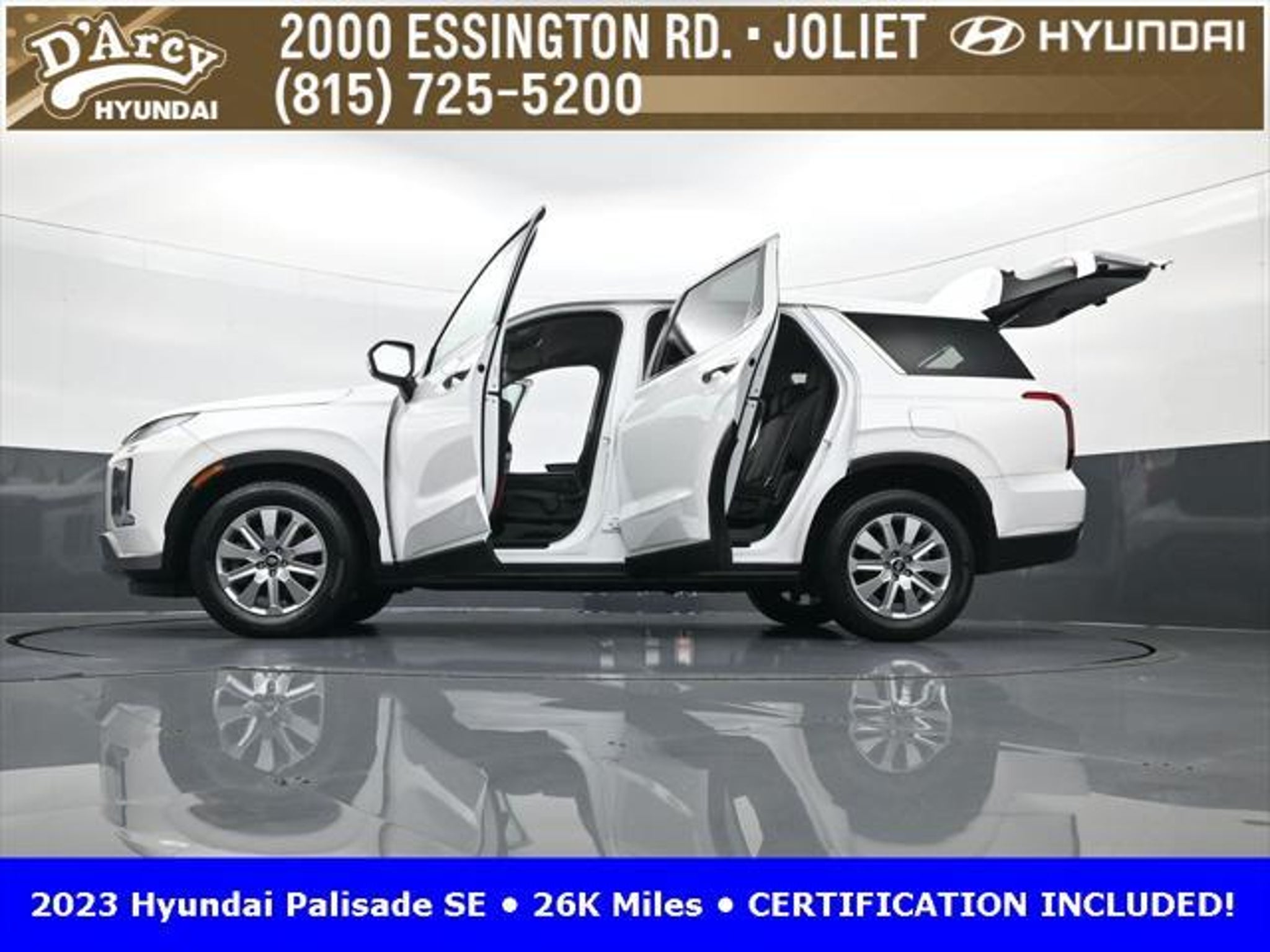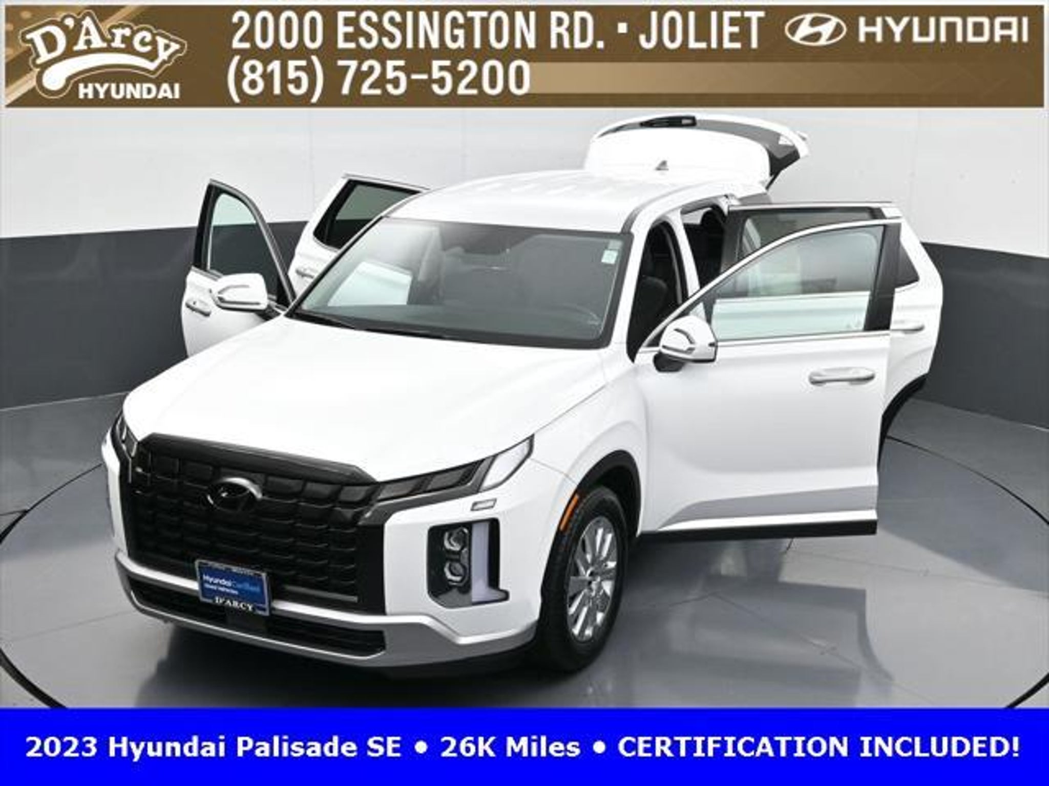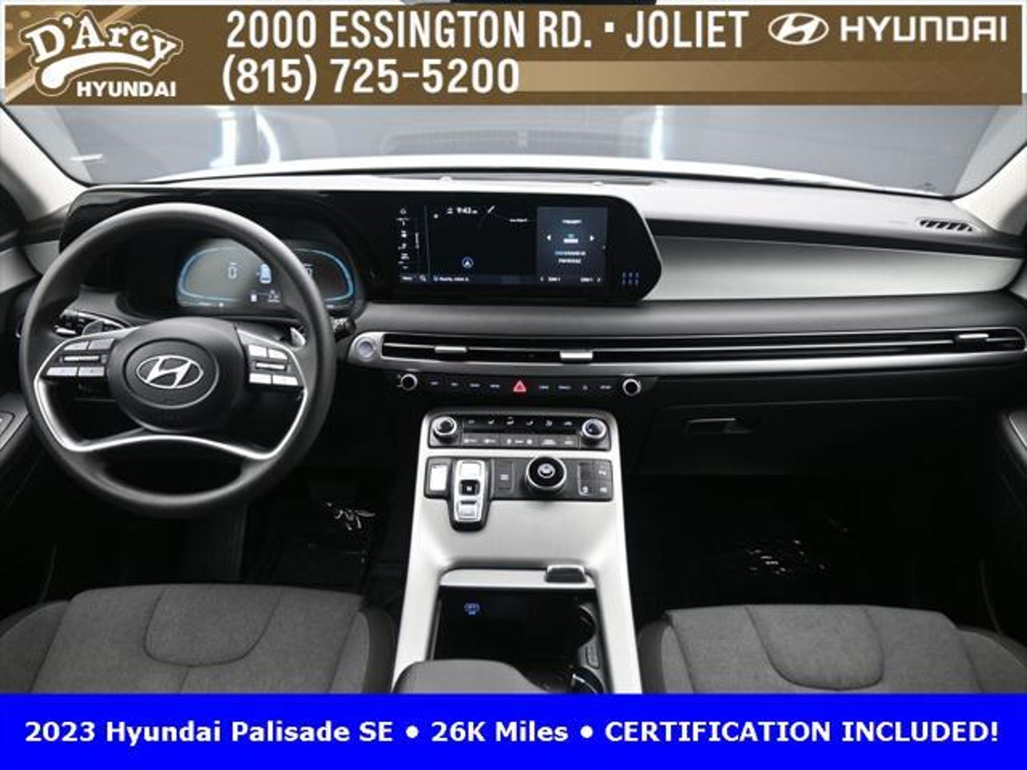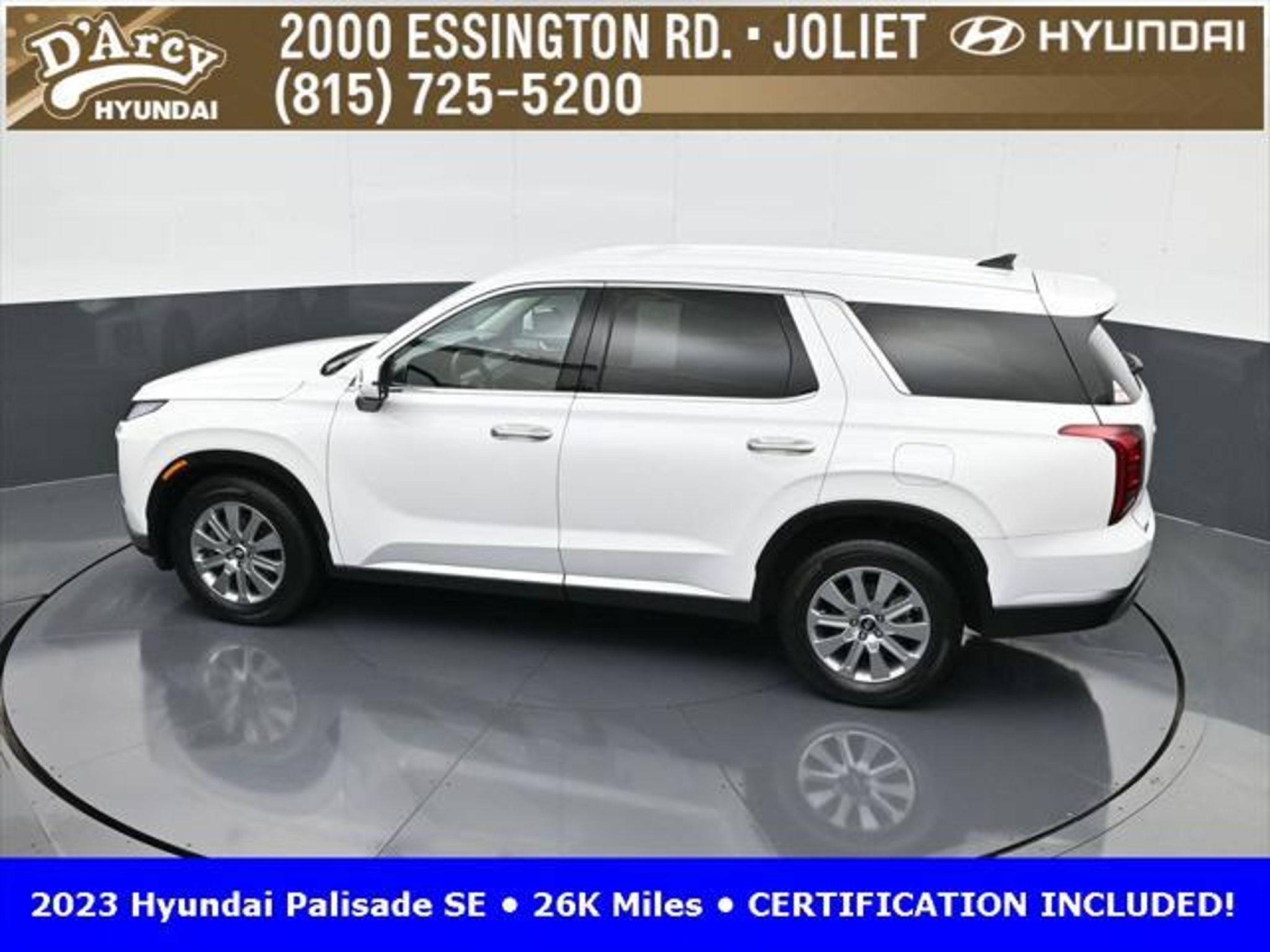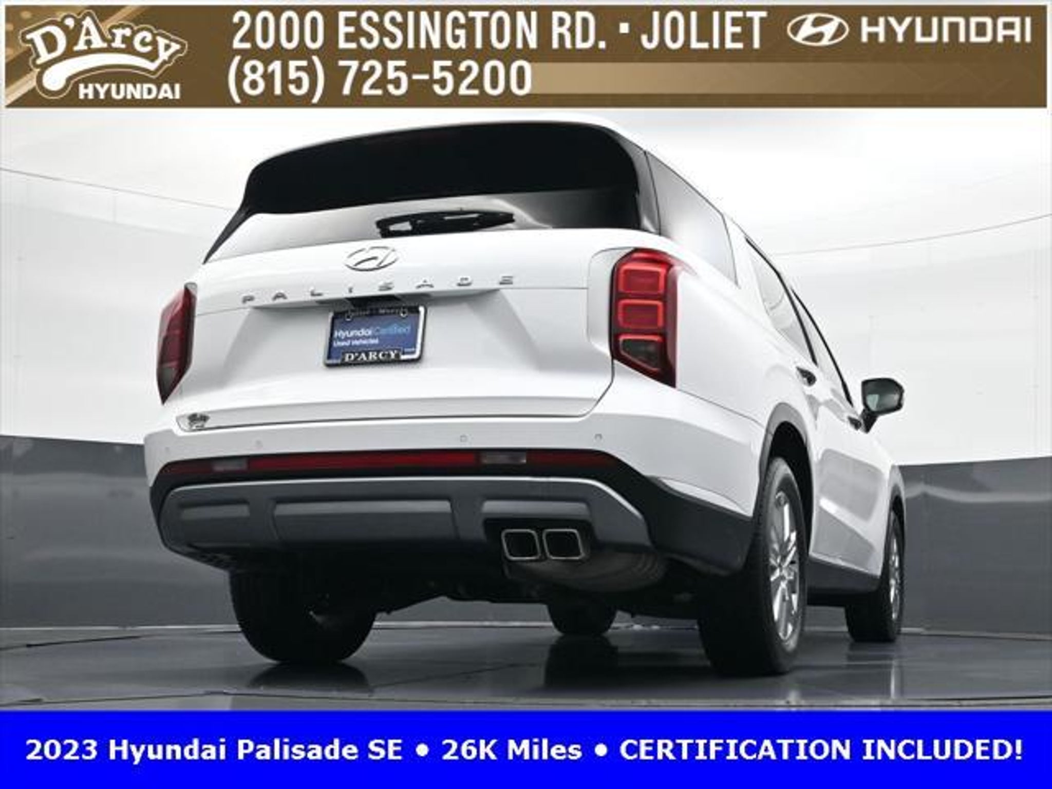 CARFAX One-Owner. ONE OWNER LOCAL TRADE!, LOW MILES!, GREAT VEHICLE HISTORY!, REMAINING FULL FACTORY WARRANTY!, BOUGHT HERE SERVICED HERE!, HYUNDAI CERTIFIED!, FULLY SERVICED AND READY TO GO!. Certified. Hyper White 2023 Hyundai Palisade SE FWD 8-Speed Automatic with SHIFTRONIC V6 Hyundai Certified Used Vehicles Details: * Includes 10-year/Unlimited Mileage Roadside Assistance with Rental Car and Trip Interruption Reimbursement; Please See Dealers for Specific Vehicle Eligibility Requirements. 10-Year/100,000 Mile Hybrid/EV Battery Warranty. 3-Months SiriusXM Trial Subscription. Complimentary 1 Year (Connected Care & Remote Pkgs). * 173 Point Inspection * Limited Warranty: 60 Month/60,000 Mile (whichever comes first) from original in-service date * Powertrain Limited Warranty: 120 Month/100,000 Mile (whichever comes first) from original in-service date * Roadside Assistance * Warranty Deductible: $50 * Vehicle History Discover the D'Arcy Difference! We care - we are here and we are ready to help! Stop by today to see up to date information, including showroom and service hours, and how to make an appointment or schedule delivery. D'Arcy Motors has been serving Joliet and its surrounding communities for over 25 years. Our business philosophy, which is to sell cars one car at a time and to make the guest the most important part of the process, has remained the same since 1991. Contact us today to experience the D'Arcy Difference! Pulse® Safer Braking Technology for $399 added to all New and CPO"“ The rear-end collision deterrent that rapidly pulses your third brake light four times before going solid when you press the brake pedal. This feature enhances safety by helping alert trailing drivers. Discover the D'Arcy Difference! We care - we are here and we are ready to help! Stop by today to see up to date information, including showroom and service hours, and how to make an appointment or schedule delivery. D'Arcy Motors has been serving Joliet and its surrounding communities for over 25 years. Our business philosophy, which is to sell cars one car at a time and to make the guest the most important part of the process, has remained the same since 1991. Contact us today to experience the D'Arcy Difference! Odometer is 31116 miles below market average! 19/27 City/Highway MPG This 2023 Hyundai Palisade comes equipped with: Option Group 01, 3.510 Axle Ratio, 3rd row seats: split-bench, 4-Wheel Disc Brakes, 6 Speakers, ABS brakes, Air Conditioning, Alloy wheels, AM/FM radio: SiriusXM, Apple CarPlay & Android Auto, Auto High-beam Headlights, Auto-dimming door mirrors, Auto-dimming Rear-View mirror, Brake assist, Bumpers: body-color, Cloth Seat Trim, Delay-off headlights, Driver door bin, Driver vanity mirror, Dual front impact airbags, Dual front side impact airbags, Electronic Stability Control, Emergency communication system: Blue Link Connected Car Service (3-year complimentary subscription), Exterior Parking Camera Rear, Four wheel independent suspension, Front anti-roll bar, Front Bucket Seats, Front Center Armrest, Front reading lights, Fully automatic headlights, Heated door mirrors, Illuminated entry, Knee airbag, Low tire pressure warning, Navigation System, Occupant sensing airbag, Outside temperature display, Overhead airbag, Overhead console, Panic alarm, Passenger door bin, Passenger vanity mirror, Power door mirrors, Power steering, Power windows, Radio data system, Radio: AM/FM/MP3 Audio System, Rear air conditioning, Rear anti-roll bar, Rear audio controls, Rear reading lights, Rear seat center armrest, Rear side impact airbag, Rear window defroster, Rear window wiper, Reclining 3rd row seat, Remote keyless entry, Security system, Speed control, Speed-sensing steering, Split folding rear seat, Spoiler, Steering wheel mounted audio controls, Tachometer, Telescoping steering wheel, Tilt steering wheel, Traction control, Trip computer, Turn signal indic