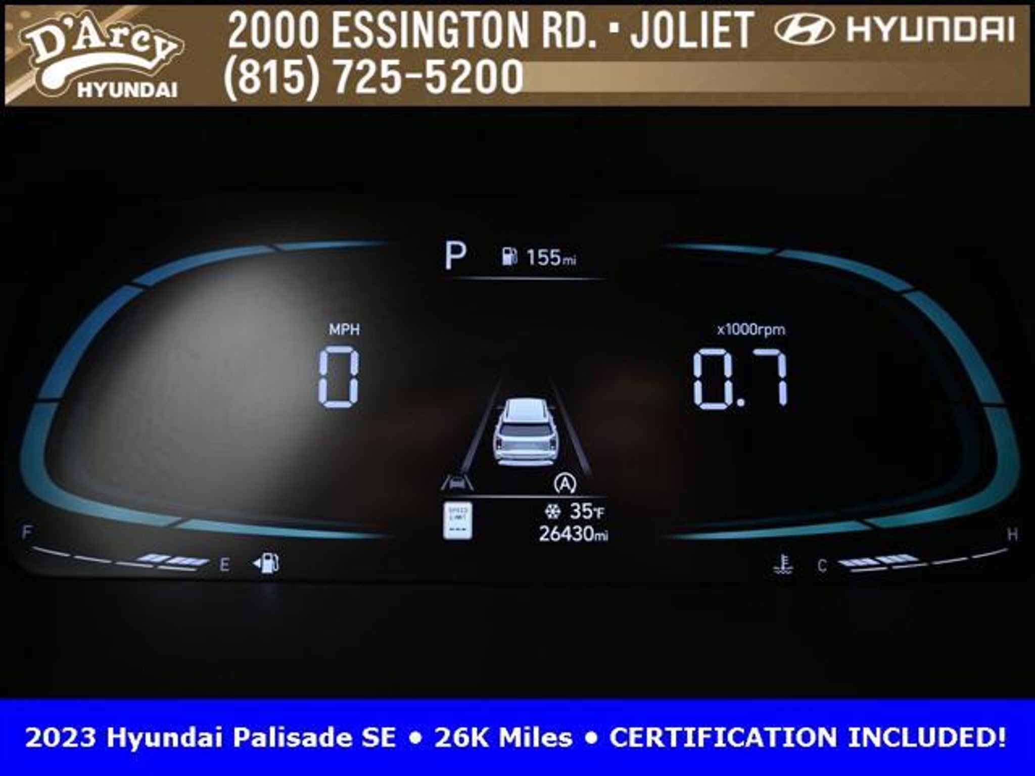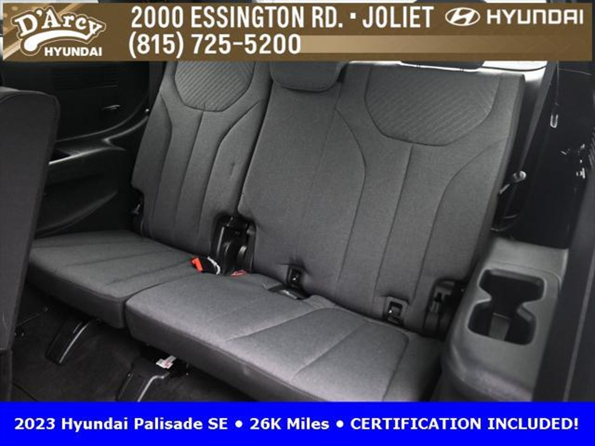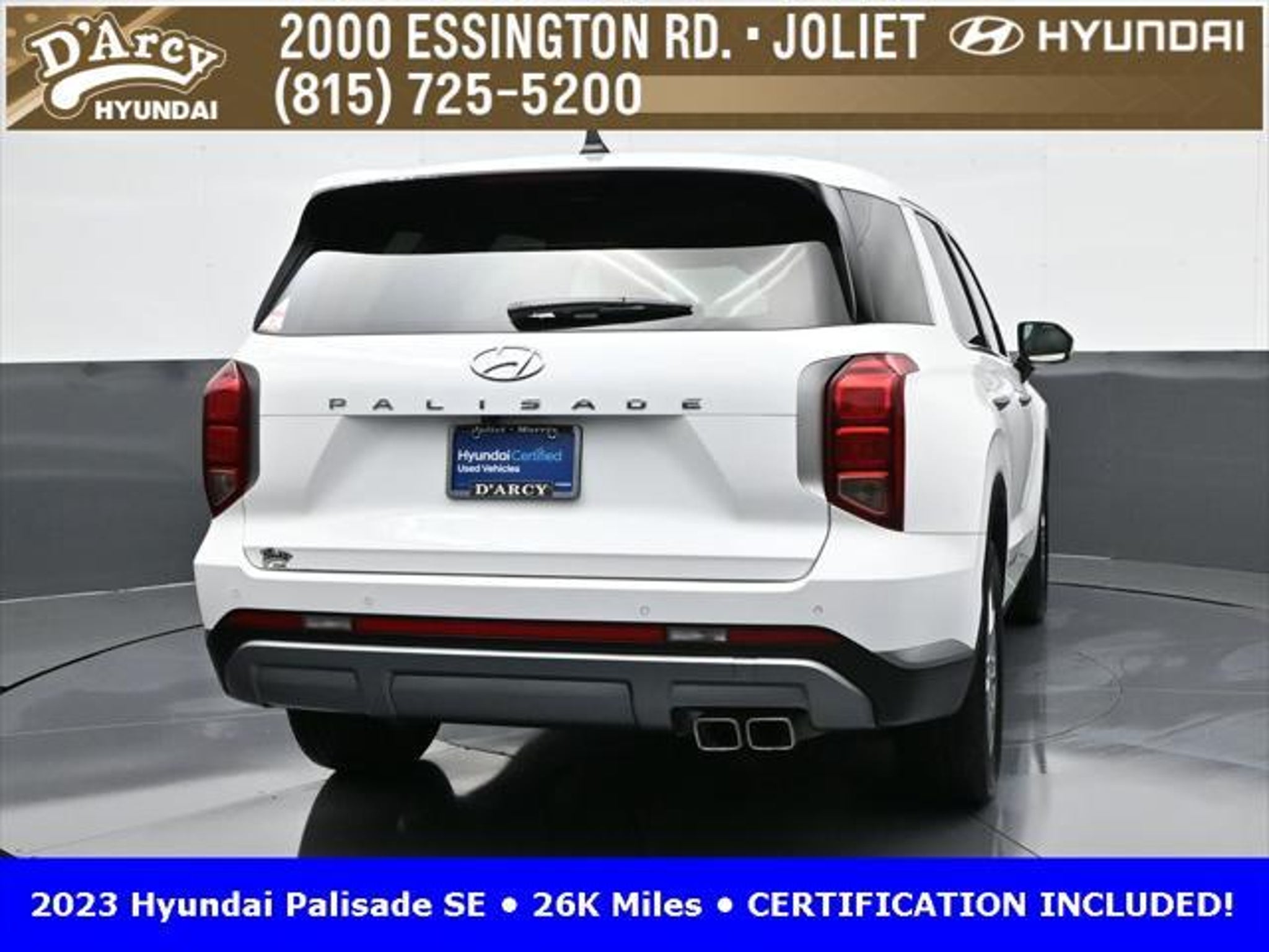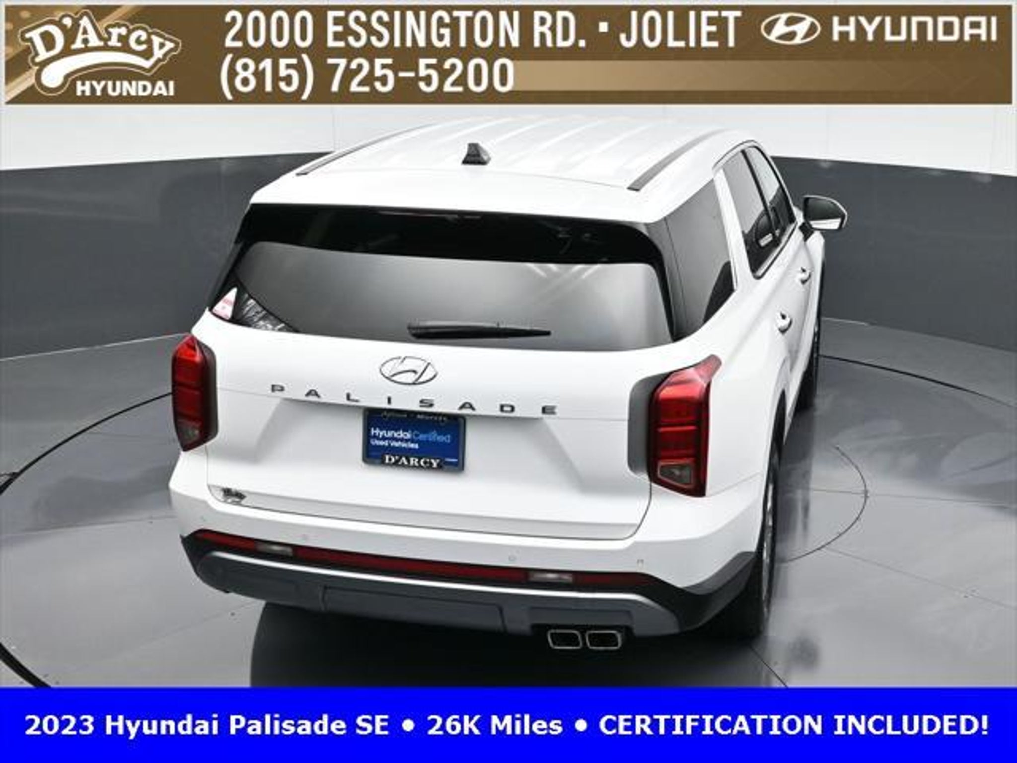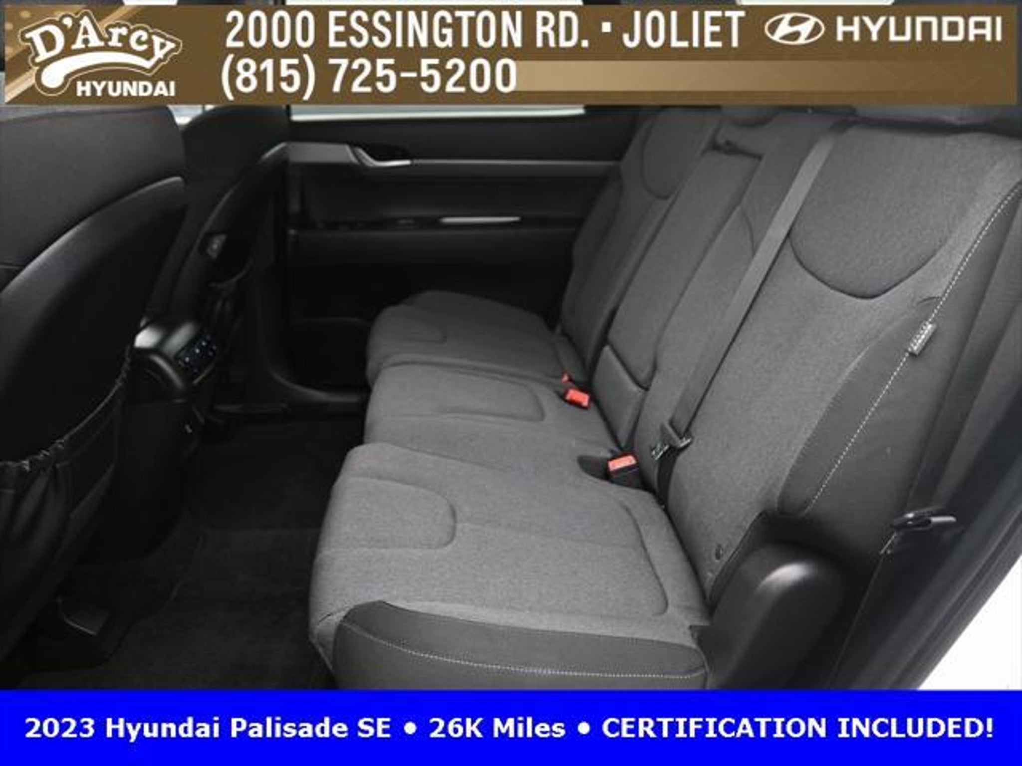 CARFAX One-Owner. ONE OWNER LOCAL TRADE!, LOW MILES!, GREAT VEHICLE HISTORY!, REMAINING FULL FACTORY WARRANTY!, BOUGHT HERE SERVICED HERE!, HYUNDAI CERTIFIED!, FULLY SERVICED AND READY TO GO!. Certified. Hyper White 2023 Hyundai Palisade SE FWD 8-Speed Automatic with SHIFTRONIC V6 Hyundai Certified Used Vehicles Details: * Includes 10-year/Unlimited Mileage Roadside Assistance with Rental Car and Trip Interruption Reimbursement; Please See Dealers for Specific Vehicle Eligibility Requirements. 10-Year/100,000 Mile Hybrid/EV Battery Warranty. 3-Months SiriusXM Trial Subscription. Complimentary 1 Year (Connected Care & Remote Pkgs). * 173 Point Inspection * Limited Warranty: 60 Month/60,000 Mile (whichever comes first) from original in-service date * Powertrain Limited Warranty: 120 Month/100,000 Mile (whichever comes first) from original in-service date * Roadside Assistance * Warranty Deductible: $50 * Vehicle History Discover the D'Arcy Difference! We care - we are here and we are ready to help! Stop by today to see up to date information, including showroom and service hours, and how to make an appointment or schedule delivery. D'Arcy Motors has been serving Joliet and its surrounding communities for over 25 years. Our business philosophy, which is to sell cars one car at a time and to make the guest the most important part of the process, has remained the same since 1991. Contact us today to experience the D'Arcy Difference! Pulse® Safer Braking Technology for $399 added to all New and CPO"“ The rear-end collision deterrent that rapidly pulses your third brake light four times before going solid when you press the brake pedal. This feature enhances safety by helping alert trailing drivers. Discover the D'Arcy Difference! We care - we are here and we are ready to help! Stop by today to see up to date information, including showroom and service hours, and how to make an appointment or schedule delivery. D'Arcy Motors has been serving Joliet and its surrounding communities for over 25 years. Our business philosophy, which is to sell cars one car at a time and to make the guest the most important part of the process, has remained the same since 1991. Contact us today to experience the D'Arcy Difference! Odometer is 31116 miles below market average! 19/27 City/Highway MPG This 2023 Hyundai Palisade comes equipped with: Option Group 01, 3.510 Axle Ratio, 3rd row seats: split-bench, 4-Wheel Disc Brakes, 6 Speakers, ABS brakes, Air Conditioning, Alloy wheels, AM/FM radio: SiriusXM, Apple CarPlay & Android Auto, Auto High-beam Headlights, Auto-dimming door mirrors, Auto-dimming Rear-View mirror, Brake assist, Bumpers: body-color, Cloth Seat Trim, Delay-off headlights, Driver door bin, Driver vanity mirror, Dual front impact airbags, Dual front side impact airbags, Electronic Stability Control, Emergency communication system: Blue Link Connected Car Service (3-year complimentary subscription), Exterior Parking Camera Rear, Four wheel independent suspension, Front anti-roll bar, Front Bucket Seats, Front Center Armrest, Front reading lights, Fully automatic headlights, Heated door mirrors, Illuminated entry, Knee airbag, Low tire pressure warning, Navigation System, Occupant sensing airbag, Outside temperature display, Overhead airbag, Overhead console, Panic alarm, Passenger door bin, Passenger vanity mirror, Power door mirrors, Power steering, Power windows, Radio data system, Radio: AM/FM/MP3 Audio System, Rear air conditioning, Rear anti-roll bar, Rear audio controls, Rear reading lights, Rear seat center armrest, Rear side impact airbag, Rear window defroster, Rear window wiper, Reclining 3rd row seat, Remote keyless entry, Security system, Speed control, Speed-sensing steering, Split folding rear seat, Spoiler, Steering wheel mounted audio controls, Tachometer, Telescoping steering wheel, Tilt steering wheel, Traction control, Trip computer, Turn signal indic