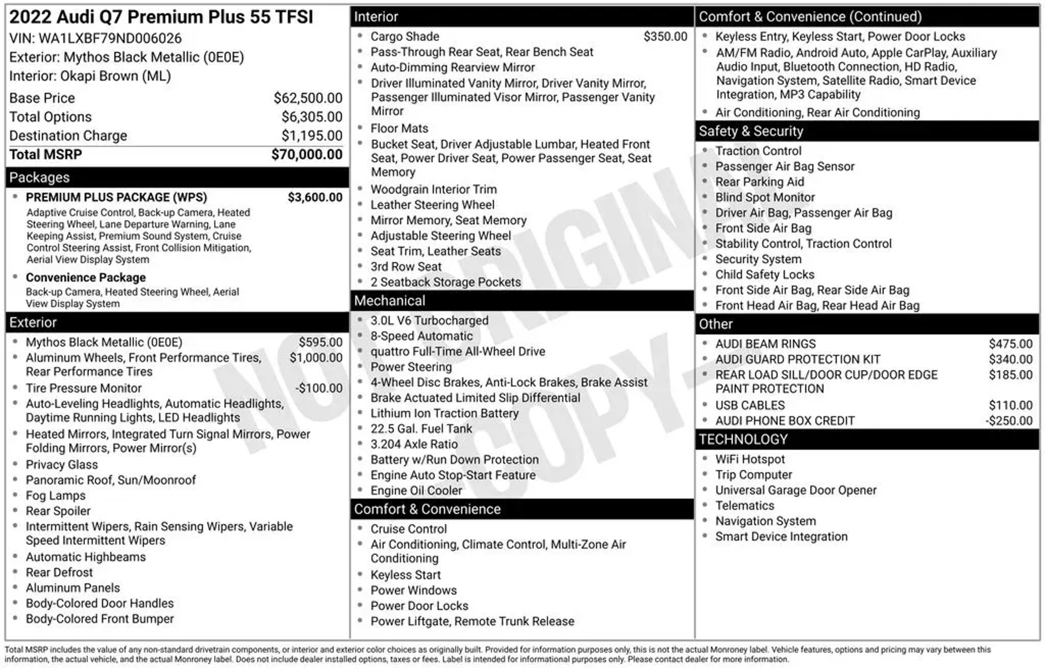 Now Available: Affordable Pre-Owned Black Metallic 2022 Audi Q7 NEW TIRES--55 Premium Plus w/Tow Hitch & 21 Wheel with 51927 miles at Rapids Honda! This well-equipped used 2022 Audi Q7 NEW TIRES--55 Premium Plus w/Tow Hitch & 21 Wheel offers AWD traction, a 3.0L TFSI engine with 8-Speed Automatic with Tiptronic, and fuel efficiency rated at 18 MPG city / 23 MPG highway / 20 MPG combined. Standout features include ABS brakes, Alloy wheels, Compass, Electronic Stability Control, Front dual zone A/C, Heated door mirrors, Heated Front Bucket Seats, Heated front seats, Illuminated entry, Low tire pressure warning, Power Liftgate, Remote keyless entry, and Traction control making it ready for its next adventure. Vehicles are inspected, detailed, and come with a vehicle history report. Available on select pre-owned vehicles at Rapids Honda (see salesperson for details and eligibility requirements), The Rapids Advantage includes a 6-month/6,000-mile Powertrain Warranty covering the engine, EV battery, transmission, and drivetrain, plus $200 deductible protection. You'll also receive Lifetime Car Washes, Lifetime Windshield Repellency, Lifetime Shuttle Service, and Auto Butler Environmental Protection, giving you lasting value beyond your purchase. Visit us at 1950 Gateway Dr NW off Hwy 10 & Hanson Blvd in Coon Rapids, MN, or call us at . Open Monday-Saturday.
