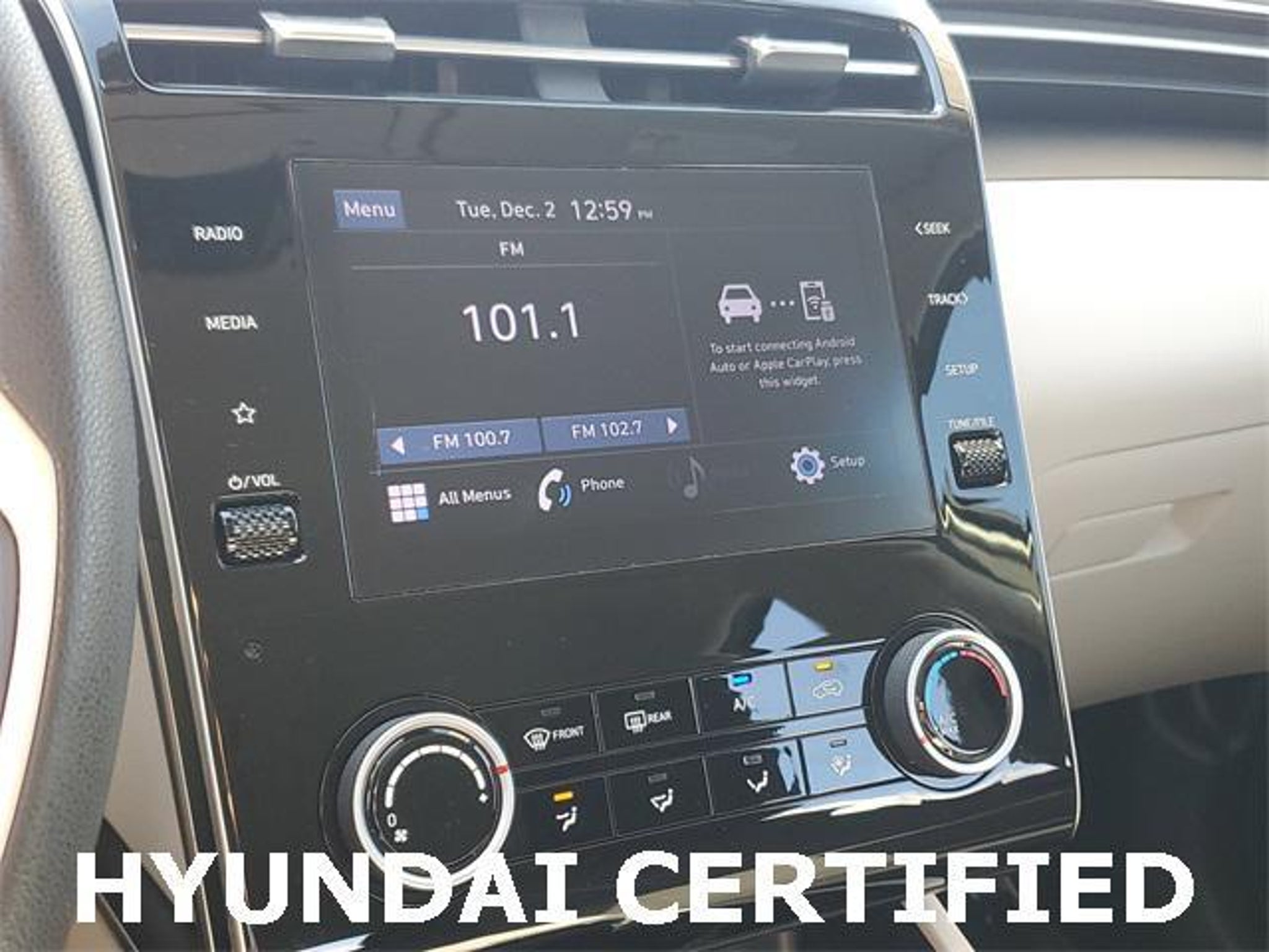 HYUNDAI CERTIFIED! ! ! 2022 HYUNDAI TUCSON SE * Includes 10-year/Unlimited Mileage Roadside Assistance with Rental Car and Trip Interruption Reimbursement; Please See Dealers for Specific Vehicle Eligibility Requirements. 10-Year/100,000 Mile Hybrid/EV Battery Warranty. 3-Months SiriusXM Trial Subscription. Complimentary 1 Year (Connected Care & Remote Pkgs). * 173 Point Inspection * Limited Warranty: 60 Month/60,000 Mile (whichever comes first) from original in-service date * Powertrain Limited Warranty: 120 Month/100,000 Mile (whichever comes first) from original in-service date * Roadside Assistance * Vehicle History 2022 Hyundai Tucson SE Apple CarPlay & Android Auto, Fully automatic headlights, Option Group 01, Outside temperature display, Radio: AM/FM/HD Audio System, Rear window wiper, Split folding rear seat, Stain & Odor Resistant Cloth Seat Trim, Steering wheel mounted audio controls, Telescoping steering wheel, Tilt steering wheel, Variably intermittent wipers, Wheels: 17 x 7.0J Alloy.