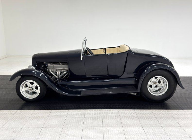 Two stage Midnight Blue coats this roadster and we're talking deep paint here and in certain light, it can look black while other light brings out the navy blue and it's nicely applied. Once you've absorbed the beauty of the paint, the wheel set up is next to compete for your attention, stacking 15-inch Weld wheels with vastly different widths and tires sizes, creating that classic hot rod stance that's been a proven winner for about 80 years, here under fiberglass fenders connected by a steel running board. In back, the rectangular quartet of tail lights get your attention right before the massive meats grab your eyes as they peek from narrow fenders. Up front, the fiberglass '32 radiator shell looks perfectly at home next to the aluminum hood which connects seamlessly to the fiberglass body. A modest windscreen with nicely sculpted posts completes the exterior which shows no glaring imperfections.