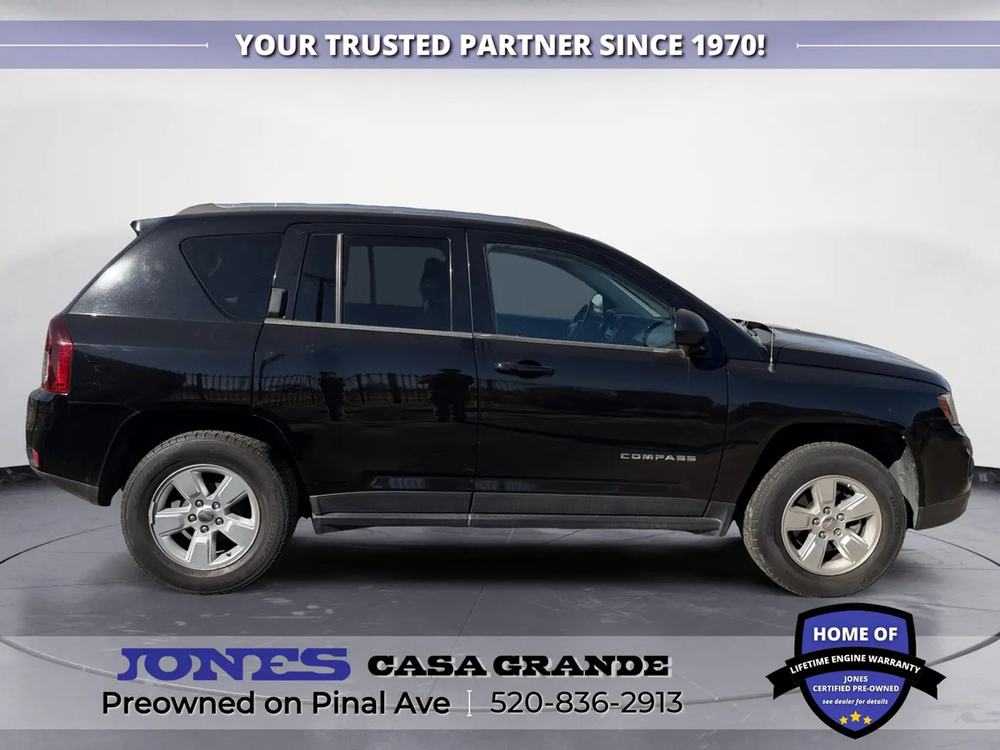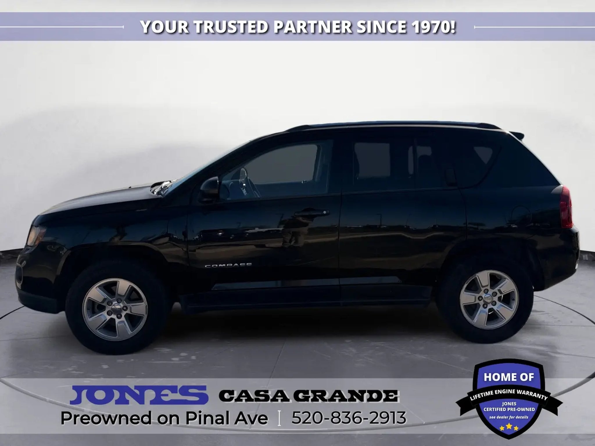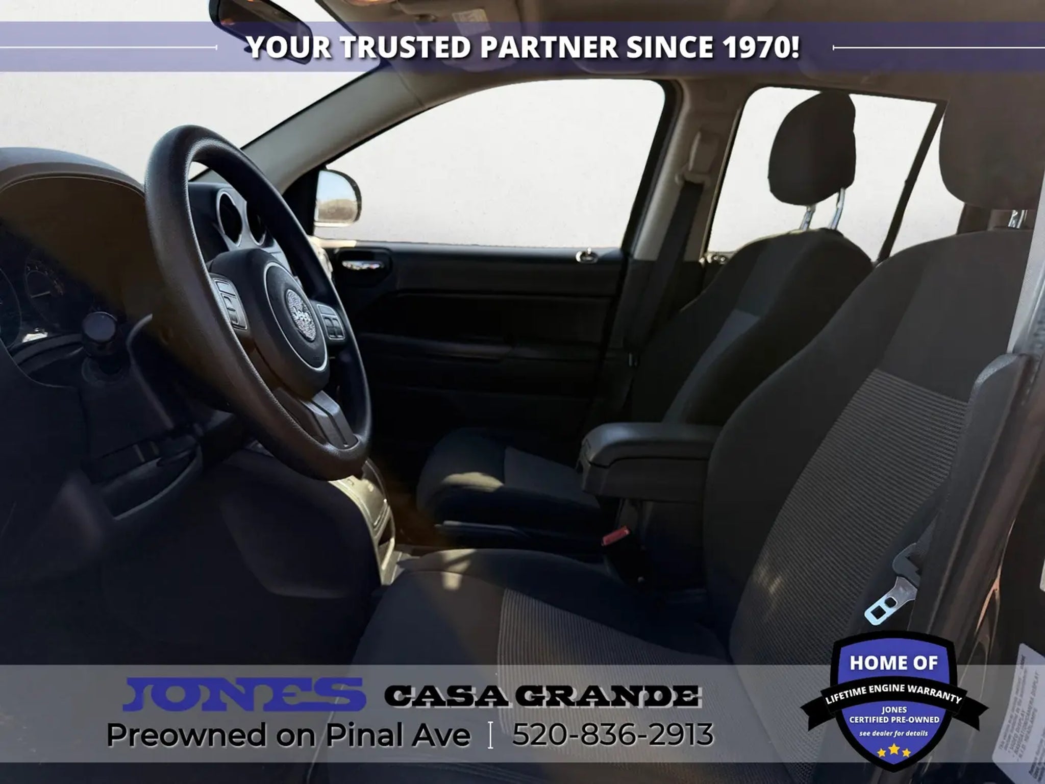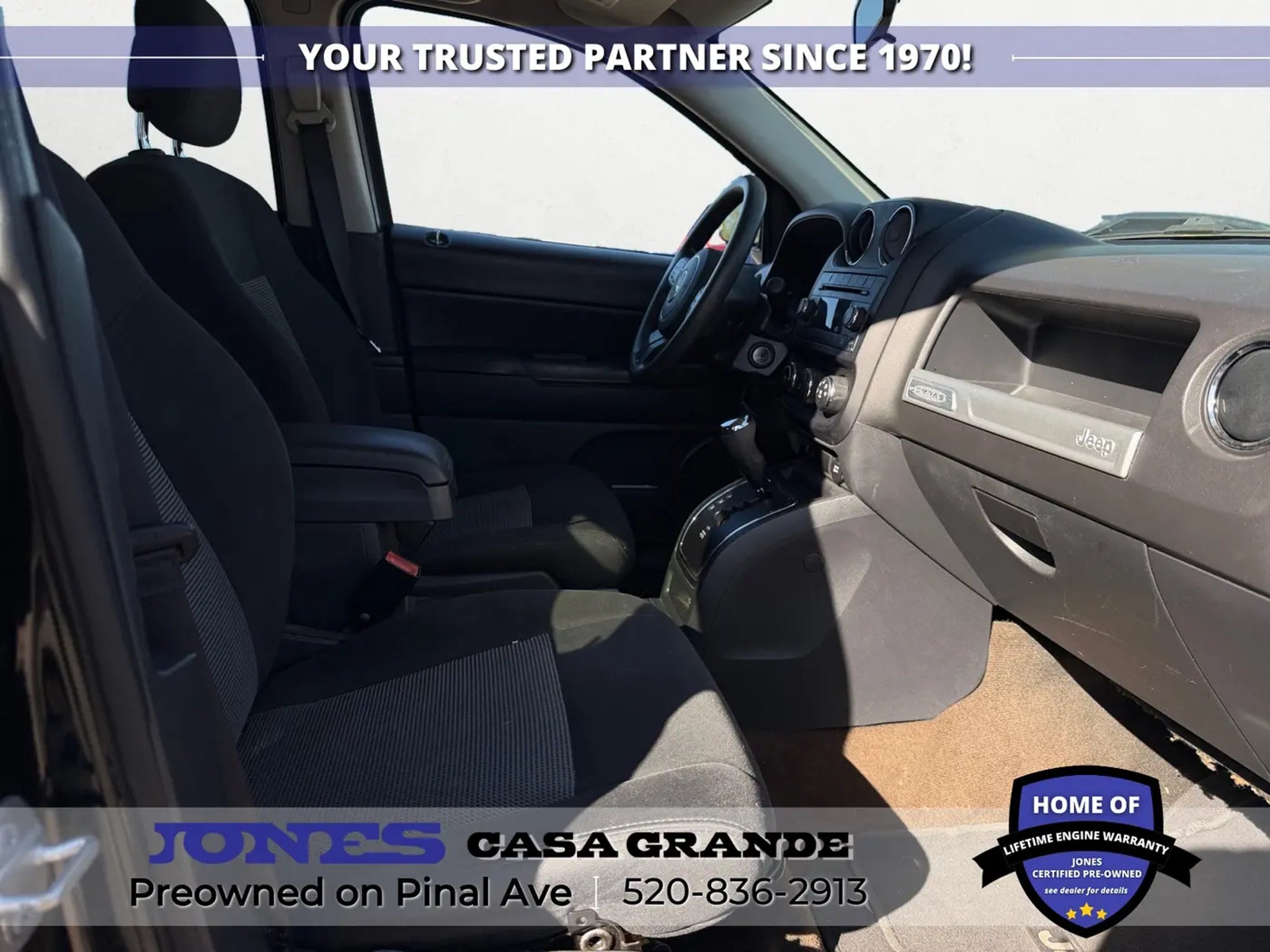 520-836-2913 LOCATED AT 1932 N PINAL AVE CASA GRANDE AZ 85122 Compass Sport, 2.0L I4 DOHC 16V Dual VVT, FWD, Body Color Door Handles, Body Color Liftgate Applique, Illuminated Entry, Keyless Entry, Power Heated Fold-Away Mirrors, Power Value Group, Power Windows w/Driver One-Touch, Speed Sensitive Power Locks. 22/27 City/Highway MPG Odometer is 12861 miles below market average! Jones Ford Buick GMC is Family Owned & Operated and has been doing Business the old fashion way one deal at a time since 1970! ALL our vehicles leave with a FULL TANK of fuel, car wash, PLUS most of our Pre-owned vehicles come with our LIFETIME ENGINE PROTECTION at NO ADDITIONAL COST! ! Save Thousands on any of our New Ford, Buick, or GMC's and give us a try today! Jones Ford Buick GMC 520-836-2913 LOCATED AT 1932 N PINAL AVE CASA GRANDE AZ 85122